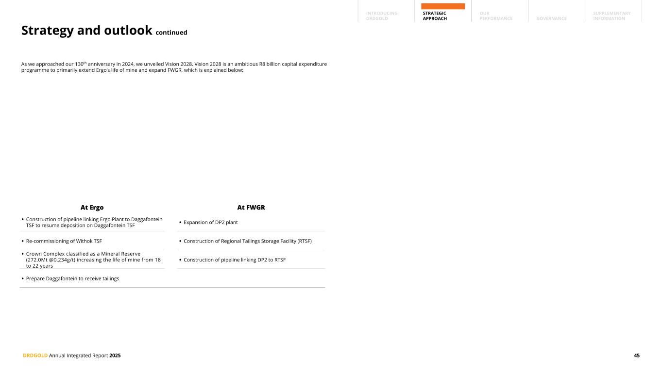 As we approached our 130th anniversary in 2024, we unveiled Vision 2028. Vision 2028 is an ambitious R8 billion capital expenditure programme to primarily extend Ergo’s life of mine and expand FWGR, which is explained below: INTRODUCING DRDGOLD STRATEGIC APPROACH OUR PERFORMANCE GOVERNANCE SUPPLEMENTARY INFORMATION Strategy and outlook continued DRDGOLD Annual Integrated Report 2025 45 At Ergo At FWGR • Construction of pipeline linking Ergo Plant to Daggafontein TSF to resume deposition on Daggafontein TSF • Expansion of DP2 plant • Re-commissioning of Withok TSF • Construction of Regional Tailings Storage Facility (RTSF) • Crown Complex classified as a Mineral Reserve (272.0Mt @0.234g/t) increasing the life of mine from 18 to 22 years • Construction of pipeline linking DP2 to RTSF • Prepare Daggafontein to receive tailings Large capital Investment in various projects at Ergo and FWGR largely funded internally over the next three years