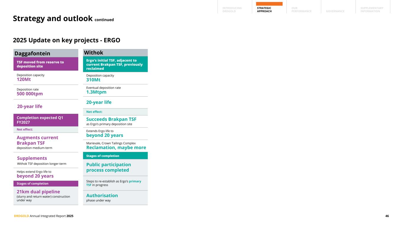 ERGO operations Production Gold production at Ergo was 5% lower from 3 639kg to 3 473kg, reflecting a 21% decrease in yield from 0.226g/t to 0.178g/t. Throughput rose by 21% from 16.1Mt in FY2024 to 19.5Mt in FY2025. The lower yield reflects both depletion of higher-grade material from clean-up activities at Ergo’s completed reclamation sites and a build-up in tonnage from new, lower- grade reclamation sites. Higher throughput resulted from a year unaffected by delays in the commissioning of new reclamation sites and community-related disruptions that characterised FY2024. The yield and throughput movements point to Ergo’s shift in profile proceeding as a high-throughput/ low-yield operation. The ball mills make a relatively high-grade material contribution to the Ergo plant and allow for systematic reclamation and treatment of previously untreatable coarse sand material through the plant. The reclamation of these remnant sites makes a significant contribution to the rehabilitation efforts in the Benoni Cluster area and the project is expected to continue for at least another three to four years. Remnant sand resources in the old Crown Mines and City Deep areas are targeted with a view to final land clearance and rehabilitation of a number of legacy reclamation areas. In addition to the final clearance of the land, a significant contribution to the operational profitability of the City Deep section has been realised. Tailings storage facility (TSF) The safety of any dam (including a TSF) that is classified in terms of Dam Safety Regulations under the National Water Act 36 of 1998 as a dam with a safety risk, is overseen by the Dam Safety Office (DSO) of the Department of Water and Sanitation (DWS).Both the Brakpan and Daggafontein TSFs are classified category III, "Large" dams with High hazard potential under the National Water Act 36 of 1998. This classification the owner to meet strict standards for design, operation and maintenance and safety, including submitting a five-yearly Dam Safety Evaluation (DSE) prepared by an independent Approved Professional Person (APP), and an accompanying implementation programme (form DW19E). Ergo has fulfilled these obligations with DSE reports submitted in 2013, 2018 and 2021, incorporating necessary design amendments aligned with its deposition plans.The APP for the Daggafontein TSF submitted the DSE and form DW19E to the DSO on 6 October 2025. On 2 October 2025, the DSO approved Ergo’s newly appointed APP for the Brakpan TSF to conduct its DSE and submit a form DW19. The DSO retains the discretion to reject any APP recommendations and may impose additional conditions or restrictions on the facility’s operation. The Brakpan TSF is a mature facility and approaching its final phase as a mega-volume tailings storage facility. In light of Ergo's future production plans, Ergo has commenced with the process of recommissioning the adjacent Withok TSF, to create additional 310Mt of deposition capacity and a life of 20 years at an eventual deposition rate of 1.3Mtpm. The requisite public participation process has been completed, and the project is in its authorisation phase. Commissioning is planned to occur within the next three to four years. Ergo plans to maintain its current deposition rate of 1.65Mt per month for another three to four more years before moving onto the adjacent Withok TSF. The regulatory process to recommission Withok is complex and the regulator may not approve all aspects of the envisaged design. The footprint and location of the facility also make for a challenging construction process, and thus may result in target dates not being met, and planned throughput rates not being achieved.Each operation closely monitors the geo-technical integrity of its TSFs against defined parameters, with any deterioration potentially leading to reduced or suspended throughput. Capital projects Ergo’s capital spend was R605.6 million. The majority of the spending relates to the projects underway for the expansion of deposition capacity. Work to resume the Daggafontein TSF, as depositional capacity, is currently underway. The TSF is expected to have a deposition capacity of 120Mt and a life of 20 years, at a deposition rate of 500 000tpm. Resumption is expected to be completed in the first quarter of FY2027. Construction of the 21km dual pipeline (tailings and return water) linking Ergo's Brakpan plant with the TSF is well advanced and on schedule for completion in time for the commissioning of the Daggafontein TSF. Additional deposition capacity for Ergo creates an extraordinary new vision of the future “face” of the vast area of land currently occupied by the three mine dumps comprising the Crown Complex, located immediately to the southeast of Johannesburg’s Central Business District around Nasrec. We plan to reclaim these dumps and retreat them through Ergo, creating what is referred to as a “corridor of freedom”, hundreds of hectares of previously sterilised land cleared for redevelopment, linking Johannesburg with Soweto. This will result in a solution to the significant environmental burden in terms of dust and water management. FWGR operations Production Gold production at FWGR was stable at 1 357kg, a consequence of both throughput and yield remaining virtually unchanged, the former at 6.1Mt and the latter at 0.222g/t. This steady-state performance was in line with current plant and deposition capacity, pending completion of the capital projects (expansion of the DP2 plant, the new pipelines, and the RTSF). Tailings storage facility (TSF) The Driefontein 4 TSF is an upstream cyclone depositioning TSF at a capacity of 500kt per month. Towards the end of calendar year 2026, the depositioning is scheduled to reduce as this TSF is reaching the final stages of its operating life. The construction of the RTSF is progressing well, notwithstanding some delays due to the weather. With a total deposition capacity of 800Mt at an eventua
