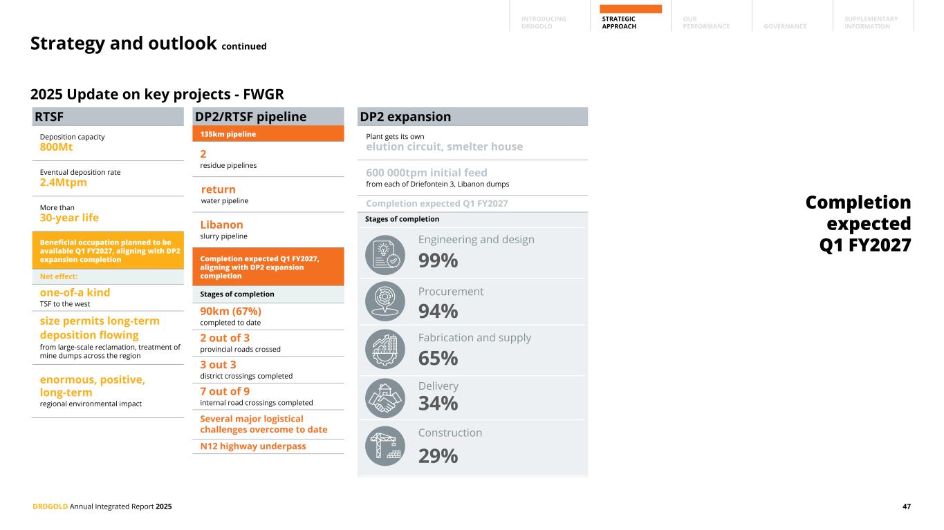 2025 Update on key projects - FWGR INTRODUCING DRDGOLD STRATEGIC APPROACH OUR PERFORMANCE GOVERNANCE SUPPLEMENTARY INFORMATION Strategy and outlook continued DRDGOLD Annual Integrated Report 2025 47 DP2 expansion Plant gets its own elution circuit, smelter house 600 000tpm initial feed from each of Driefontein 3, Libanon dumps Completion expected Q1 FY2027 Stages of completion RTSF Deposition capacity 800Mt Eventual deposition rate 2.4Mtpm More than 30-year life Beneficial occupation planned to be available Q1 FY2027, aligning with DP2 expansion completion Net effect: one-of-a kind TSF to the west size permits long-term deposition flowing from large-scale reclamation, treatment of mine dumps across the region enormous, positive, long-term regional environmental impact DP2/RTSF pipeline 135km pipeline 2 residue pipelines return water pipeline Libanon slurry pipeline Completion expected Q1 FY2027, aligning with DP2 expansion completion Stages of completion 90km (67%) completed to date 2 out of 3 provincial roads crossed 3 out 3 district crossings completed 7 out of 9 internal road crossings completed Several major logistical challenges overcome to date N12 highway underpass Engineering and design 99% Procurement 94% Fabrication and supply 65% Delivery 34% Construction 29% Completion expected Q1 FY2027