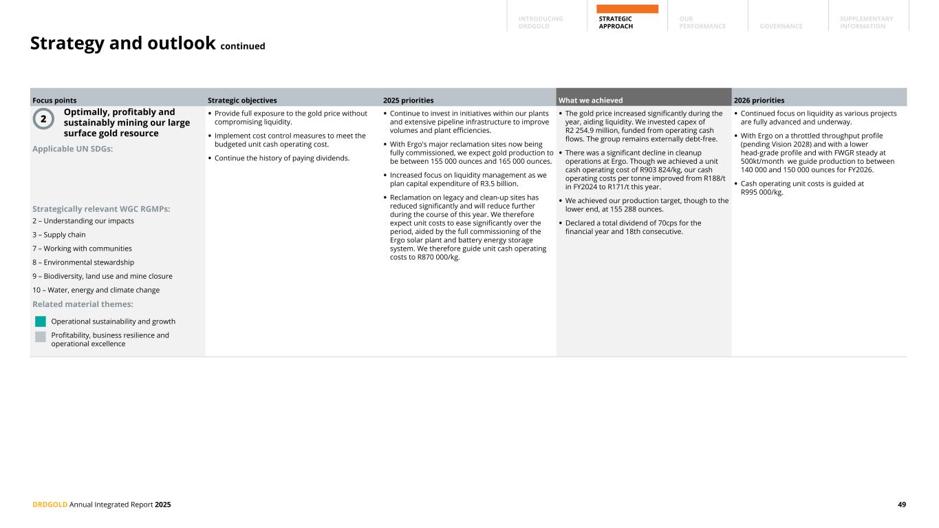 Focus points Strategic objectives 2025 priorities What we achieved 2026 priorities Optimally, profitably and sustainably mining our large surface gold resource Applicable UN SDGs: Strategically relevant WGC RGMPs: 2 – Understanding our impacts 3 – Supply chain 7 – Working with communities 8 – Environmental stewardship 9 – Biodiversity, land use and mine closure 10 – Water, energy and climate change Related material themes: Operational sustainability and growth Profitability, business resilience and operational excellence • Provide full exposure to the gold price without compromising liquidity. • Implement cost control measures to meet the budgeted unit cash operating cost. • Continue the history of paying dividends. • Continue to invest in initiatives within our plants and extensive pipeline infrastructure to improve volumes and plant efficiencies. • With Ergo's major reclamation sites now being fully commissioned, we expect gold production to be between 155 000 ounces and 165 000 ounces. • Increased focus on liquidity management as we plan capital expenditure of R3.5 billion. • Reclamation on legacy and clean-up sites has reduced significantly and will reduce further during the course of this year. We therefore expect unit costs to ease significantly over the period, aided by the full commissioning of the Ergo solar plant and battery energy storage system. We therefore guide unit cash operating costs to R870 000/kg. • The gold price increased significantly during the year, aiding liquidity. We invested capex of R2 254.9 million, funded from operating cash flows. The group remains externally debt-free. • There was a significant decline in cleanup operations at Ergo. Though we achieved a unit cash operating cost of R903 824/kg, our cash operating costs per tonne improved from R188/t in FY2024 to R171/t this year. • We achieved our production target, though to the lower end, at 155 288 ounces. • Declared a total dividend of 70cps for the financial year and 18th consecutive. • Continued focus on liquidity as various projects are fully advanced and underway. • With Ergo on a throttled throughput profile (pending Vision 2028) and with a lower head-grade profile and with FWGR steady at 500kt/month we guide production to between 140 000 and 150 000 ounces for FY2026. • Cash operating unit costs is guided at R995 000/kg. INTRODUCING DRDGOLD STRATEGIC APPROACH OUR PERFORMANCE GOVERNANCE SUPPLEMENTARY INFORMATION Strategy and outlook continued DRDGOLD Annual Integrated Report 2025 49 2