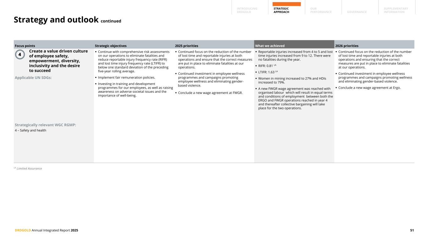 Focus points Strategic objectives 2025 priorities What we achieved 2026 priorities Create a value driven culture of employee safety, empowerment, diversity, inclusivity and the desire to succeed Applicable UN SDGs: Strategically relevant WGC RGMP: 4 – Safety and health • Continue with comprehensive risk assessments on our operations to eliminate fatalities and reduce reportable injury frequency rate (RIFR) and lost time injury frequency rate (LTIFR) to below one standard deviation of the preceding five-year rolling average. • Implement fair remuneration policies. • Investing in training and development programmes for our employees, as well as raising awareness on adverse societal issues and the importance of well-being. • Continued focus on the reduction of the number of lost time and reportable injuries at both operations and ensure that the correct measures are put in place to eliminate fatalities at our operations. • Continued investment in employee wellness programmes and campaigns promoting employee wellness and eliminating gender- based violence. • Conclude a new wage agreement at FWGR. • Reportable injuries increased from 4 to 5 and lost time injuries increased from 9 to 12. There were no fatalities during the year. • RIFR: 0.81 LA • LTIFR: 1.63 LA • Women in mining increased to 27% and HDIs increased to 79%. • A new FWGR wage agreement was reached with organised labour which will result in equal terms and conditions of employment between both the ERGO and FWGR operations reached in year 4 and thereafter collective bargaining will take place for the two operations. • Continued focus on the reduction of the number of lost time and reportable injuries at both operations and ensuring that the correct measures are put in place to eliminate fatalities at our operations. • Continued investment in employee wellness programmes and campaigns promoting wellness and eliminating gender-based violence. • Conclude a new wage agreement at Ergo. LA Limited Assurance INTRODUCING DRDGOLD STRATEGIC APPROACH OUR PERFORMANCE GOVERNANCE SUPPLEMENTARY INFORMATION Strategy and outlook continued DRDGOLD Annual Integrated Report 2025 51 4