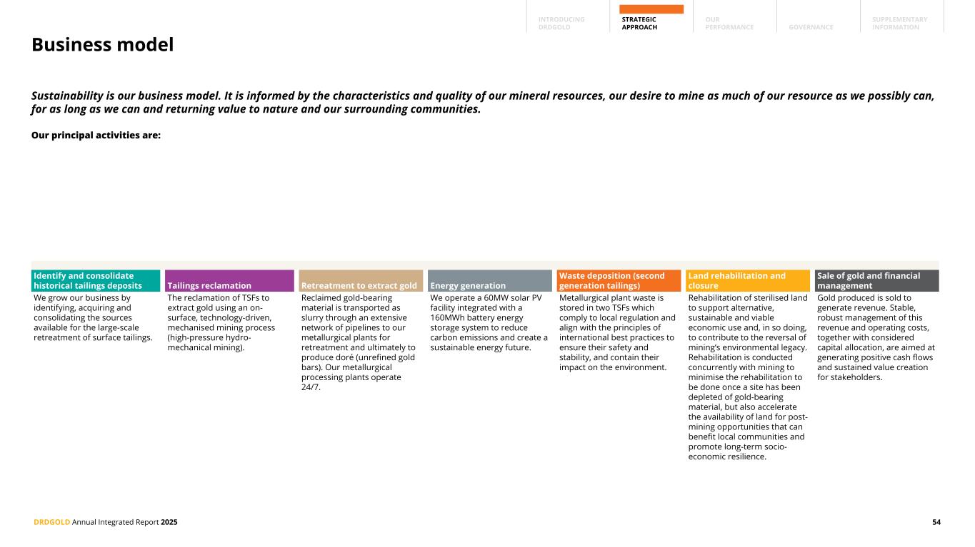 Sustainability is our business model. It is informed by the characteristics and quality of our mineral resources, our desire to mine as much of our resource as we possibly can, for as long as we can and returning value to nature and our surrounding communities. Our principal activities are: Identify and consolidate historical tailings deposits Tailings reclamation Retreatment to extract gold Energy generation Waste deposition (second generation tailings) Land rehabilitation and closure Sale of gold and financial management We grow our business by identifying, acquiring and consolidating the sources available for the large-scale retreatment of surface tailings. The reclamation of TSFs to extract gold using an on- surface, technology-driven, mechanised mining process (high-pressure hydro- mechanical mining). Reclaimed gold-bearing material is transported as slurry through an extensive network of pipelines to our metallurgical plants for retreatment and ultimately to produce doré (unrefined gold bars). Our metallurgical processing plants operate 24/7. We operate a 60MW solar PV facility integrated with a 160MWh battery energy storage system to reduce carbon emissions and create a sustainable energy future. Metallurgical plant waste is stored in two TSFs which comply to local regulation and align with the principles of international best practices to ensure their safety and stability, and contain their impact on the environment. Rehabilitation of sterilised land to support alternative, sustainable and viable economic use and, in so doing, to contribute to the reversal of mining’s environmental legacy. Rehabilitation is conducted concurrently with mining to minimise the rehabilitation to be done once a site has been depleted of gold-bearing material, but also accelerate the availability of land for post- mining opportunities that can benefit local communities and promote long-term socio- economic resilience. Gold produced is sold to generate revenue. Stable, robust management of this revenue and operating costs, together with considered capital allocation, are aimed at generating positive cash flows and sustained value creation for stakeholders. INTRODUCING DRDGOLD STRATEGIC APPROACH OUR PERFORMANCE GOVERNANCE SUPPLEMENTARY INFORMATION Business model DRDGOLD Annual Integrated Report 2025 54