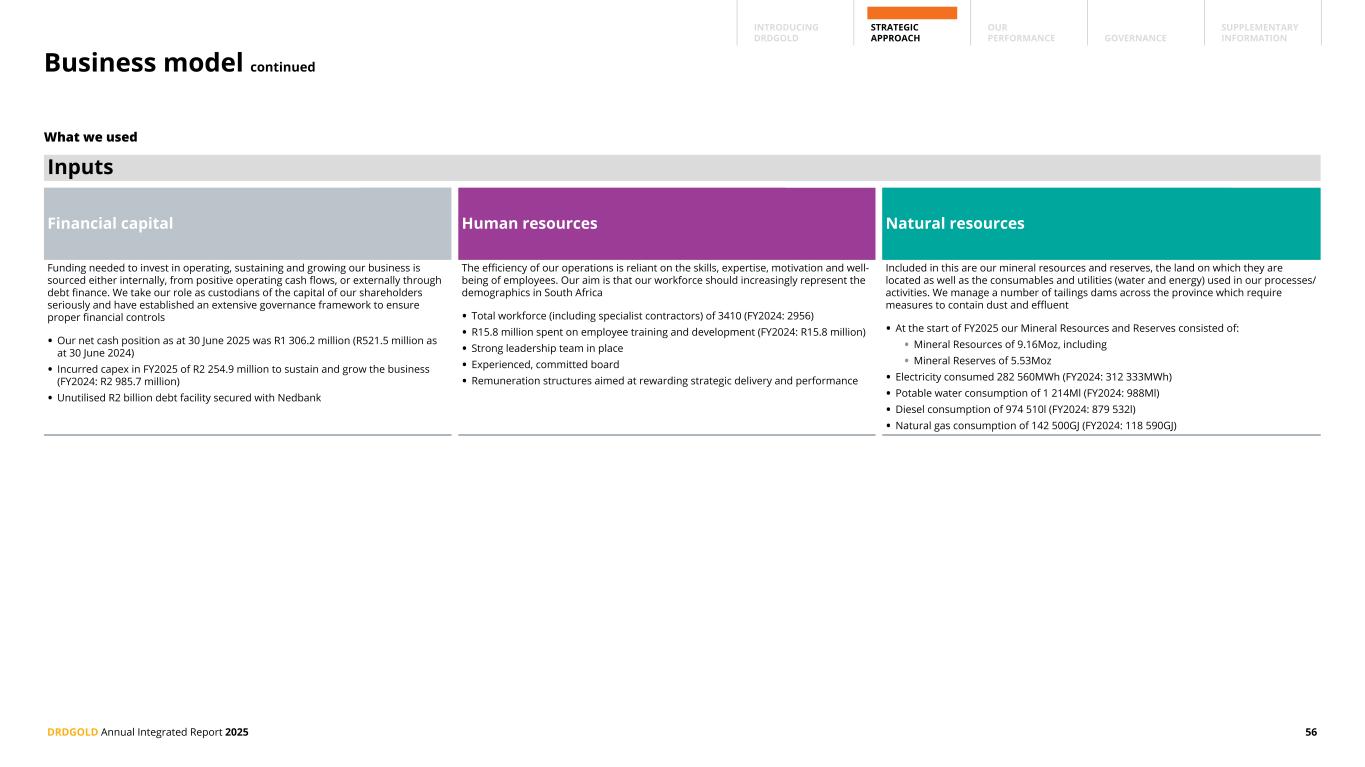 What we used Inputs Financial capital Human resources Natural resources Funding needed to invest in operating, sustaining and growing our business is sourced either internally, from positive operating cash flows, or externally through debt finance. We take our role as custodians of the capital of our shareholders seriously and have established an extensive governance framework to ensure proper financial controls • Our net cash position as at 30 June 2025 was R1 306.2 million (R521.5 million as at 30 June 2024) • Incurred capex in FY2025 of R2 254.9 million to sustain and grow the business (FY2024: R2 985.7 million) • Unutilised R2 billion debt facility secured with Nedbank The efficiency of our operations is reliant on the skills, expertise, motivation and well- being of employees. Our aim is that our workforce should increasingly represent the demographics in South Africa • Total workforce (including specialist contractors) of 3410 (FY2024: 2956) • R15.8 million spent on employee training and development (FY2024: R15.8 million) • Strong leadership team in place • Experienced, committed board • Remuneration structures aimed at rewarding strategic delivery and performance Included in this are our mineral resources and reserves, the land on which they are located as well as the consumables and utilities (water and energy) used in our processes/ activities. We manage a number of tailings dams across the province which require measures to contain dust and effluent • At the start of FY2025 our Mineral Resources and Reserves consisted of: • Mineral Resources of 9.16Moz, including • Mineral Reserves of 5.53Moz • Electricity consumed 282 560MWh (FY2024: 312 333MWh) • Potable water consumption of 1 214Ml (FY2024: 988Ml) • Diesel consumption of 974 510l (FY2024: 879 532l) • Natural gas consumption of 142 500GJ (FY2024: 118 590GJ) INTRODUCING DRDGOLD STRATEGIC APPROACH OUR PERFORMANCE GOVERNANCE SUPPLEMENTARY INFORMATION Business model continued DRDGOLD Annual Integrated Report 2025 56