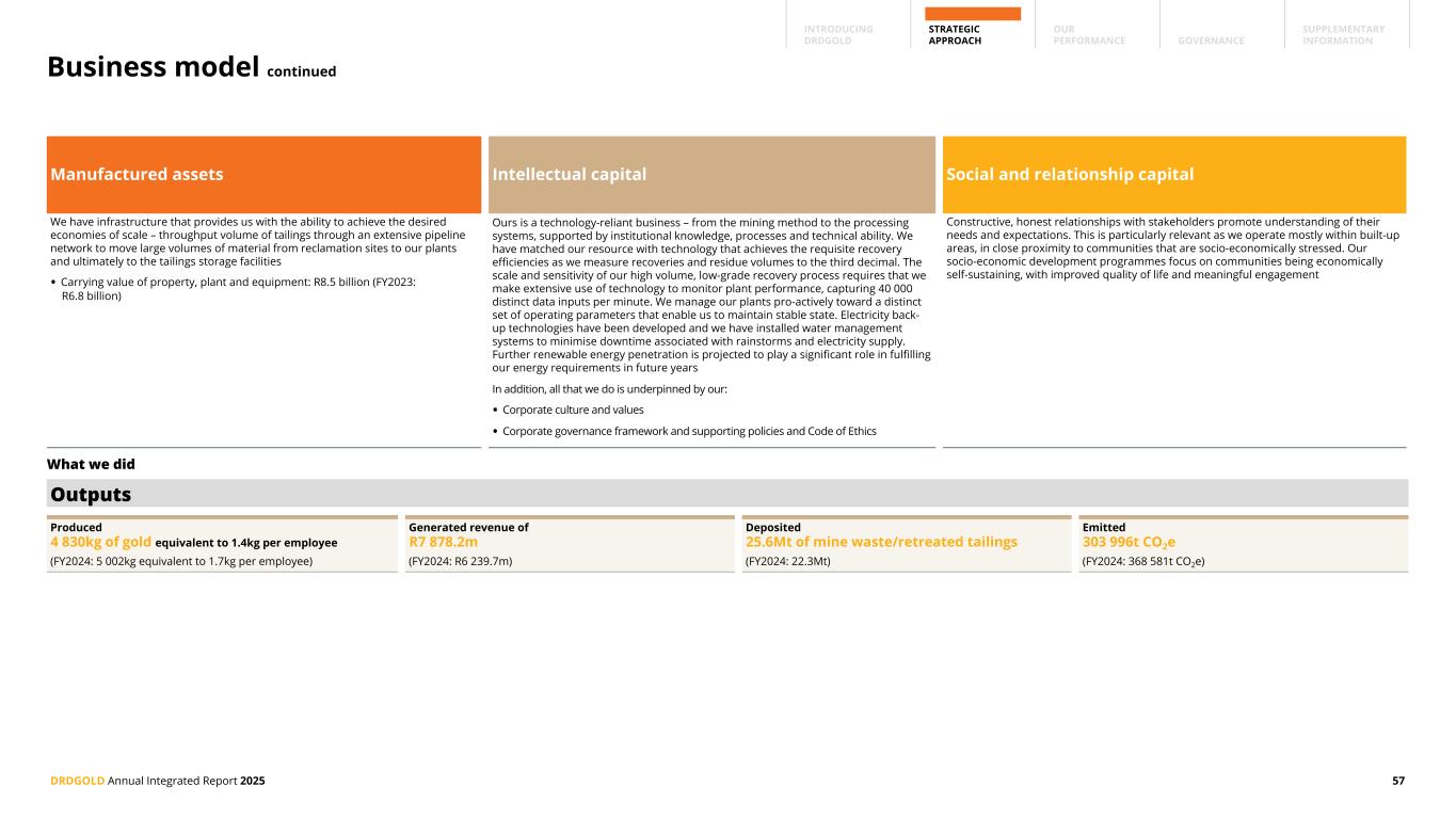 Manufactured assets Intellectual capital Social and relationship capital We have infrastructure that provides us with the ability to achieve the desired economies of scale – throughput volume of tailings through an extensive pipeline network to move large volumes of material from reclamation sites to our plants and ultimately to the tailings storage facilities • Carrying value of property, plant and equipment: R8.5 billion (FY2023: R6.8 billion) Ours is a technology-reliant business – from the mining method to the processing systems, supported by institutional knowledge, processes and technical ability. We have matched our resource with technology that achieves the requisite recovery efficiencies as we measure recoveries and residue volumes to the third decimal. The scale and sensitivity of our high volume, low-grade recovery process requires that we make extensive use of technology to monitor plant performance, capturing 40 000 distinct data inputs per minute. We manage our plants pro-actively toward a distinct set of operating parameters that enable us to maintain stable state. Electricity back- up technologies have been developed and we have installed water management systems to minimise downtime associated with rainstorms and electricity supply. Further renewable energy penetration is projected to play a significant role in fulfilling our energy requirements in future years In addition, all that we do is underpinned by our: • Corporate culture and values • Corporate governance framework and supporting policies and Code of Ethics Constructive, honest relationships with stakeholders promote understanding of their needs and expectations. This is particularly relevant as we operate mostly within built-up areas, in close proximity to communities that are socio-economically stressed. Our socio-economic development programmes focus on communities being economically self-sustaining, with improved quality of life and meaningful engagement What we did Outputs Produced 4 830kg of gold equivalent to 1.4kg per employee (FY2024: 5 002kg equivalent to 1.7kg per employee) Generated revenue of R7 878.2m (FY2024: R6 239.7m) Deposited 25.6Mt of mine waste/retreated tailings (FY2024: 22.3Mt) Emitted 303 996t CO2e (FY2024: 368 581t CO2e) INTRODUCING DRDGOLD STRATEGIC APPROACH OUR PERFORMANCE GOVERNANCE SUPPLEMENTARY INFORMATION Business model continued DRDGOLD Annual Integrated Report 2025 57