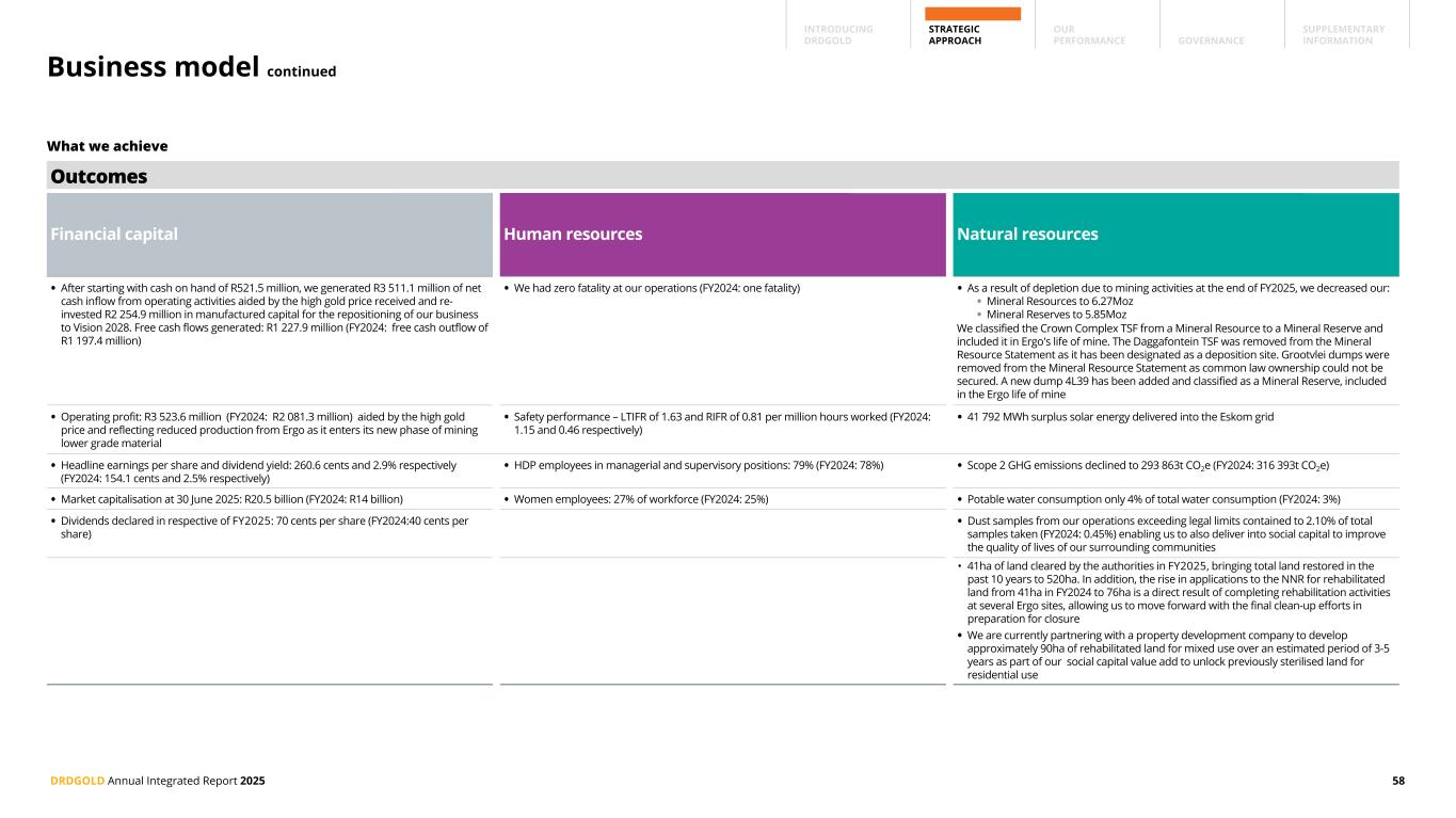 What we achieve Outcomes Financial capital Human resources Natural resources • After starting with cash on hand of R521.5 million, we generated R3 511.1 million of net cash inflow from operating activities aided by the high gold price received and re- invested R2 254.9 million in manufactured capital for the repositioning of our business to Vision 2028. Free cash flows generated: R1 227.9 million (FY2024: free cash outflow of R1 197.4 million) • We had zero fatality at our operations (FY2024: one fatality) • As a result of depletion due to mining activities at the end of FY2025, we decreased our: • Mineral Resources to 6.27Moz • Mineral Reserves to 5.85Moz We classified the Crown Complex TSF from a Mineral Resource to a Mineral Reserve and included it in Ergo's life of mine. The Daggafontein TSF was removed from the Mineral Resource Statement as it has been designated as a deposition site. Grootvlei dumps were removed from the Mineral Resource Statement as common law ownership could not be secured. A new dump 4L39 has been added and classified as a Mineral Reserve, included in the Ergo life of mine • Operating profit: R3 523.6 million (FY2024: R2 081.3 million) aided by the high gold price and reflecting reduced production from Ergo as it enters its new phase of mining lower grade material • Safety performance – LTIFR of 1.63 and RIFR of 0.81 per million hours worked (FY2024: 1.15 and 0.46 respectively) • 41 792 MWh surplus solar energy delivered into the Eskom grid • Headline earnings per share and dividend yield: 260.6 cents and 2.9% respectively (FY2024: 154.1 cents and 2.5% respectively) • HDP employees in managerial and supervisory positions: 79% (FY2024: 78%) • Scope 2 GHG emissions declined to 293 863t CO2e (FY2024: 316 393t CO2e) • Market capitalisation at 30 June 2025: R20.5 billion (FY2024: R14 billion) • Women employees: 27% of workforce (FY2024: 25%) • Potable water consumption only 4% of total water consumption (FY2024: 3%) • Dividends declared in respective of FY2025: 70 cents per share (FY2024:40 cents per share) • Dust samples from our operations exceeding legal limits contained to 2.10% of total samples taken (FY2024: 0.45%) enabling us to also deliver into social capital to improve the quality of lives of our surrounding communities • 41ha of land cleared by the authorities in FY2025, bringing total land restored in the past 10 years to 520ha. In addition, the rise in applications to the NNR for rehabilitated land from 41ha in FY2024 to 76ha is a direct result of completing rehabilitation activities at several Ergo sites, allowing us to move forward with the final clean-up efforts in preparation for closure • We are currently partnering with a property development company to develop approximately 90ha of rehabilitated land for mixed use over an estimated period of 3-5 years as part of our social capital value add to unlock previously sterilised land for residential use INTRODUCING DRDGOLD STRATEGIC APPROACH OUR PERFORMANCE GOVERNANCE SUPPLEMENTARY INFORMATION Business model continued DRDGOLD Annual Integrated Report 2025 58