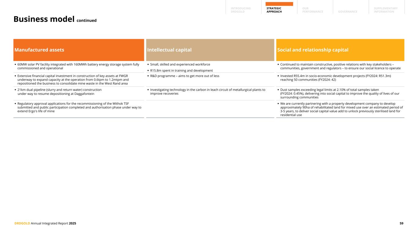 The table below illustrates how we are rolling back the environmental legacy of mining through our strategic focus points and how we have delivered and plan to deliver on our strategic objectives in the short-term. These focus points are aligned with the United Nations (UN) SDGs, which we influence directly, and the RGMPs by the WGC: Focus points Strategic objectives 2025 priorities What we achieved 2026 priorities Growing the business by replicating our business model - looking at expanding into Africa and beyond and other metals Applicable UN SDGs: Strategically relevant WGC RGMP: 9 – Biodiversity, land use and mine closure Related material themes: Operational sustainability and growth From impact to advantage: the strategic value of nature in mining • Acquisition of assets that fit our scale and business model. • Expansion of Mineral Reserves and TSFs to maintain current volume throughput and potentially increase current life of mines. • Manage the major projects in accordance with set deadlines to achieve key milestones and capital costs to come within planned spend. • Obtain environmental authorisation for the installation of an extensive pipeline network at FWGR to integrate the reclamation sites, expanded Driefontein 2 plant and RTSF. • Obtain final approvals for the recommissioning of the Withok TSF. • Actively seek to secure additional gold resources to extend the life of mine of our operations. • Complete due diligence on the copper project in the Northern Cape. • The public participation process for the Withok TSF recommissioning has been completed and the project is in the authorisation phase. • To supplement the Brakpan TSF until Ergo can recommission Withok, a decision was made to resume the Daggafontein TSF as a deposition facility. Construction of a 21km dual pipeline (tailings and return water) linking Ergo's Brakpan plant with the TSF is well advanced. • Ergo purchased 7L4 Marievale Dump and 4L39. • Ergo has extended its life of mine by 5 years after the three mine dumps comprising the Crown Complex were classified from a Mineral Resource to a Mineral Reserve and included in the life of mine. • The FWGR Phase II is well advanced, notwithstanding some delays caused by rainy weather, particularly in the third quarter of the financial year. • Environmental authorisation for the installation of an extensive pipeline network to integrate the reclamation sites, expanded Driefontein 2 plant and RTSF was obtained and 60km of the 135km of the required pipeline has been constructed. • Due diligence on the copper project in the Northern Cape was completed, and it was decided not to pursue the project. • Manage the major projects in accordance with set deadlines to achieve key milestones and capital costs to come within planned spend. • Resume deposition on the Daggafontein TSF in the first quarter of FY2027. • Obtain final approvals for the recommissioning of the Withok TSF. • Develop a contingency plan if Withok approval is not granted in time. • Actively look to secure additional gold resources to extend the life of mine of our operations. • Actively look to expand operations into Africa. INTRODUCING DRDGOLD STRATEGIC APPROACH OUR PERFORMANCE GOVERNANCE SUPPLEMENTARY INFORMATION Strategy and outlook continued DRDGOLD Annual Integrated Report 2025 48 1