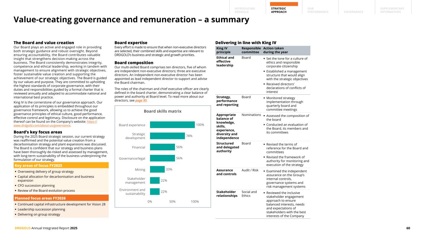 The Board and value creation Our Board plays an active and engaged role in providing both strategic guidance and robust oversight. Beyond ensuring accountability, the Board contributes valuable insight that strengthens decision-making across the business. The Board consistently demonstrates integrity, competence and ethical leadership, working in tandem with management to ensure alignment with strategic objectives, foster sustainable value creation and supporting the achievement of our strategic objectives. The Board is guided by our values and purpose. They are committed to upholding the highest standards of corporate governance, with their duties and responsibilities guided by a formal charter that is reviewed annually and adapted to accommodate national and international best practice. King IV is the cornerstone of our governance approach. Our application of its principles is embedded throughout our governance framework, allowing us to achieve the good governance principles of ethical culture, good performance, effective control and legitimacy. Disclosure on the application thereof can be found on the Company's website: https:// www.drdgold.com/about-us/governance. Board’s key focus areas During the 2025 Board strategic session, our current strategy was reaffirmed and the potential value creation from a decarbonisation strategy and plant expansions was discussed. The Board is confident that our strategy and business plans have been thoroughly de-risked and assessed by management, with long-term sustainability of the business underpinning the formulation of our strategy. Key areas of focus FY2025 • Overseeing delivery of group strategy • Capital allocation for decarbonisation and business expansion • CFO succession planning • Review of the Board evolution process Planned focus areas FY2026 • Continued capital infrastructure development for Vision 28 • Leadership succession planning • Delivering on group strategy Board expertise Every effort is made to ensure that when non-executive directors are selected, their combined skills and expertise are relevant to DRDGOLD’s business and strategic and growth priorities. Board composition Our multi-skilled Board comprises ten directors, five of whom are independent non-executive directors; three are executive directors. An independent non-executive director has been appointed as lead independent director to support and advise the Board chairman. The roles of the chairman and chief executive officer are clearly defined in the board charter, demonstrating a clear balance of power and authority at Board level. To read more about our directors, see page 95. Board skills matrix 100% 78% 56% 56% 33% 22% 22% 0% 50% 100% Board experience Strategic development Financial Governance/legal Mining Stakeholder management Environment and sustainability Delivering in line with King IV King IV principle Responsible committee Ethical and effective leadership Board • Set the tone for a culture of ethics and responsible corporate citizenship • Established a management structure that would align with the strategic objectives • Received directors’ declarations of conflicts of interest Strategy, performance and reporting Board • Monitored strategy implementation through quarterly board and committee meetings Appropriate balance of knowledge, skills, experience, diversity and independence Nominations • Assessed the composition of the board • Conducted an evaluation of the Board, its members and its committees Structured and delegated authority Board • Revised the terms of reference for the Board and committees • Revised the framework of authority for monitoring and execution of the strategy Assurance and controls Audit / Risk • Examined the independent assurance on the Group’s internal controls, governance systems and risk management systems Stakeholder relationships Social and Ethics • Reviewed the inclusive stakeholder engagement approach to ensure balanced interests, needs and expectations of stakeholders with the best interests of the Company Action taken during the year INTRODUCING DRDGOLD STRATEGIC APPROACH OUR PERFORMANCE GOVERNANCE SUPPLEMENTARY INFORMATION Value-creating governance and remuneration – a summary DRDGOLD Annual Integrated Report 2025 60