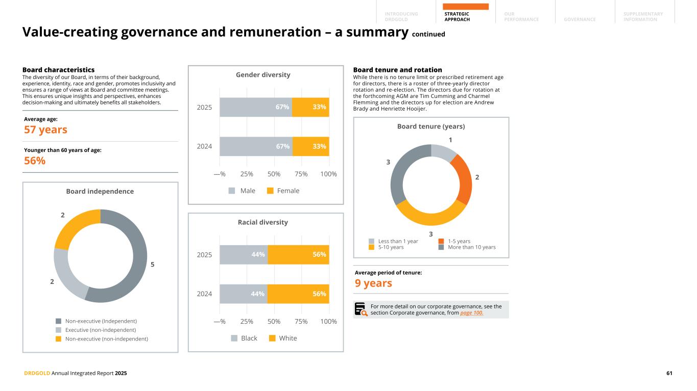 Board characteristics The diversity of our Board, in terms of their background, experience, identity, race and gender, promotes inclusivity and ensures a range of views at Board and committee meetings. This ensures unique insights and perspectives, enhances decision-making and ultimately benefits all stakeholders. Average age: 57 years Younger than 60 years of age: 56% Board independence 5 2 2 Non-executive (Independent) Executive (non-independent) Non-executive (non-independent) Gender diversity 67% 67% 33% 33% Male Female —% 25% 50% 75% 100% 2025 2024 Racial diversity 44% 44% 56% 56% Black White —% 25% 50% 75% 100% 2025 2024 Board tenure and rotation While there is no tenure limit or prescribed retirement age for directors, there is a roster of three-yearly director rotation and re-election. The directors due for rotation at the forthcoming AGM are Tim Cumming and Charmel Flemming and the directors up for election are Andrew Brady and Henriette Hooijer. Board tenure (years) 1 2 3 3 Less than 1 year 1-5 years 5-10 years More than 10 years Average period of tenure: 9 years For more detail on our corporate governance, see the section Corporate governance, from page 100. INTRODUCING DRDGOLD STRATEGIC APPROACH OUR PERFORMANCE GOVERNANCE SUPPLEMENTARY INFORMATION Value-creating governance and remuneration – a summary continued DRDGOLD Annual Integrated Report 2025 61
