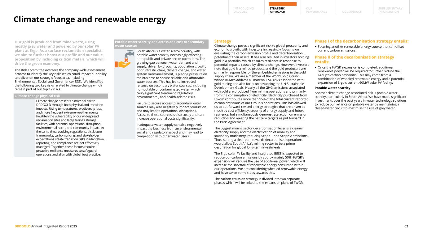 Our gold is produced from mine waste, using mostly grey water and powered by our solar PV plant at Ergo. As a surface reclamation specialist, we aim to further boost our profile and our value proposition by including critical metals, which will drive the green economy. The Risk Committee oversees the company-wide assessment process to identify the key risks which could impact our ability to deliver on our strategic focus area, including Environmental, Social, and Governance (ESG). We identified the following two key risks related to climate change which remain part of our top 12 risks. Climate change physical risk Climate change presents a material risk to DRDGOLD through both physical and transition impacts. Rising temperatures, biodiversity loss, and more frequent extreme weather events heighten the vulnerability of our widespread reclamation sites and large tailings storage facilities, with potential operational disruption, environmental harm, and community impact. At the same time, evolving regulations, disclosure frameworks, carbon pricing, and stakeholder expectations create transition risks if adaptation, reporting, and compliance are not effectively managed. Together, these factors require proactive resilience measures to safeguard operations and align with global best practice. Potable water scarcity and access and cost to secondary water sources South Africa is a water scarce country, with potable water scarcity increasingly affecting both public and private sector operations. The growing gap between water demand and supply, driven by droughts, population growth, poor infrastructure, climate change, and water system mismanagement, is placing pressure on the business to secure reliable and affordable water sources. This has led to increased reliance on secondary water sources, including non-potable or contaminated water, which carry significant treatment, regulatory, environmental, and health-related risks. Failure to secure access to secondary water sources may also negatively impact production and may lead to operational disruptions. Access to these sources is also costly and can increase operational costs significantly. Inadequate water supply can also negatively impact the business from an environmental, social and regulatory aspect and may lead to competition with other water users. Strategy Climate change poses a significant risk to global prosperity and economic growth, with investors increasingly focusing on evaluating the carbon emission profile and decarbonisation potential of their assets. It has also resulted in investors holding gold in a portfolio, which ensures resilience in response to potential impacts caused by climate change. However, investors note that gold is a mined product, and the gold producers are primarily responsible for the embedded emissions in the gold supply chain. We are a member of the World Gold Council whose RGMPs address all material ESG risks associated with gold mining and also focus on advancing the UN Sustainable Development Goals. Nearly all the GHG emissions associated with gold are produced from mining operations and primarily from the consumption of electricity. Electricity purchased from Eskom contributes more than 95% of the total current reported carbon emissions of our Group's operations. This has allowed us to put forward revised energy strategies that are driven as much by cost efficiency, security of energy supply and future resilience, but simultaneously demonstrate action on emission reduction and meeting the net zero targets as put forward in the Paris Agreement. The biggest mining sector decarbonisation lever is a cleaner electricity supply and the electrification of mobility and stationary machinery, reducing Scope 1 and Scope 2 emissions. Thus, setting a clear path towards decarbonised operations would allow South Africa’s mining sector to be a prime destination for global long-term investments. The Ergo solar PV facility and integrated BESS is expected to reduce our carbon emissions by approximately 50%. FWGR's expansion will require the use of additional power, which will increase the shortfall of renewable energy consumed within our operations. We are considering wheeled renewable energy and have taken some steps towards this. The carbon emission strategy is divided into two separate phases which will be linked to the expansion plans of FWGR. Phase I of the decarbonisation strategy entails: • Securing another renewable energy source that can offset current carbon emissions. Phase II of the decarbonisation strategy entails: • Once the FWGR expansion is completed, additional renewable power will be required to further reduce the Group's carbon emissions. This may come from a combination of wheeled renewable energy and a potential expansion of Ergo's current 60MW solar PV facility. Potable water scarcity Another climate change-associated risk is potable water scarcity, particularly in South Africa. We have made significant investments over the past years in water technology solutions to reduce our reliance on potable water by maintaining a closed-water circuit to maximise the use of grey water. INTRODUCING DRDGOLD STRATEGIC APPROACH OUR PERFORMANCE GOVERNANCE SUPPLEMENTARY INFORMATION Climate change and renewable energy DRDGOLD Annual Integrated Report 2025 62