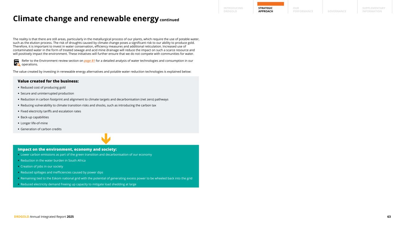 The reality is that there are still areas, particularly in the metallurgical process of our plants, which require the use of potable water, such as the elution process. The risk of droughts caused by climate change poses a significant risk to our ability to produce gold. Therefore, it is important to invest in water conservation, efficiency measures and additional reticulation. Increased use of contaminated water in the form of treated sewage and acid mine drainage will reduce the impact on such a scarce resource and will positively impact the environment. These initiatives will further ensure that we do not compete with communities for water. Refer to the Environment review section on page 81 for a detailed analysis of water technologies and consumption in our operations. The value created by investing in renewable energy alternatives and potable water reduction technologies is explained below: Value created for the business: • Reduced cost of producing gold • Secure and uninterrupted production • Reduction in carbon footprint and alignment to climate targets and decarbonisation (net zero) pathways • Reducing vulnerability to climate transition risks and shocks, such as introducing the carbon tax • Fixed electricity tariffs and escalation rates • Back-up capabilities • Longer life-of-mine • Generation of carbon credits ê Impact on the environment, economy and society: • Lower carbon emissions as part of the green transition and decarbonisation of our economy • Reduction in the water burden in South Africa • Creation of jobs in our society • Reduced spillages and inefficiencies caused by power dips • Remaining tied to the Eskom national grid with the potential of generating excess power to be wheeled back into the grid • Reduced electricity demand freeing up capacity to mitigate load shedding at large INTRODUCING DRDGOLD STRATEGIC APPROACH OUR PERFORMANCE GOVERNANCE SUPPLEMENTARY INFORMATION Climate change and renewable energy continued DRDGOLD Annual Integrated Report 2025 63