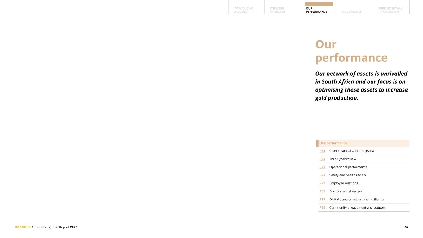 Our performance Our network of assets is unrivalled in South Africa and our focus is on optimising these assets to increase gold production. Our performance P65 Chief Financial Officer’s review P69 Three-year review P71 Operational performance P73 Safety and health review P77 Employee relations P81 Environmental review P89 Digital transformation and resilience P90 Community engagement and support INTRODUCING DRDGOLD STRATEGIC APPROACH OUR PERFORMANCE GOVERNANCE SUPPLEMENTARY INFORMATION DRDGOLD Annual Integrated Report 2025 64