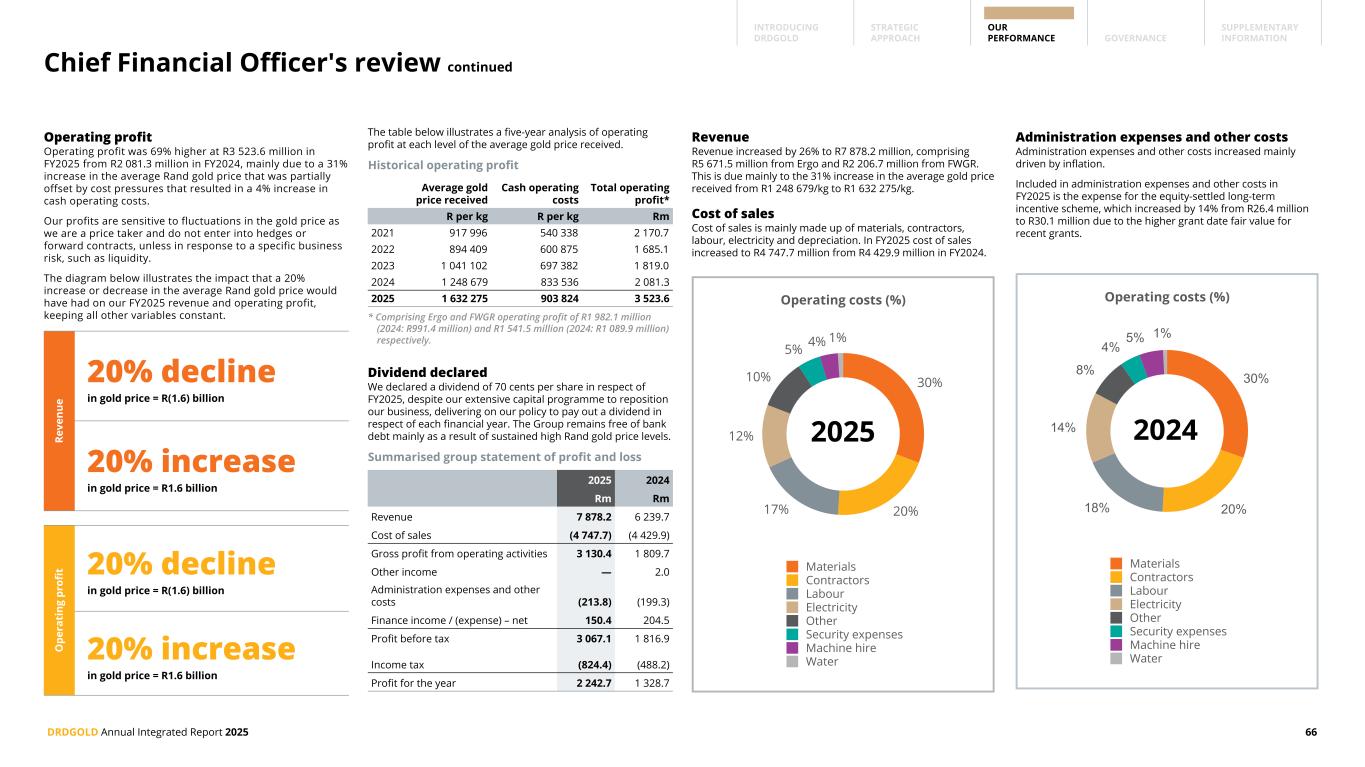 Operating profit Operating profit was 69% higher at R3 523.6 million in FY2025 from R2 081.3 million in FY2024, mainly due to a 31% increase in the average Rand gold price that was partially offset by cost pressures that resulted in a 4% increase in cash operating costs. Our profits are sensitive to fluctuations in the gold price as we are a price taker and do not enter into hedges or forward contracts, unless in response to a specific business risk, such as liquidity. The diagram below illustrates the impact that a 20% increase or decrease in the average Rand gold price would have had on our FY2025 revenue and operating profit, keeping all other variables constant. Re ve nu e 20% decline in gold price = R(1.6) billion 20% increase in gold price = R1.6 billion O pe ra ti ng p ro fi t 20% decline in gold price = R(1.6) billion 20% increase in gold price = R1.6 billion The table below illustrates a five-year analysis of operating profit at each level of the average gold price received. Historical operating profit Average gold price received Cash operating costs Total operating profit* R per kg R per kg Rm 2021 917 996 540 338 2 170.7 2022 894 409 600 875 1 685.1 2023 1 041 102 697 382 1 819.0 2024 1 248 679 833 536 2 081.3 2025 1 632 275 903 824 3 523.6 * Comprising Ergo and FWGR operating profit of R1 982.1 million (2024: R991.4 million) and R1 541.5 million (2024: R1 089.9 million) respectively. Dividend declared We declared a dividend of 70 cents per share in respect of FY2025, despite our extensive capital programme to reposition our business, delivering on our policy to pay out a dividend in respect of each financial year. The Group remains free of bank debt mainly as a result of sustained high Rand gold price levels. Summarised group statement of profit and loss 2025 2024 Rm Rm Revenue 7 878.2 6 239.7 Cost of sales (4 747.7) (4 429.9) Gross profit from operating activities 3 130.4 1 809.7 Other income — 2.0 Administration expenses and other costs (213.8) (199.3) Finance income / (expense) – net 150.4 204.5 Profit before tax 3 067.1 1 816.9 Income tax (824.4) (488.2) Profit for the year 2 242.7 1 328.7 Revenue Revenue increased by 26% to R7 878.2 million, comprising R5 671.5 million from Ergo and R2 206.7 million from FWGR. This is due mainly to the 31% increase in the average gold price received from R1 248 679/kg to R1 632 275/kg. Cost of sales Cost of sales is mainly made up of materials, contractors, labour, electricity and depreciation. In FY2025 cost of sales increased to R4 747.7 million from R4 429.9 million in FY2024. Operating costs (%) 30% 20%17% 12% 10% 5% 4% 1% Materials Contractors Labour Electricity Other Security expenses Machine hire Water Administration expenses and other costs Administration expenses and other costs increased mainly driven by inflation. Included in administration expenses and other costs in FY2025 is the expense for the equity-settled long-term incentive scheme, which increased by 14% from R26.4 million to R30.1 million due to the higher grant date fair value for recent grants. Operating costs (%) 30% 20%18% 14% 8% 4% 5% 1% Materials Contractors Labour Electricity Other Security expenses Machine hire Water INTRODUCING DRDGOLD STRATEGIC APPROACH OUR PERFORMANCE GOVERNANCE SUPPLEMENTARY INFORMATION Chief Financial Officer's review continued DRDGOLD Annual Integrated Report 2025 66 2025 2024