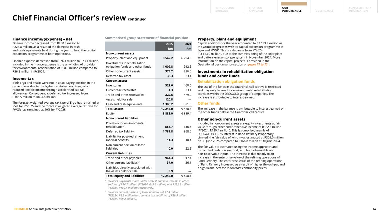 Finance income/(expense) – net Finance income decreased from R280.8 million to R223.8 million, as a result of the decrease in cash and cash equivalents held during the year to fund the capital expansion programme at both operations. Finance expense decreased from R76.4 million to R73.4 million. Included in the finance expense is the unwinding of provision for environmental rehabilitation of R58.6 million compared to R56.3 million in FY2024. Income tax Both Ergo and FWGR were not in a tax-paying position in the current year due to the higher capital expenditure, which reduced taxable income through accelerated capital allowances. Consequently, deferred tax increased from R388.5 million to R824.4 million. The forecast weighted average tax rate of Ergo has remained at 25% for FY2025 and the forecast weighted average tax rate for FWGR has remained at 29% for FY2025. Summarised group statement of financial position 2025 2024 Rm Rm Non-current assets Property, plant and equipment 8 542.2 6 794.9 Investments in rehabilitation obligation funds and other funds 1 002.8 912.5 Other non-current assets 1 379.2 226.0 Deferred tax asset 38.3 23.4 Current assets Inventories 522.6 460.0 Current tax receivable 4.3 33.1 Trade and other receivables 329.6 479.0 Assets held for sale 120.8 — Cash and cash equivalents 1 306.2 521.5 Total assets 12 246.0 9 450.4 Equity 8 883.0 6 889.4 Non-current liabilities Provision for environmental rehabilitation 558.7 616.8 Deferred tax liability 1 781.8 958.0 Liability for post-retirement medical benefits 11.3 10.4 Non-current portion of lease liabilities 10.0 22.3 Current liabilities Trade and other payables 964.3 917.4 Other current liabilities 2 37.0 36.1 Liabilities directly associated with the assets held for sale 9.9 — Total equity and liabilities 12 246.0 9 450.4 1 Includes payments made under protest and investments in other entities of R56.7 million (FY2024: R45.6 million) and R322.5 million (FY2024: R180.4 million) respectively. 2 Includes current portion of lease liabilities of R7.4 million (FY2024: R6.9 million) and current tax liabilities of R29.5 million (FY2024: R29.2 million). Property, plant and equipment Capital additions for the year amounted to R2 199.9 million as the Group progresses with its capital expansion programme at Ergo and FWGR. This is a decrease from FY2024 (R3 113.9 million), due to the commissioning of the solar plant and battery energy storage system in November 2024. More information on the capital projects is provided in the Operational performance section on pages 71 to 72. Investments in rehabilitation obligation funds and other funds Rehabilitation obligation funds The use of the funds in the Guardrisk cell captive is restricted and may only be used for environmental rehabilitation activities within the DRDGOLD group of companies. The increase is attributable to interest earned. Other funds The increase in the balance is attributable to interest earned on the other funds held in the Guardrisk cell captive. Other non-current assets Included in non-current assets are equity investments at fair value through other comprehensive income of R322.5 million (FY2024: R180.4 million). This is comprised mainly of DRDGOLD’s 11.3% interest in Rand Refinery Proprietary Limited, the fair value of which was estimated at R302.0 million on 30 June 2025 compared to R166.8 million at 30 June 2024. The fair value is estimated using the income approach and discounted cash flow method, with both observable and non-observable inputs. The increase is due mainly to an increase in the enterprise value of the refining operations of Rand Refinery. The enterprise value of the refining operations of Rand Refinery increased as a result of higher throughput and a significant increase in forecast commodity prices. INTRODUCING DRDGOLD STRATEGIC APPROACH OUR PERFORMANCE GOVERNANCE SUPPLEMENTARY INFORMATION Chief Financial Officer's review continued DRDGOLD Annual Integrated Report 2025 67