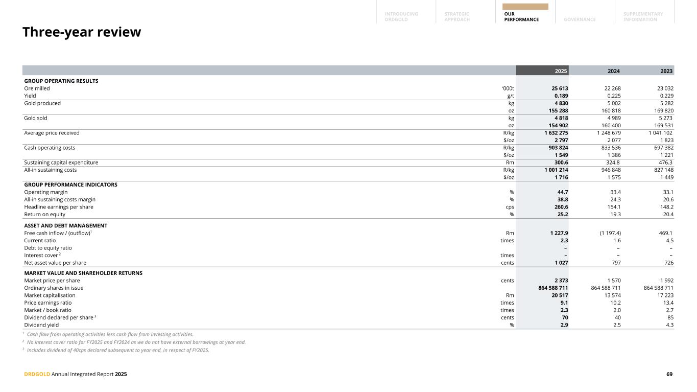 2025 2024 2023 GROUP OPERATING RESULTS Ore milled ‘000t 25 613 22 268 23 032 Yield g/t 0.189 0.225 0.229 Gold produced kg 4 830 5 002 5 282 oz 155 288 160 818 169 820 Gold sold kg 4 818 4 989 5 273 oz 154 902 160 400 169 531 Average price received R/kg 1 632 275 1 248 679 1 041 102 $/oz 2 797 2 077 1 823 Cash operating costs R/kg 903 824 833 536 697 382 $/oz 1 549 1 386 1 221 Sustaining capital expenditure Rm 300.6 324.8 476.3 All-in sustaining costs R/kg 1 001 214 946 848 827 148 $/oz 1 716 1 575 1 449 GROUP PERFORMANCE INDICATORS Operating margin % 44.7 33.4 33.1 All-in sustaining costs margin % 38.8 24.3 20.6 Headline earnings per share cps 260.6 154.1 148.2 Return on equity % 25.2 19.3 20.4 ASSET AND DEBT MANAGEMENT Free cash inflow / (outflow)1 Rm 1 227.9 (1 197.4) 469.1 Current ratio times 2.3 1.6 4.5 Debt to equity ratio – – – Interest cover 2 times – – – Net asset value per share cents 1 027 797 726 MARKET VALUE AND SHAREHOLDER RETURNS Market price per share cents 2 373 1 570 1 992 Ordinary shares in issue 864 588 711 864 588 711 864 588 711 Market capitalisation Rm 20 517 13 574 17 223 Price earnings ratio times 9.1 10.2 13.4 Market / book ratio times 2.3 2.0 2.7 Dividend declared per share 3 cents 70 40 85 Dividend yield % 2.9 2.5 4.3 1 Cash flow from operating activities less cash flow from investing activities. 2 No interest cover ratio for FY2025 and FY2024 as we do not have external borrowings at year end. 3 Includes dividend of 40cps declared subsequent to year end, in respect of FY2025. INTRODUCING DRDGOLD STRATEGIC APPROACH OUR PERFORMANCE GOVERNANCE SUPPLEMENTARY INFORMATION Three-year review DRDGOLD Annual Integrated Report 2025 69