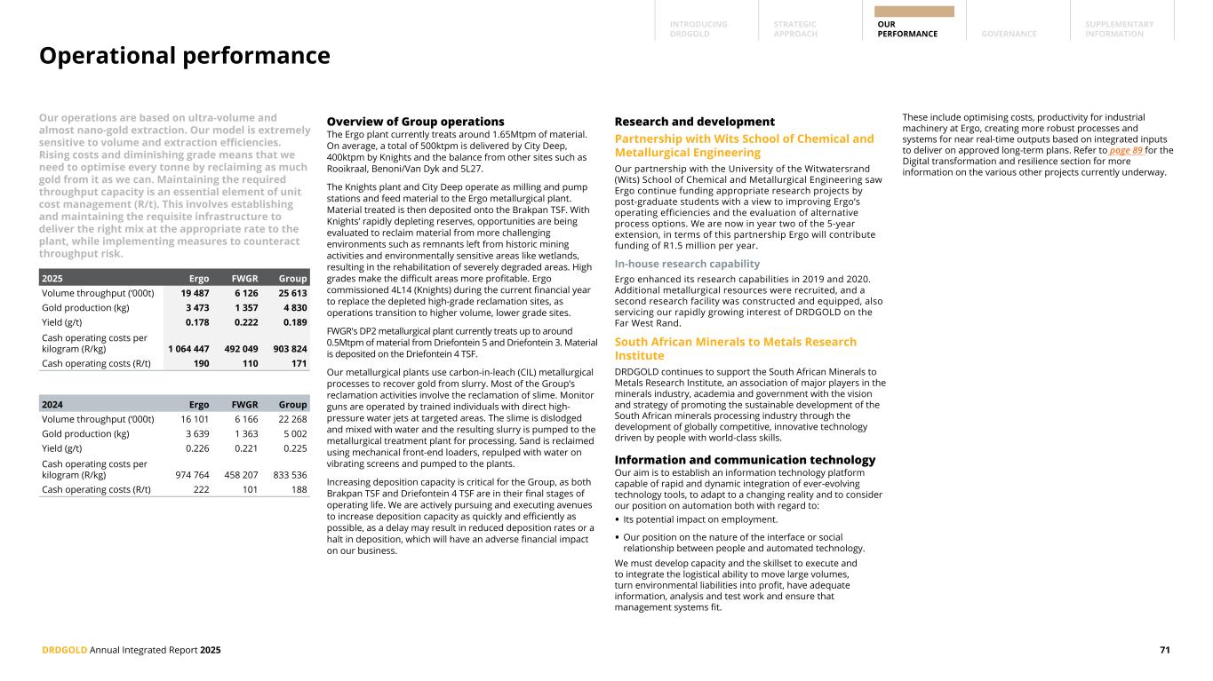 Our operations are based on ultra-volume and almost nano-gold extraction. Our model is extremely sensitive to volume and extraction efficiencies. Rising costs and diminishing grade means that we need to optimise every tonne by reclaiming as much gold from it as we can. Maintaining the required throughput capacity is an essential element of unit cost management (R/t). This involves establishing and maintaining the requisite infrastructure to deliver the right mix at the appropriate rate to the plant, while implementing measures to counteract throughput risk. 2025 Ergo FWGR Group Volume throughput (‘000t) 19 487 6 126 25 613 Gold production (kg) 3 473 1 357 4 830 Yield (g/t) 0.178 0.222 0.189 Cash operating costs per kilogram (R/kg) 1 064 447 492 049 903 824 Cash operating costs (R/t) 190 110 171 2024 Ergo FWGR Group Volume throughput (‘000t) 16 101 6 166 22 268 Gold production (kg) 3 639 1 363 5 002 Yield (g/t) 0.226 0.221 0.225 Cash operating costs per kilogram (R/kg) 974 764 458 207 833 536 Cash operating costs (R/t) 222 101 188 Overview of Group operations The Ergo plant currently treats around 1.65Mtpm of material. On average, a total of 500ktpm is delivered by City Deep, 400ktpm by Knights and the balance from other sites such as Rooikraal, Benoni/Van Dyk and 5L27. The Knights plant and City Deep operate as milling and pump stations and feed material to the Ergo metallurgical plant. Material treated is then deposited onto the Brakpan TSF. With Knights’ rapidly depleting reserves, opportunities are being evaluated to reclaim material from more challenging environments such as remnants left from historic mining activities and environmentally sensitive areas like wetlands, resulting in the rehabilitation of severely degraded areas. High grades make the difficult areas more profitable. Ergo commissioned 4L14 (Knights) during the current financial year to replace the depleted high-grade reclamation sites, as operations transition to higher volume, lower grade sites. FWGR's DP2 metallurgical plant currently treats up to around 0.5Mtpm of material from Driefontein 5 and Driefontein 3. Material is deposited on the Driefontein 4 TSF. Our metallurgical plants use carbon-in-leach (CIL) metallurgical processes to recover gold from slurry. Most of the Group’s reclamation activities involve the reclamation of slime. Monitor guns are operated by trained individuals with direct high- pressure water jets at targeted areas. The slime is dislodged and mixed with water and the resulting slurry is pumped to the metallurgical treatment plant for processing. Sand is reclaimed using mechanical front-end loaders, repulped with water on vibrating screens and pumped to the plants. Increasing deposition capacity is critical for the Group, as both Brakpan TSF and Driefontein 4 TSF are in their final stages of operating life. We are actively pursuing and executing avenues to increase deposition capacity as quickly and efficiently as possible, as a delay may result in reduced deposition rates or a halt in deposition, which will have an adverse financial impact on our business. Research and development Partnership with Wits School of Chemical and Metallurgical Engineering Our partnership with the University of the Witwatersrand (Wits) School of Chemical and Metallurgical Engineering saw Ergo continue funding appropriate research projects by post-graduate students with a view to improving Ergo’s operating efficiencies and the evaluation of alternative process options. We are now in year two of the 5-year extension, in terms of this partnership Ergo will contribute funding of R1.5 million per year. In-house research capability Ergo enhanced its research capabilities in 2019 and 2020. Additional metallurgical resources were recruited, and a second research facility was constructed and equipped, also servicing our rapidly growing interest of DRDGOLD on the Far West Rand. South African Minerals to Metals Research Institute DRDGOLD continues to support the South African Minerals to Metals Research Institute, an association of major players in the minerals industry, academia and government with the vision and strategy of promoting the sustainable development of the South African minerals processing industry through the development of globally competitive, innovative technology driven by people with world-class skills. Information and communication technology Our aim is to establish an information technology platform capable of rapid and dynamic integration of ever-evolving technology tools, to adapt to a changing reality and to consider our position on automation both with regard to: • Its potential impact on employment. • Our position on the nature of the interface or social relationship between people and automated technology. We must develop capacity and the skillset to execute and to integrate the logistical ability to move large volumes, turn environmental liabilities into profit, have adequate information, analysis and test work and ensure that management systems fit. These include optimising costs, productivity for industrial machinery at Ergo, creating more robust processes and systems for near real-time outputs based on integrated inputs to deliver on approved long-term plans. Refer to page 89 for the Digital transformation and resilience section for more information on the various other projects currently underway. INTRODUCING DRDGOLD STRATEGIC APPROACH OUR PERFORMANCE GOVERNANCE SUPPLEMENTARY INFORMATION Operational performance DRDGOLD Annual Integrated Report 2025 71