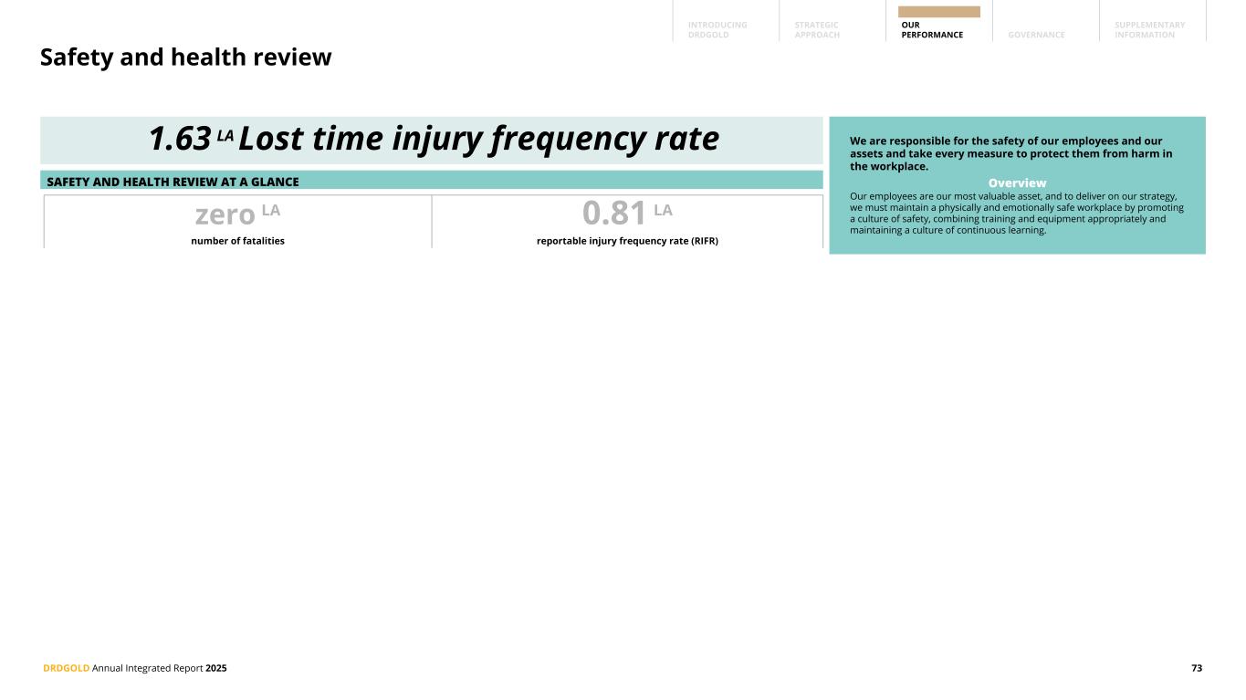 1.63 LA Lost time injury frequency rate We are responsible for the safety of our employees and our assets and take every measure to protect them from harm in the workplace. Overview Our employees are our most valuable asset, and to deliver on our strategy, we must maintain a physically and emotionally safe workplace by promoting a culture of safety, combining training and equipment appropriately and maintaining a culture of continuous learning. SAFETY AND HEALTH REVIEW AT A GLANCE zero LA 0.81 LA number of fatalities reportable injury frequency rate (RIFR) INTRODUCING DRDGOLD STRATEGIC APPROACH OUR PERFORMANCE GOVERNANCE SUPPLEMENTARY INFORMATION Safety and health review DRDGOLD Annual Integrated Report 2025 73