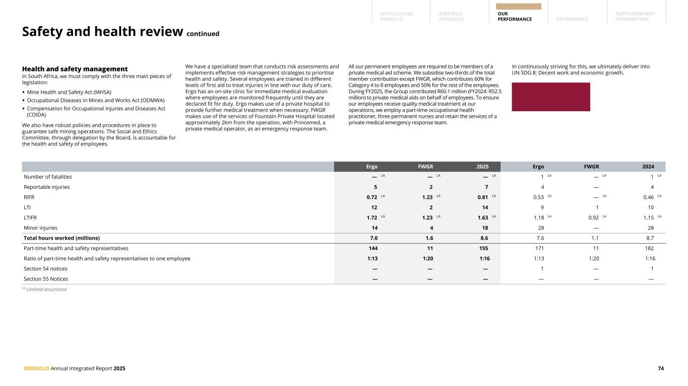Health and safety management In South Africa, we must comply with the three main pieces of legislation: • Mine Health and Safety Act (MHSA) • Occupational Diseases in Mines and Works Act (ODMWA) • Compensation for Occupational Injuries and Diseases Act (COIDA) We also have robust policies and procedures in place to guarantee safe mining operations. The Social and Ethics Committee, through delegation by the Board, is accountable for the health and safety of employees. We have a specialised team that conducts risk assessments and implements effective risk management strategies to prioritise health and safety. Several employees are trained in different levels of first aid to treat injuries in line with our duty of care. Ergo has an on-site clinic for immediate medical evaluation where employees are monitored frequently until they are declared fit for duty. Ergo makes use of a private hospital to provide further medical treatment when necessary. FWGR makes use of the services of Fountain Private Hospital located approximately 2km from the operation, with Princemed, a private medical operator, as an emergency response team. All our permanent employees are required to be members of a private medical aid scheme. We subsidise two-thirds of the total member contribution except FWGR, which contributes 60% for Category 4 to 8 employees and 50% for the rest of the employees. During FY2025, the Group contributed R60.1 million (FY2024: R52.5 million) to private medical aids on behalf of employees. To ensure our employees receive quality medical treatment at our operations, we employ a part-time occupational health practitioner, three permanent nurses and retain the services of a private medical emergency response team. In continuously striving for this, we ultimately deliver into UN SDG 8: Decent work and economic growth. Ergo FWGR 2025 Ergo FWGR 2024 Number of fatalities — LA — LA — LA 1 LA — LA 1 LA Reportable injuries 5 2 7 4 — 4 RIFR 0.72 LA 1.23 LA 0.81 LA 0.53 LA — LA 0.46 LA LTI 12 2 14 9 1 10 LTIFR 1.72 LA 1.23 LA 1.63 LA 1.18 LA 0.92 LA 1.15 LA Minor injuries 14 4 18 28 — 28 Total hours worked (millions) 7.0 1.6 8.6 7.6 1.1 8.7 Part-time health and safety representatives 144 11 155 171 11 182 Ratio of part-time health and safety representatives to one employee 1:13 1:20 1:16 1:13 1:20 1:16 Section 54 notices — — — 1 — 1 Section 55 Notices — — — — — — LA Limited assurance INTRODUCING DRDGOLD STRATEGIC APPROACH OUR PERFORMANCE GOVERNANCE SUPPLEMENTARY INFORMATION Safety and health review continued DRDGOLD Annual Integrated Report 2025 74
