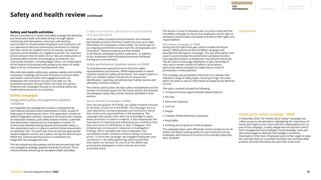 Safety and health activities We are committed to a health and safety strategy that identifies and eliminates health and safety threats through regular monitoring and intervention, ensuring a safe working environment for all permanent employees and contractors. All our operational sites are continuously monitored for hazards and risks, which are ranked in terms of severity, duration of exposure and probability of a negative outcome. Our induction process ensures that all visitors to our sites are made aware of potential safety hazards and emergency procedures. Our community members, including illegal miners, are made aware of the hazards of accessing mine property by means of safety signs at all our reclamation and deposition sites. We undertake weekly safety topic updates, weekly and monthly contractors’ meetings and annual inductions to ensure safety and health communication and engagement with our employees and contractors on site in line with our risk assessment process. During FY2025, we rolled out various initiatives and campaigns focused on promoting safety and health awareness across our business. Safety campaigns Integrated safety management solution initiative An integrated risk management solution underpinned by international standards was implemented in 2020, as part of Ergo’s goal of achieving zero harm. This application consists of several integrated modules: a baseline risk assessment module, an evaluation module, a job safety analysis module, a planned task observation module and an investigation module. To continuously identify existing hazards and possible events, a risk assessment team is in place to perform initial assessments on potential risks. This team also ensures that the appropriate hazard mitigation actions are in place. During the financial year, FWGR also commenced the process to implement the integrated risk management tool. The risk module not only assesses risk but also ensures that risks are managed accordingly using the hierarchy of controls. This is critical to further enhancing our workplace health and safety. Codes of practices, procedures and baseline risk assessments All of our codes of practice and procedures are reviewed periodically to ensure that they contain the most up-to-date information for employees to work safely. This forms part of our ongoing commitment to zero harm for all employees and contractors. These procedures are then briefed to all relevant employees by their supervisors. In addition to this, employees attend discipline procedure facilitated training on an annual basis. Safety performance incentive system at FWGR To stimulate improved performance from the safety representatives and foremen, FWGR implemented a reward incentive system for safety performance. This reward system is still in its inception phase, but will aim to improve the identification, reporting and addressing of safety hazards and ultimately minimise incidents. The criteria used to select the best safety representative are the number of actioned reports for the month and for the foremen, the workplace safety files and the hazards identified in their sections. Section 22 and 23 campaign at FWGR Over the last quarter of FY2025, our safety initiative focused on Sections 22 and 23 of the MHSA. The campaign aims to raise awareness among employees and contractors about their duties and responsibilities in the workplace. The campaign also equips them with the knowledge to apply these provisions to reduce incidents. It also emphasises the importance of reporting and addressing any conditions that may pose harm to themselves or their colleagues. This initiative was introduced in response to investigation findings, which revealed that some employees had normalised unsafe conditions without taking corrective action. To drive the campaign, we engaged employees and contractors in all safety gatherings and ensured that information on Sections 22 and 23 of the MHSA was prominently displayed on notice boards and other accessible areas. The Section 22 and 23 initiatives will run concurrently with the Vula Mehlo campaign to ensure that employees remain alert to workplace hazards while also being informed of their rights and responsibilities. Silly Season campaign at FWGR During the first half of the year, which included the festive season, FWGR reinforced the Vuli Mehlo campaign and launched the Silly Season Campaign. This was done earlier than usual to accommodate the period when workplace incident risks typically increase, as employees may become distracted. The aim was to encourage employees to take ownership of risks and to remain mindful of safety in all situations, particularly where complacency might lead to a lack of prioritisation of safe practices. The campaign was presented in the form of a calendar that featured a range of safety topics, focusing on high-risk areas within the plant as well as information provided by the Minerals Council. The topics covered included the following: • 16 Days of Activism against Gender-Based Violence • HIV Aids • Noise over Exposure • Lock out • Fatigue • Trackless Mobile Machinery Operation • Road Safety • Drinking and drug abuse in the workplace The campaign topics were effectively communicated across all health and safety meeting platforms and monitored among employees and contractors to ensure the intended objectives were achieved. Eye protection Hands up for safety campaign - ERGO In December 2024, the “Hands Up for Safety” campaign was rolled out across all operations, highlighting the importance of hands and fingers as our most vital and irreplaceable tools. As part of the campaign, a safety pledge was introduced in which both management and employees received pledge cards and were encouraged to dedicate their pledge to someone meaningful in their lives. Employees were further urged to keep the card with them as a constant reminder that working safely protects not only themselves but also their loved ones. I