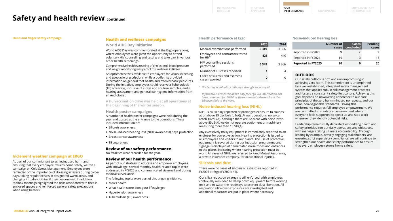 Hand and finger safety campaign Inclement weather campaign at ERGO As part of our commitment to achieving zero harm and ensuring that every employee returns home safely, we ran a campaign on Cold Stress Management. Employees were reminded of the importance of dressing in layers during colder days, taking regular breaks in designated warm areas, and changing into dry clothing if they become wet. In addition, toolbox meetings highlighted the risks associated with fires in enclosed spaces and reinforced general safety precautions when using heaters. Health and wellness campaigns World AIDS Day initiative World AIDS Day was commemorated at the Ergo operations, where employees were given the opportunity to attend voluntary HIV counselling and testing and take part in various other health screenings. Comprehensive health screening of cholesterol, blood pressure and weight monitoring was part of this wellness initiative. An optometrist was available to employees for vision screening and spectacle prescriptions, while a podiatrist provided information on general foot health and offered basic pedicures. During the initiative, employees could receive a Tuberculosis (TB) screening, inclusive of x-rays and sputum samples, and a hearing assessment and general ear hygiene information from an Audiologist. A flu vaccination drive was held at all operations at the beginning of the winter season. Health poster campaigns A number of health poster campaigns were held during the year and posted at the entrance to the operations. These included information on: • Silicosis awareness • Noise-induced hearing loss (NIHL awareness) / eye protection • Breast cancer awareness • TB awareness Review of our safety performance No fatalities were recorded for the year. Review of our health performance As part of our strategy to educate and empower employees with knowledge, several monthly health-related topics were addressed in FY2025 and communicated via email and during medical surveillance. The following topics were part of this ongoing initiative: • Men's health • What health score does your lifestyle get • Hypertension awareness • Tuberculosis (TB) awareness Health performance at Ergo 2025 2024 Medical examinations performed 6 349 3 366 Employees and contractors tested for HIV1 426 440 HIV counselling sessions performed 6 349 3 366 Number of TB cases reported 1 4 Cases of silicosis and asbestos cases reported 0 0 1 HIV testing is voluntary although strongly encouraged. Information presented above only for Ergo. No information has been presented for FWGR as figures are not released from the Sibanye clinic to the mine. Noise-induced hearing loss (NIHL) NIHL is caused by repeated or prolonged exposure to sounds at or above 85 decibels (dB(A)). At our operations, noise can reach 102dB(A). Although there are 32 areas with noise levels above 85dB(A), we do not operate equipment or machinery measuring more than 107dB(A). Any excessively noisy equipment is immediately reported to an engineer for corrective action. Hearing protection is issued to all employees and visitors to our plants. The use of protective equipment is covered during our induction programme and signage is displayed at demarcated noise zones and entrances to the plants, indicating where hearing protection must be worn. All cases of NIHL are referred to Rand Mutual Assurance, a private insurance company, for occupational injuries. Silicosis and dust There were no cases of silicosis or asbestosis reported in FY2025 at Ergo (FY2024: nil). Our silica reduction strategy is still enforced, with employees continually reminded to damp down equipment before working on it and to water the roadways to prevent dust liberation. All respiration silica over-exposures are investigated and additional measures are put in place where necessary. Noise-induced hearing loss Number of cases Cases concluded Pending cases Reported in FY2023 9 2 7 Reported in FY2024 19 3 16 Reported in FY2025 20 0 20 OUTLOOK Our safety outlook is firm and uncompromising in achieving zero harm. This commitment is underpinned by a well-established, integrated safety management system that applies robust risk management practices and fosters a consistent safety-first culture. Achieving this goal depends on unwavering adherence to our core principles of the zero harm mindset, no repeats, and our clear, non-negotiable standards. Driving this performance requires full employee empowerment. We are committed to creating an environment where everyone feels supported to speak up and stop work whenever they identify potential risks. Leadership remains fully dedicated, embedding health and safety priorities into our daily operations and objectives, with managers taking ultimate accountability. Through leading by example, actively engaging stakeholders, and ensuring strict supervisory compliance, we will continue to strengthen our health and safety performance to ensure that every employee returns home safely. INTRODUCING DRDGOLD STRATEGIC APPROACH OUR PERFORMANCE GOVERNANCE SUPPLEMENTARY INFORMATION Safety and health review continued DRDGOLD Annual Integrated Report 2025 76