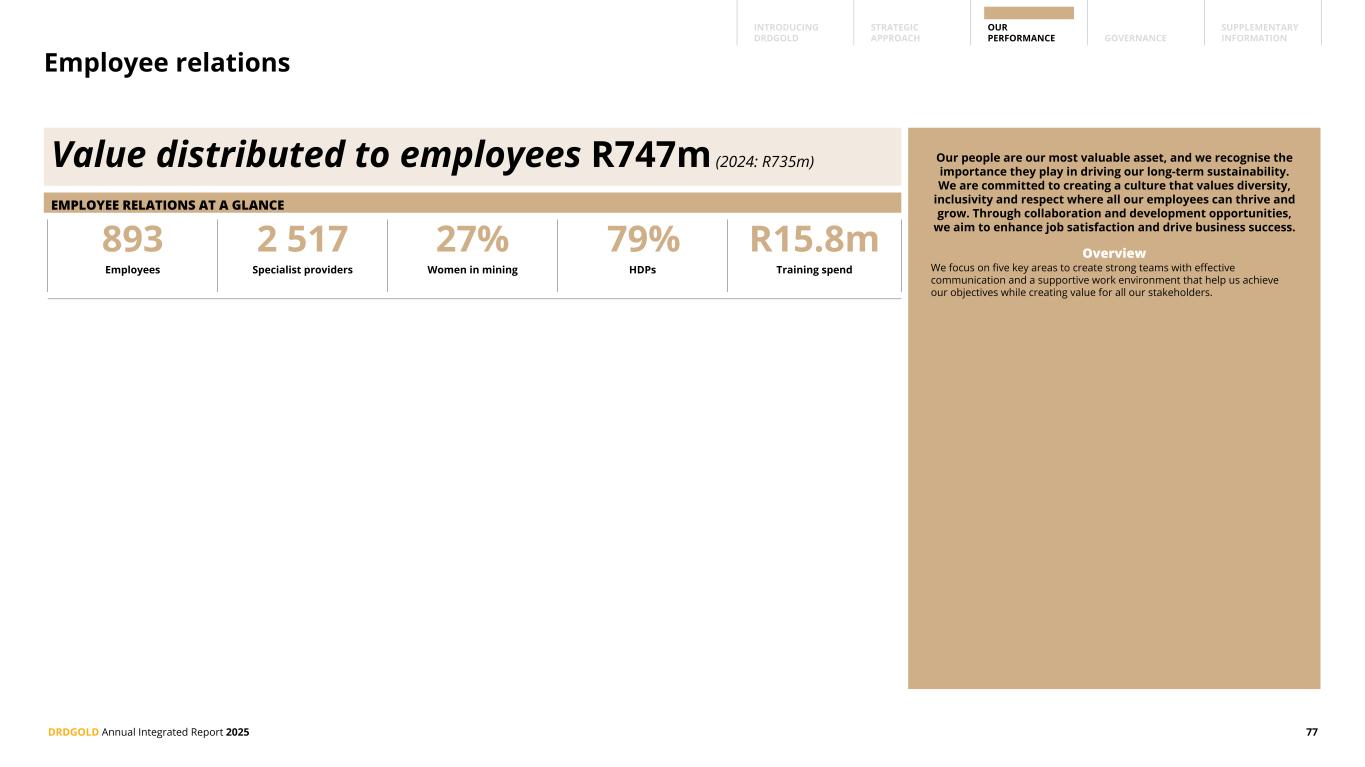 Value distributed to employees R747m (2024: R735m) Our people are our most valuable asset, and we recognise the importance they play in driving our long-term sustainability. We are committed to creating a culture that values diversity, inclusivity and respect where all our employees can thrive and grow. Through collaboration and development opportunities, we aim to enhance job satisfaction and drive business success. Overview We focus on five key areas to create strong teams with effective communication and a supportive work environment that help us achieve our objectives while creating value for all our stakeholders. EMPLOYEE RELATIONS AT A GLANCE 893 2 517 27% 79% R15.8m Employees Specialist providers Women in mining HDPs Training spend INTRODUCING DRDGOLD STRATEGIC APPROACH OUR PERFORMANCE GOVERNANCE SUPPLEMENTARY INFORMATION Employee relations DRDGOLD Annual Integrated Report 2025 77