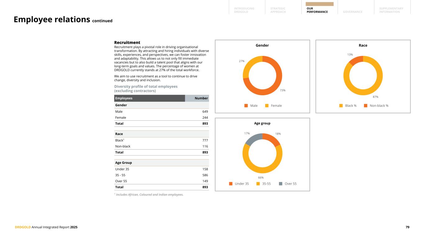 Recruitment Recruitment plays a pivotal role in driving organisational transformation. By attracting and hiring individuals with diverse skills, experiences, and perspectives, we can foster innovation and adaptability. This allows us to not only fill immediate vacancies but to also build a talent pool that aligns with our long-term goals and values. The percentage of women at DRDGOLD currently stands at 27% of the total workforce. We aim to use recruitment as a tool to continue to drive change, diversity and inclusion. Diversity profile of total employees (excluding contractors) Employees Number Gender Male 649 Female 244 Total 893 Race Black1 777 Non-black 116 Total 893 Age Group Under 35 158 35 - 55 586 Over 55 149 Total 893 1 Includes African, Coloured and Indian employees. Gender 73% 27% Male Female Age group 18% 66% 17% Under 35 35-55 Over 55 Race 87% 13% Black % Non-black % INTRODUCING DRDGOLD STRATEGIC APPROACH OUR PERFORMANCE GOVERNANCE SUPPLEMENTARY INFORMATION Employee relations continued DRDGOLD Annual Integrated Report 2025 79