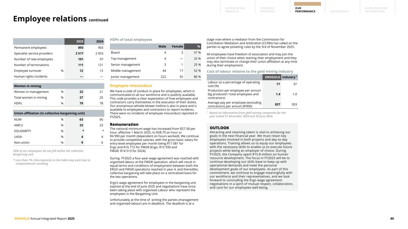2025 2024 Permanent employees 893 903 Specialist service providers 2 517 2 053 Number of new employees 101 97 Number of terminations 111 121 Employee turnover % 12 13 Human rights incidents — — Women in mining Women in management % 22 21 Total women in mining % 27 25 HDPs % 79 78 Union affiliation (in collective bargaining unit) NUM % 63 66 AMCU % 23 23 SOLIDARITY % * * UASA % 4 4 Non-union % 9 6 20% of our employees do not fall within the collective bargaining unit. * Less than 1%. Discrepancies in the table may exist due to computational rounding. HDPs of total employees Male Female % Board 4 3 57 % Top management 4 — 25 % Senior management 3 1 25 % Middle management 44 17 52 % Junior management 222 55 80 % Employee misconduct We have a code of conduct in place for employees, which is communicated to all our workforce and is publicly available. This code provides a clear expectation of how employees and contractors carry themselves in the execution of their duties. Our anonymous whistle-blower hotline is also in place and is available to employees and contractors to report incidents. There were no incidents of employee misconduct reported in FY2025. Remuneration The national minimum wage has increased from R27.58 per hour, effective 1 March 2025, to R28.79 an hour or R4 990 per month (dependent on hours worked). We continue to provide competitive salaries, with the gross basic salary for entry-level employees per month being R17 081 for Ergo and R16 772 for FWGR (Ergo: R15 599 and FWGR: R14 513 for 2024). During FY2025 a four-year wage agreement was reached with organised labour at the FWGR operation, which will result in equal terms and conditions of employment between both the ERGO and FWGR operations reached in year 4, and thereafter, collective bargaining will take place on a centralised basis for the two operations. Ergo’s wage agreement for employees in the bargaining unit expired at the end of June 2025 and negotiations have since been taking place with organised Labour who represent the employees in the Bargaining Unit. Unfortunately at the time of writing the parties (management and organised labour) are in deadlock. The deadlock is at a stage now where a mediator from the Commission for Conciliation Mediation and Arbitration (CCMA) has called on the parties to agree picketing rules by the 3rd of November 2025. All employees have freedom of association and may join the union of their choice when starting their employment and they may also terminate or change their union affiliation at any time during their employment. Cost of labour relative to the gold mining industry DRDGOLD Industry 1 Labour as a percentage of operating cost (%) 17 37 Production per employee per annum (kg produced / total employees and contractors) 1.4 1.0 Average pay per employee (excluding contractors) per annum (R’000) 837 503 1 Based on information from gold mining companies for the year ended 31 December 2024 and 30 June 2025. OUTLOOK Attracting and retaining talent is vital to achieving our goals in the next financial year. We must retain key employees involved in both projects and day-to-day operations. Training allows us to equip our employees with the necessary skills to enable us to execute future projects while being an employer of choice. During FY2025, the Company spent R15.8 million on human resource development. The focus in FY2025 will be to continue developing our skills base to keep up with operational demands and meet the personal development goals of our employees. As part of this commitment, we continue to engage meaningfully with our workforce and their representatives, and we look forward to concluding the Ergo wage agreement negotiations in a spirit of mutual respect, collaboration, and care for our employees well-being. INTRODUCING DRDGOLD STRATEGIC APPROACH OUR PERFORMANCE GOVERNANCE SUPPLEMENTARY INFORMATION Employee relations continued DRDGOLD Annual Integrated Report 2025 80