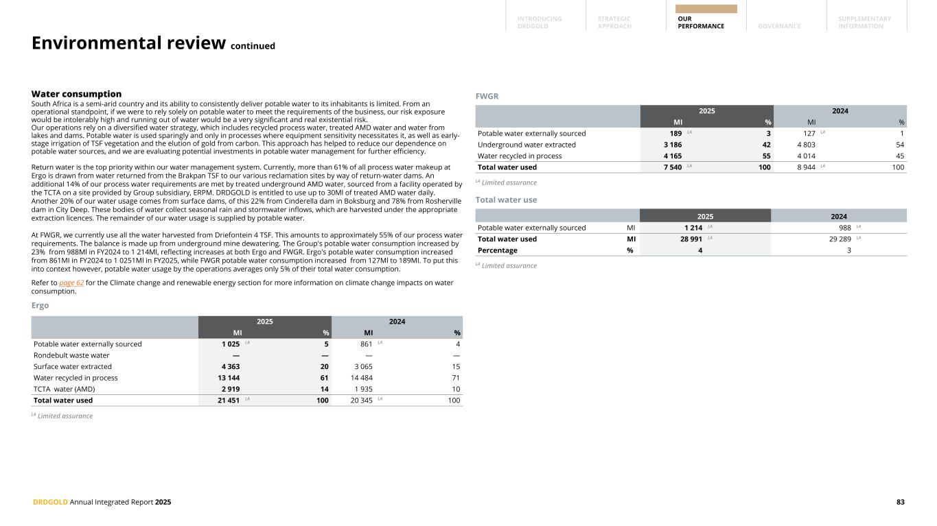 Water consumption South Africa is a semi-arid country and its ability to consistently deliver potable water to its inhabitants is limited. From an operational standpoint, if we were to rely solely on potable water to meet the requirements of the business, our risk exposure would be intolerably high and running out of water would be a very significant and real existential risk. Our operations rely on a diversified water strategy, which includes recycled process water, treated AMD water and water from lakes and dams. Potable water is used sparingly and only in processes where equipment sensitivity necessitates it, as well as early- stage irrigation of TSF vegetation and the elution of gold from carbon. This approach has helped to reduce our dependence on potable water sources, and we are evaluating potential investments in potable water management for further efficiency. Return water is the top priority within our water management system. Currently, more than 61% of all process water makeup at Ergo is drawn from water returned from the Brakpan TSF to our various reclamation sites by way of return-water dams. An additional 14% of our process water requirements are met by treated underground AMD water, sourced from a facility operated by the TCTA on a site provided by Group subsidiary, ERPM. DRDGOLD is entitled to use up to 30Ml of treated AMD water daily. Another 20% of our water usage comes from surface dams, of this 22% from Cinderella dam in Boksburg and 78% from Rosherville dam in City Deep. These bodies of water collect seasonal rain and stormwater inflows, which are harvested under the appropriate extraction licences. The remainder of our water usage is supplied by potable water. At FWGR, we currently use all the water harvested from Driefontein 4 TSF. This amounts to approximately 55% of our process water requirements. The balance is made up from underground mine dewatering. The Group's potable water consumption increased by 23% from 988Ml in FY2024 to 1 214Ml, reflecting increases at both Ergo and FWGR. Ergo's potable water consumption increased from 861MI in FY2024 to 1 0251Ml in FY2025, while FWGR potable water consumption increased from 127Ml to 189MI. To put this into context however, potable water usage by the operations averages only 5% of their total water consumption. Refer to page 62 for the Climate change and renewable energy section for more information on climate change impacts on water consumption. Ergo 2025 2024 MI % MI % Potable water externally sourced 1 025 LA 5 861 LA 4 Rondebult waste water — — — — Surface water extracted 4 363 20 3 065 15 Water recycled in process 13 144 61 14 484 71 TCTA water (AMD) 2 919 14 1 935 10 Total water used 21 451 LA 100 20 345 LA 100 LA Limited assurance FWGR 2025 2024 MI % MI % Potable water externally sourced 189 LA 3 127 LA 1 Underground water extracted 3 186 42 4 803 54 Water recycled in process 4 165 55 4 014 45 Total water used 7 540 LA 100 8 944 LA 100 LA Limited assurance Total water use 2025 2024 Potable water externally sourced MI 1 214 LA 988 LA Total water used MI 28 991 LA 29 289 LA Percentage % 4 3 LA Limited assurance INTRODUCING DRDGOLD STRATEGIC APPROACH OUR PERFORMANCE GOVERNANCE SUPPLEMENTARY INFORMATION Environmental review continued DRDGOLD Annual Integrated Report 2025 83
