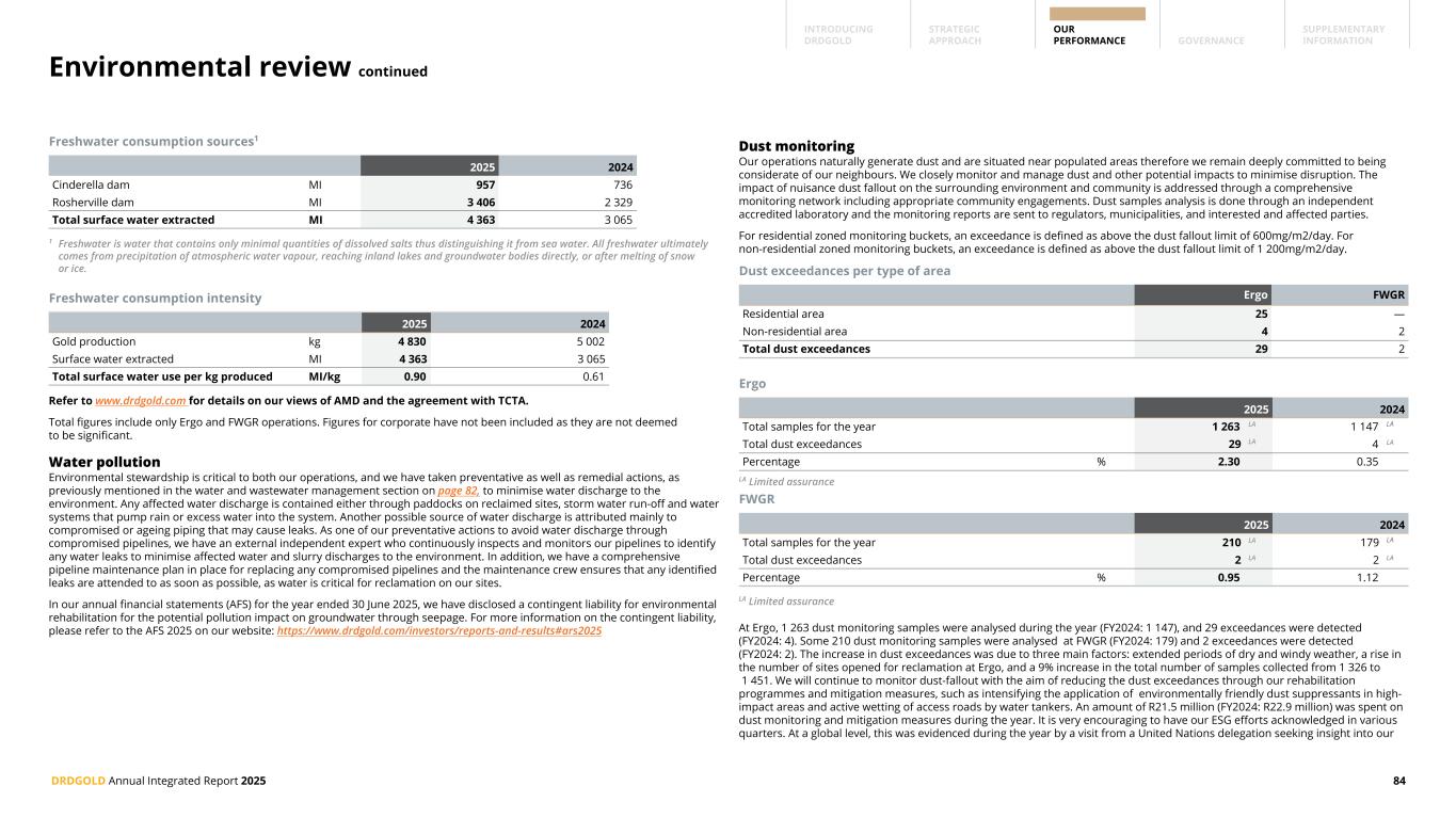 Freshwater consumption sources1 2025 2024 Cinderella dam MI 957 736 Rosherville dam MI 3 406 2 329 Total surface water extracted MI 4 363 3 065 1 Freshwater is water that contains only minimal quantities of dissolved salts thus distinguishing it from sea water. All freshwater ultimately comes from precipitation of atmospheric water vapour, reaching inland lakes and groundwater bodies directly, or after melting of snow or ice. Freshwater consumption intensity 2025 2024 Gold production kg 4 830 5 002 Surface water extracted MI 4 363 3 065 Total surface water use per kg produced MI/kg 0.90 0.61 Refer to www.drdgold.com for details on our views of AMD and the agreement with TCTA. Total figures include only Ergo and FWGR operations. Figures for corporate have not been included as they are not deemed to be significant. Water pollution Environmental stewardship is critical to both our operations, and we have taken preventative as well as remedial actions, as previously mentioned in the water and wastewater management section on page 82, to minimise water discharge to the environment. Any affected water discharge is contained either through paddocks on reclaimed sites, storm water run-off and water systems that pump rain or excess water into the system. Another possible source of water discharge is attributed mainly to compromised or ageing piping that may cause leaks. As one of our preventative actions to avoid water discharge through compromised pipelines, we have an external independent expert who continuously inspects and monitors our pipelines to identify any water leaks to minimise affected water and slurry discharges to the environment. In addition, we have a comprehensive pipeline maintenance plan in place for replacing any compromised pipelines and the maintenance crew ensures that any identified leaks are attended to as soon as possible, as water is critical for reclamation on our sites. In our annual financial statements (AFS) for the year ended 30 June 2025, we have disclosed a contingent liability for environmental rehabilitation for the potential pollution impact on groundwater through seepage. For more information on the contingent liability, please refer to the AFS 2025 on our website: https://www.drdgold.com/investors/reports-and-results#ars2025 Dust monitoring Our operations naturally generate dust and are situated near populated areas therefore we remain deeply committed to being considerate of our neighbours. We closely monitor and manage dust and other potential impacts to minimise disruption. The impact of nuisance dust fallout on the surrounding environment and community is addressed through a comprehensive monitoring network including appropriate community engagements. Dust samples analysis is done through an independent accredited laboratory and the monitoring reports are sent to regulators, municipalities, and interested and affected parties. For residential zoned monitoring buckets, an exceedance is defined as above the dust fallout limit of 600mg/m2/day. For non-residential zoned monitoring buckets, an exceedance is defined as above the dust fallout limit of 1 200mg/m2/day. Dust exceedances per type of area Ergo FWGR Residential area 25 — Non-residential area 4 2 Total dust exceedances 29 2 Ergo 2025 2024 Total samples for the year 1 263 LA 1 147 LA Total dust exceedances 29 LA 4 LA Percentage % 2.30 0.35 LA Limited assurance FWGR 2025 2024 Total samples for the year 210 LA 179 LA Total dust exceedances 2 LA 2 LA Percentage % 0.95 1.12 LA Limited assurance At Ergo, 1 263 dust monitoring samples were analysed during the year (FY2024: 1 147), and 29 exceedances were detected (FY2024: 4). Some 210 dust monitoring samples were analysed at FWGR (FY2024: 179) and 2 exceedances were detected (FY2024: 2). The increase in dust exceedances was due to three main factors: extended periods of dry and windy weather, a rise in the number of sites opened for reclamation at Ergo, and a 9% increase in the total number of samples collected from 1 326 to 1 451. We will continue to monitor dust-fallout with the aim of reducing the dust exceedances through our rehabilitation programmes and mitigation measures, such as intensifying the application of environmentally friendly dust suppressants in high- impact areas and active wetting of access roads by water tankers. An amount of R21.5 million (FY2024: R22.9 million) was spent on dust monitoring and mitigation measures during the year. It is very encouraging to have our ESG efforts acknowledged in various quarters. At a global level, this was evidenced during the year by a visit from a United Nations delegation seeking insight into our INTRODUCING DRDGOLD STRATEGIC APPROACH OUR PERFORMANCE GOVERNANCE SUPPLEMENTARY INFORMATION Environmental review continued DRDGOLD Annual Integrated Report 2025 84