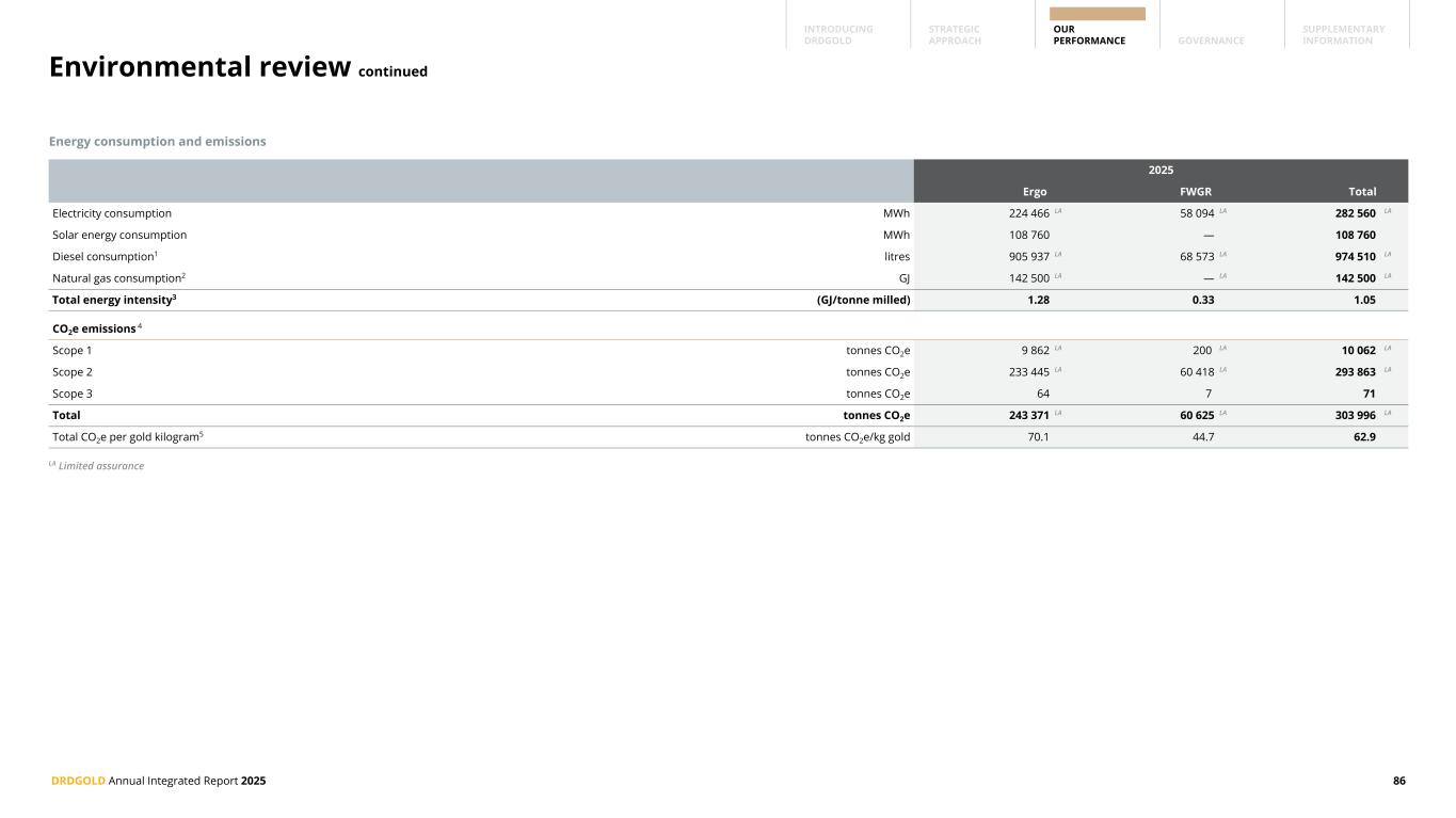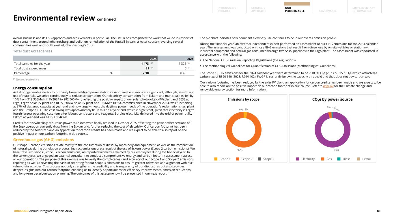 overall business and its ESG approach and achievements in particular. The DMPR has recognised the work that we do in respect of dust containment around Johannesburg and pollution remediation of the Russell Stream, a water course traversing several communities west and south west of Johannesburg’s CBD. Total dust exceedances 2025 2024 Total samples for the year 1 473 LA 1 326 LA Total dust exceedances 31 LA 6 LA Percentage % 2.10 0.45 LA Limited assurance Energy consumption As Eskom generates electricity primarily from coal-fired power stations, our indirect emissions are significant, although, as with our use of materials, we strive continuously to reduce consumption. Our electricity consumption from Eskom and municipalities fell by 10% from 312 333Mwh in FY2024 to 282 560Mwh, reflecting the positive impact of our solar photovoltaic (PV) plant and BESS at Ergo. Ergo’s Solar PV plant and BESS (60MW solar PV plant and 160MWh BESS), commissioned in November 2024, was functioning at 97% of designed capacity at year-end and now largely meets the daytime power needs of the operation’s reclamation sites, plant and the Brakpan TSF. The cost saving was approximately R108 million at year-end, which is significant, given that electricity is Ergo’s fourth-largest operating cost item after labour, contractors and reagents. Surplus electricity delivered into the grid of power utility Eskom at year-end was 41 791 804kWh. Credits for this ‘wheeling’ of surplus power to Eskom were finally realised in October 2025 offsetting the power other sections of the Ergo operation currently draw from the Eskom grid, further reducing the cost of electricity. Our carbon footprint has been reduced by the solar PV plant; an application for carbon credits has been made and we expect to be able to also report on the positive impact on our carbon footprint in due course. Greenhouse gas (GHG) emissions Our scope 1 carbon emissions relate mostly to the consumption of diesel by machinery and equipment, as well as the combustion of natural gas during our elution process. Indirect emissions are a result of the use of Eskom power (Scope 2 carbon emissions). We base travel emissions (Scope 3 carbon emissions) on reported kilometres claimed by our employees during the financial year. In the current year, we engaged an external consultant to conduct a comprehensive energy and carbon footprint assessment across all our operations. The purpose of this exercise was to verify the completeness and accuracy of our Scope 1 and Scope 2 emissions reporting as well as revisiting the basis of reporting for our Scope 3 emissions to ensure greater relevance and alignment with our value chain activities. This process not only strengthens the credibility and transparency of our disclosures but also provides deeper insights into our carbon footprint, enabling us to identify opportunities for efficiency improvements, emission reductions, and long-term decarbonisation planning. The outcomes of this assessment will be presented in our next report. The pie chart indicates how dominant electricity use continues to be in our overall emission profile. During the financial year, an external independent expert performed an assessment of our GHG emissions for the 2024 calendar year. The assessment was conducted on those GHG emissions that result from diesel use by on-site vehicles or stationary industrial equipment and natural gas consumed through two Sasol pipelines to the Ergo plant. The assessment was conducted in accordance with the following: • The National GHG Emission Reporting Regulations (the regulations) • The Methodological Guidelines for Quantification of GHG Emissions (Methodological Guidelines) The Scope 1 GHG emissions for the 2024 calendar year were determined to be 7 189 tCO2e (2023: 5 975 tCO2e) which attracted a carbon tax of R390 640 (2023: R294 402). FWGR is currently below the capacity threshold and thus does not pay carbon tax. Our carbon footprint has been reduced by the solar PV plant, an application for carbon credits has been made and we expect to be able to also report on the positive impact on our carbon footprint in due course. Refer to page 62 for the Climate change and renewable energy section for more information. Emissions by scope 3% 97% 0% Scope 1 Scope 2 Scope 3 CO2e by power source 96% 3% 1% 0% Electricity Gas Diesel Petrol INTRODUCING DRDGOLD STRATEGIC APPROACH OUR PERFORMANCE GOVERNANCE SUPPLEMENTARY INFORMATION Environmental review continued DRDGOLD Annual Integrated Report 2025 85 CO2e by po rce