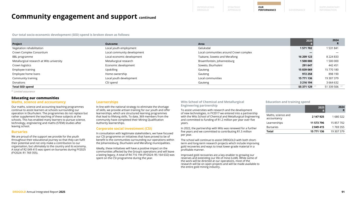 Our total socio-economic development (SED) spend is broken down as follows: Project Outcome Area 2025 R 2024 R Vegetation rehabilitation Local youth employment Geluksdal 1 571 702 1 531 841 Crown Complex Consortium Local community development Local communities around Crown complex — — BBL programme Local economic development Tsakane, Soweto and Merafong 16 209 123 8 224 833 Metallurgical research at Wits university Metallurgical research Braamfontein, Johannesburg 1 500 000 1 500 000 Crown logistics Economic development Soweto, Ekurhuleni 291 647 442 451 Employee training Upskilling Gauteng 15 839 069 15 770 180 Employee home loans Home ownership Gauteng 972 258 898 190 Community training Local youth development Local communities 15 771 136 19 307 379 Donations CSI spend Gauteng 3 216 194 3 664 632 Total SED spend 55 371 129 LA 51 339 506 LA LA Limited assurance Educating our communities Maths, science and accountancy Our maths, science and accounting teaching programmes continue to assist learners at schools surrounding our operation in Ekurhuleni. The programmes do not replace but rather supplement the teaching of these subjects at the schools. This has enabled many learners to pursue science, technology, engineering and maths (STEM) studies after leaving school. Bursaries We are proud of the support we provide for the youth throughout their educational journey so that they can fulfil their potential and not only make a contribution to our organisation, but ultimately to the country and its economy. A total of R2 049 415 was spent on bursaries during FY2025 (FY2024: R1 769 355). Learnerships In line with the national strategy to eliminate the shortage of skills, we provide artisan training for our youth and offer learnerships, which are structured learning programmes that lead to lifelong skills. To date, 369 members from the community have completed their Mining Qualification Authority learnerships. Corporate social investment (CSI) In consultation with legitimate stakeholders, we have focused our CSI programme on initiatives that have proved to be of benefit to the communities surrounding our operations within the Johannesburg, Ekurhuleni and Merafong municipalities. Ideally, these initiatives will have a positive impact on the communities affected by the Group’s operations and will leave a lasting legacy. A total of R4 716 194 (FY2024: R5 164 632) was spent on the CSI programme during the year. Wits School of Chemical and Metallurgical Engineering partnership To assist universities with research and the development of new technologies, in FY2017 we entered into a partnership with the Wits School of Chemical and Metallurgical Engineering and committed to funding of R1.2 million per year over five years. In 2022, the partnership with Wits was renewed for a further five years and we committed to contributing R1.5 million per year. The school will continue to assist DRDGOLD with both short- term and long-term research projects which include improving gold recoveries and ways to treat lower-grade material in a profitable manner. Improved gold recoveries are a key enabler to growing our reserves and extending our life of mine (LoM). While some of the work will be directed at our operations, most of the research will be on open projects and will be made available to the entire gold mining industry. Education and training spend 2025 R 2024 R Maths, science and accountancy 2 147 925 1 680 322 Learnerships 11 573 796 15 857 702 Bursaries 2 049 415 1 769 355 Total 15 771 136 19 307 379 INTRODUCING DRDGOLD STRATEGIC APPROACH OUR PERFORMANCE GOVERNANCE SUPPLEMENTARY INFORMATION Community engagement and support continued DRDGOLD Annual Integrated Report 2025 91