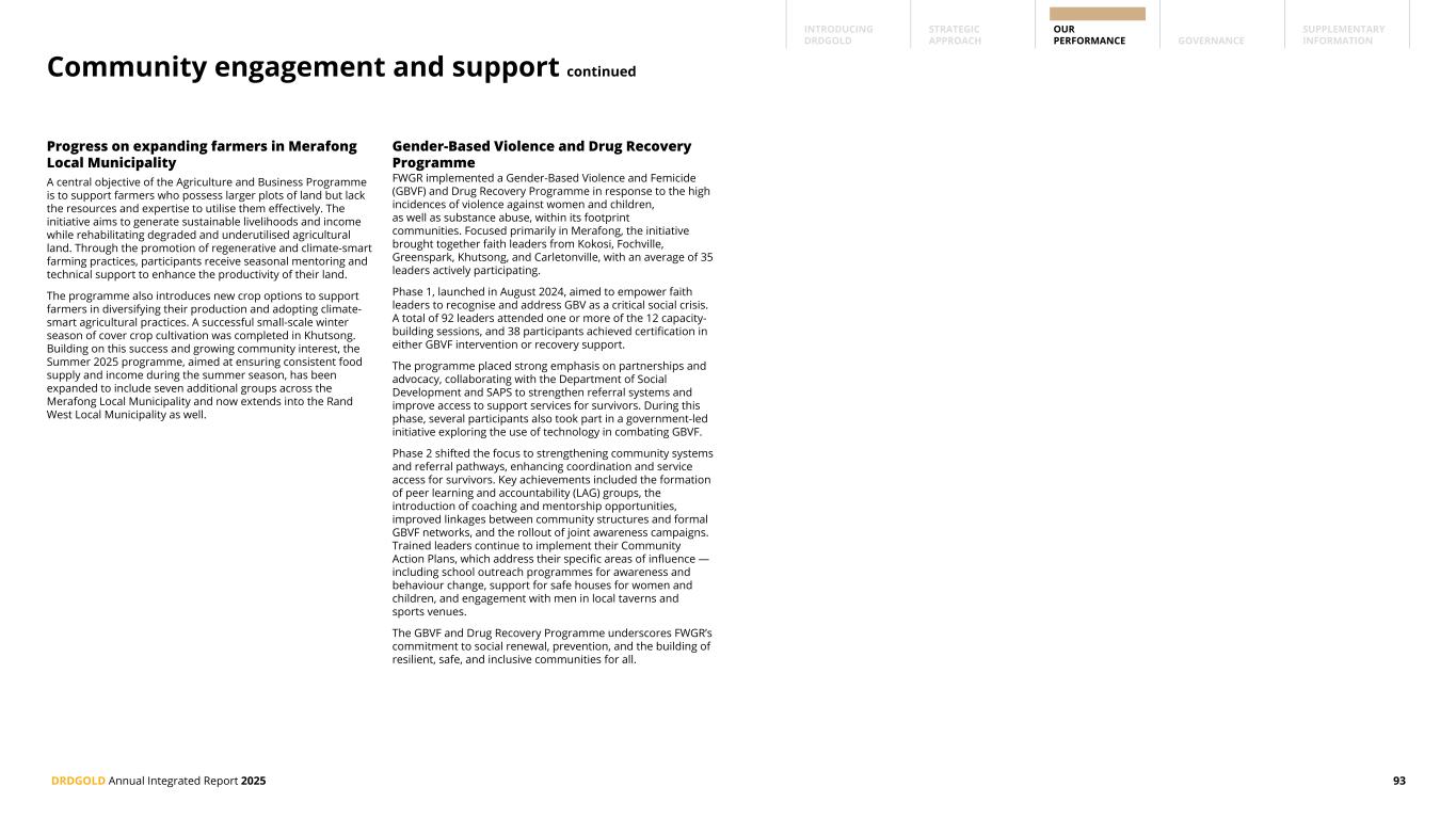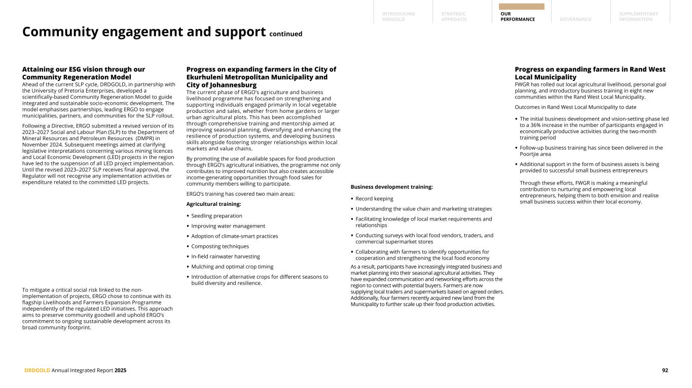 Attaining our ESG vision through our Community Regeneration Model Ahead of the current SLP cycle, DRDGOLD, in partnership with the University of Pretoria Enterprises, developed a scientifically-based Community Regeneration Model to guide integrated and sustainable socio-economic development. The model emphasises partnerships, leading ERGO to engage municipalities, partners, and communities for the SLP rollout. Following a Directive, ERGO submitted a revised version of its 2023–2027 Social and Labour Plan (SLP) to the Department of Mineral Resources and Petroleum Resources (DMPR) in November 2024. Subsequent meetings aimed at clarifying legislative interpretations concerning various mining licences and Local Economic Development (LED) projects in the region have led to the suspension of all LED project implementation. Until the revised 2023–2027 SLP receives final approval, the Regulator will not recognise any implementation activities or expenditure related to the committed LED projects. To mitigate a critical social risk linked to the non- implementation of projects, ERGO chose to continue with its flagship Livelihoods and Farmers Expansion Programme independently of the regulated LED initiatives. This approach aims to preserve community goodwill and uphold ERGO’s commitment to ongoing sustainable development across its broad community footprint. Progress on expanding farmers in the City of Ekurhuleni Metropolitan Municipality and City of Johannesburg The current phase of ERGO’s agriculture and business livelihood programme has focused on strengthening and supporting individuals engaged primarily in local vegetable production and sales, whether from home gardens or larger urban agricultural plots. This has been accomplished through comprehensive training and mentorship aimed at improving seasonal planning, diversifying and enhancing the resilience of production systems, and developing business skills alongside fostering stronger relationships within local markets and value chains. By promoting the use of available spaces for food production through ERGO’s agricultural initiatives, the programme not only contributes to improved nutrition but also creates accessible income-generating opportunities through food sales for community members willing to participate. ERGO’s training has covered two main areas: Agricultural training: • Seedling preparation • Improving water management • Adoption of climate-smart practices • Composting techniques • In-field rainwater harvesting • Mulching and optimal crop timing • Introduction of alternative crops for different seasons to build diversity and resilience. Business development training: • Record keeping • Understanding the value chain and marketing strategies • Facilitating knowledge of local market requirements and relationships • Conducting surveys with local food vendors, traders, and commercial supermarket stores • Collaborating with farmers to identify opportunities for cooperation and strengthening the local food economy As a result, participants have increasingly integrated business and market planning into their seasonal agricultural activities. They have expanded communication and networking efforts across the region to connect with potential buyers. Farmers are now supplying local traders and supermarkets based on agreed orders. Additionally, four farmers recently acquired new land from the Municipality to further scale up their food production activities. Progress on expanding farmers in Rand West Local Municipality FWGR has rolled out local agricultural livelihood, personal goal planning, and introductory business training in eight new communities within the Rand West Local Municipality. Outcomes in Rand West Local Municipality to date • The initial business development and vision-setting phase led to a 36% increase in the number of participants engaged in economically productive activities during the two-month training period • Follow-up business training has since been delivered in the Poortjie area • Additional support in the form of business assets is being provided to successful small business entrepreneurs Through these efforts, FWGR is making a meaningful contribution to nurturing and empowering local entrepreneurs, helping them to both envision and realise small business success within their local economy. INTRODUCING DRDGOLD STRATEGIC APPROACH OUR PERFORMANCE GOVERNANCE SUPPLEMENTARY INFORMATION Community engagement and support continued DRDGOLD Annual Integrated Report 2025 92