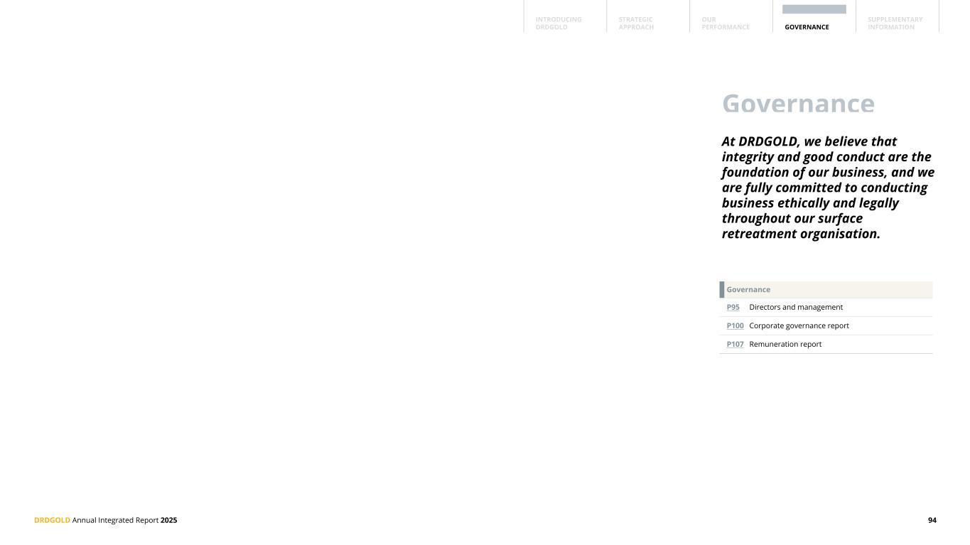 Governance At DRDGOLD, we believe that integrity and good conduct are the foundation of our business, and we are fully committed to conducting business ethically and legally throughout our surface retreatment organisation. Governance P95 Directors and management P100 Corporate governance report P107 Remuneration report INTRODUCING DRDGOLD STRATEGIC APPROACH OUR PERFORMANCE GOVERNANCE SUPPLEMENTARY INFORMATION DRDGOLD Annual Integrated Report 2025 94
