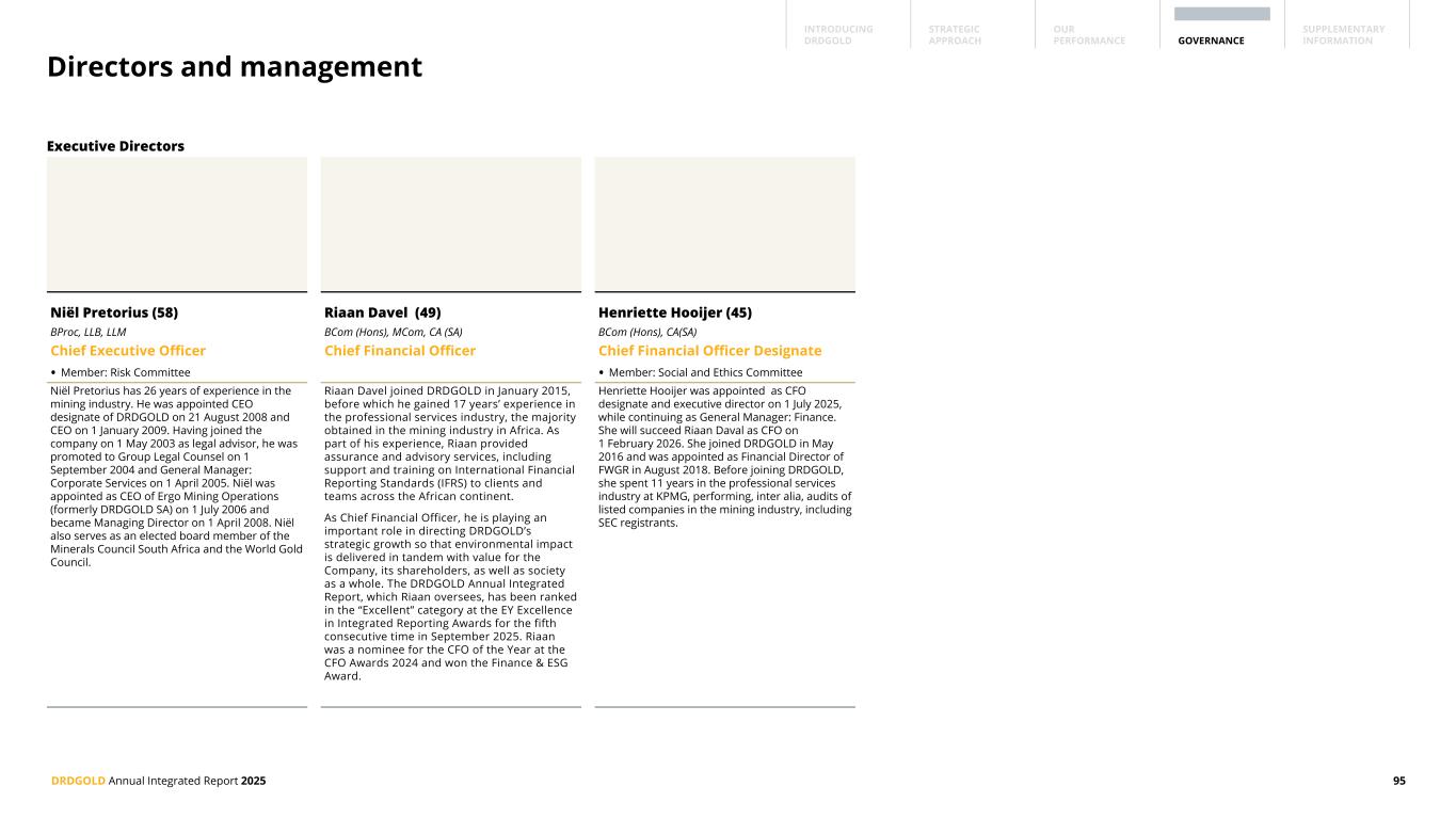 Executive Directors Niël Pretorius (58) Riaan Davel (49) Henriette Hooijer (45) BProc, LLB, LLM BCom (Hons), MCom, CA (SA) BCom (Hons), CA(SA) Chief Executive Officer Chief Financial Officer Chief Financial Officer Designate • Member: Risk Committee • Member: Social and Ethics Committee Niël Pretorius has 26 years of experience in the mining industry. He was appointed CEO designate of DRDGOLD on 21 August 2008 and CEO on 1 January 2009. Having joined the company on 1 May 2003 as legal advisor, he was promoted to Group Legal Counsel on 1 September 2004 and General Manager: Corporate Services on 1 April 2005. Niël was appointed as CEO of Ergo Mining Operations (formerly DRDGOLD SA) on 1 July 2006 and became Managing Director on 1 April 2008. Niël also serves as an elected board member of the Minerals Council South Africa and the World Gold Council. Riaan Davel joined DRDGOLD in January 2015, before which he gained 17 years’ experience in the professional services industry, the majority obtained in the mining industry in Africa. As part of his experience, Riaan provided assurance and advisory services, including support and training on International Financial Reporting Standards (IFRS) to clients and teams across the African continent. As Chief Financial Officer, he is playing an important role in directing DRDGOLD’s strategic growth so that environmental impact is delivered in tandem with value for the Company, its shareholders, as well as society as a whole. The DRDGOLD Annual Integrated Report, which Riaan oversees, has been ranked in the “Excellent” category at the EY Excellence in Integrated Reporting Awards for the fifth consecutive time in September 2025. Riaan was a nominee for the CFO of the Year at the CFO Awards 2024 and won the Finance & ESG Award. Henriette Hooijer was appointed as CFO designate and executive director on 1 July 2025, while continuing as General Manager: Finance. She will succeed Riaan Daval as CFO on 1 February 2026. She joined DRDGOLD in May 2016 and was appointed as Financial Director of FWGR in August 2018. Before joining DRDGOLD, she spent 11 years in the professional services industry at KPMG, performing, inter alia, audits of listed companies in the mining industry, including SEC registrants. INTRODUCING DRDGOLD STRATEGIC APPROACH OUR PERFORMANCE GOVERNANCE SUPPLEMENTARY INFORMATION Directors and management DRDGOLD Annual Integrated Report 2025 95