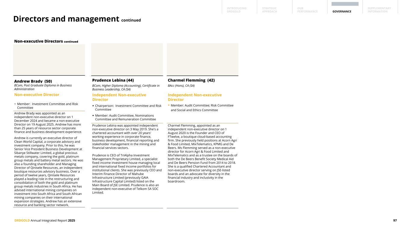 Non-executive Directors continued Andrew Brady (50) BCom, Post Graduate Diploma in Business Administration Non-executive Director • Member: Investment Committee and Risk Committee Andrew Brady was appointed as an independent non-executive director on 1 December 2024 and became a non-executive Director on 19 August 2025. Andrew has more than 25 years of resource sector corporate finance and business development experience. Andrew is currently an executive director of Clean World Capital, a corporate advisory and investment company. Prior to this, he was Senior Vice President Business Development at Sibanye Stillwater Limited, a global precious metals company, covering the gold, platinum group metals and battery metal sectors. He was also a founding shareholder and Managing Director of Qinisele Resources, an independent boutique resources advisory business. Over a period of twelve years, Qinisele Resources played a leading role in the restructuring and consolidation of both the gold and platinum group metals industries in South Africa. He has advised international mining companies on investment into South Africa and South African mining companies on their international expansion strategies. Andrew has an extensive resource and banking sector network. Prudence Lebina (44) Charmel Flemming (42) BCom, Higher Diploma (Accounting), Certificate in Business Leadership, CA (SA) BAcc (Hons), CA (SA) Independent Non-executive Director Independent Non-executive Director • Chairperson: Investment Committee and Risk Committee • Member: Audit Committee, Nominations Committee and Remuneration Committee • Member: Audit Committee; Risk Committee and Social and Ethics Committee Prudence Lebina was appointed independent non-executive director on 3 May 2019. She's a chartered accountant with over 20 years' working experience in corporate finance, business development, financial reporting and stakeholder management in the mining and financial services sectors. Prudence is CEO of TriAlpha Investment Management Proprietary Limited, a specialist fixed income investment house managing local and international fixed income portfolios for institutional clients. She was previously CEO and Interim Finance Director of Mahube Infrastructure Limited (previously GAIA Infrastructure Capital Limited) listed on the Main Board of JSE Limited. Prudence is also an independent non-executive of Telkom SA SOC Limited. Charmel Flemming, appointed as an independent non-executive director on 1 August 2020 is the Founder and CEO of FTwelve, a boutique cloud-based accounting firm. She previously held positions at Acorn Agri & Food Limited, MixTelematics, KPMG and De Beers. Ms Flemming served as a non-executive director for Acorn Agri & Food Limited and MixTelematics and as a trustee on the boards of both the De Beers Benefit Society Medical Aid and De Beers Pension Fund from 2014 to 2018. She is a qualified Chartered Accountant and non-executive director serving on JSE-listed boards and an advocate for diversity in the financial industry and inclusivity in the boardroom. INTRODUCING DRDGOLD STRATEGIC APPROACH OUR PERFORMANCE GOVERNANCE SUPPLEMENTARY INFORMATION Directors and management continued DRDGOLD Annual Integrated Report 2025 97