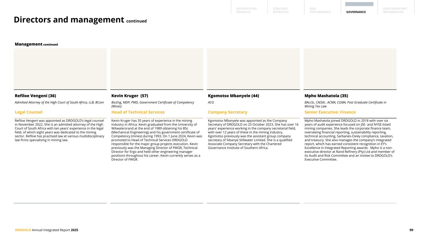 Management continued Refiloe Vengeni (36) Kevin Kruger (57) Kgomotso Mbanyele (44) Mpho Mashatola (35) Admitted Attorney of the High Court of South Africa, LLB, BCom BscEng, MDP, PMD, Government Certificate of Competency (Mines) ACG BAccSc, CA(SA) , ACMA, CGMA, Post Graduate Certificate in Mining Tax Law Legal Counsel Head of Technical Services Company Secretary Senior Executive: Finance Refiloe Vengeni was appointed as DRDGOLD’s legal counsel in November 2022. She is an admitted attorney of the High Court of South Africa with ten years’ experience in the legal field, of which eight years was dedicated to the mining sector. Refiloe has practised law at various multidisciplinary law firms specialising in mining law. Kevin Kruger has 35 years of experience in the mining industry in Africa. Kevin graduated from the University of Witwatersrand at the end of 1989 obtaining his BSc (Mechanical Engineering) and his government certificate of Competency (mines) during 1993. On 1 June 2024, Kevin was promoted to Head of Technical Services DRDGOLD responsible for the major group projects execution. Kevin previously was the Managing Director of FWGR, Technical Director for Ergo and held other engineering manager positions throughout his career. Kevin currently serves as a Director of FWGR. Kgomotso Mbanyele was appointed as the Company Secretary of DRDGOLD on 25 October 2023. She has over 16 years' experience working in the company secretarial field, with over 12 years of these in the mining industry. Kgomotso previously was the assistant group company secretary of Sibanye Stillwater Limited. She is a qualified Associate Company Secretary with the Chartered Governance Institute of Southern Africa. Mpho Mashatola joined DRDGOLD in 2018 with over six years of audit experience focused on JSE- and NYSE-listed mining companies. She leads the corporate finance team, overseeing financial reporting, sustainability reporting, technical accounting, Sarbanes-Oxley compliance, taxation, and treasury. She also manages the company’s integrated report, which has earned consistent recognition in EY’s Excellence in Integrated Reporting awards. Mpho is a non- executive director at Rand Refinery (Pty) Ltd and member of its Audit and Risk Committee and an invitee to DRDGOLD’s Executive Committee. INTRODUCING DRDGOLD STRATEGIC APPROACH OUR PERFORMANCE GOVERNANCE SUPPLEMENTARY INFORMATION Directors and management continued DRDGOLD Annual Integrated Report 2025 99