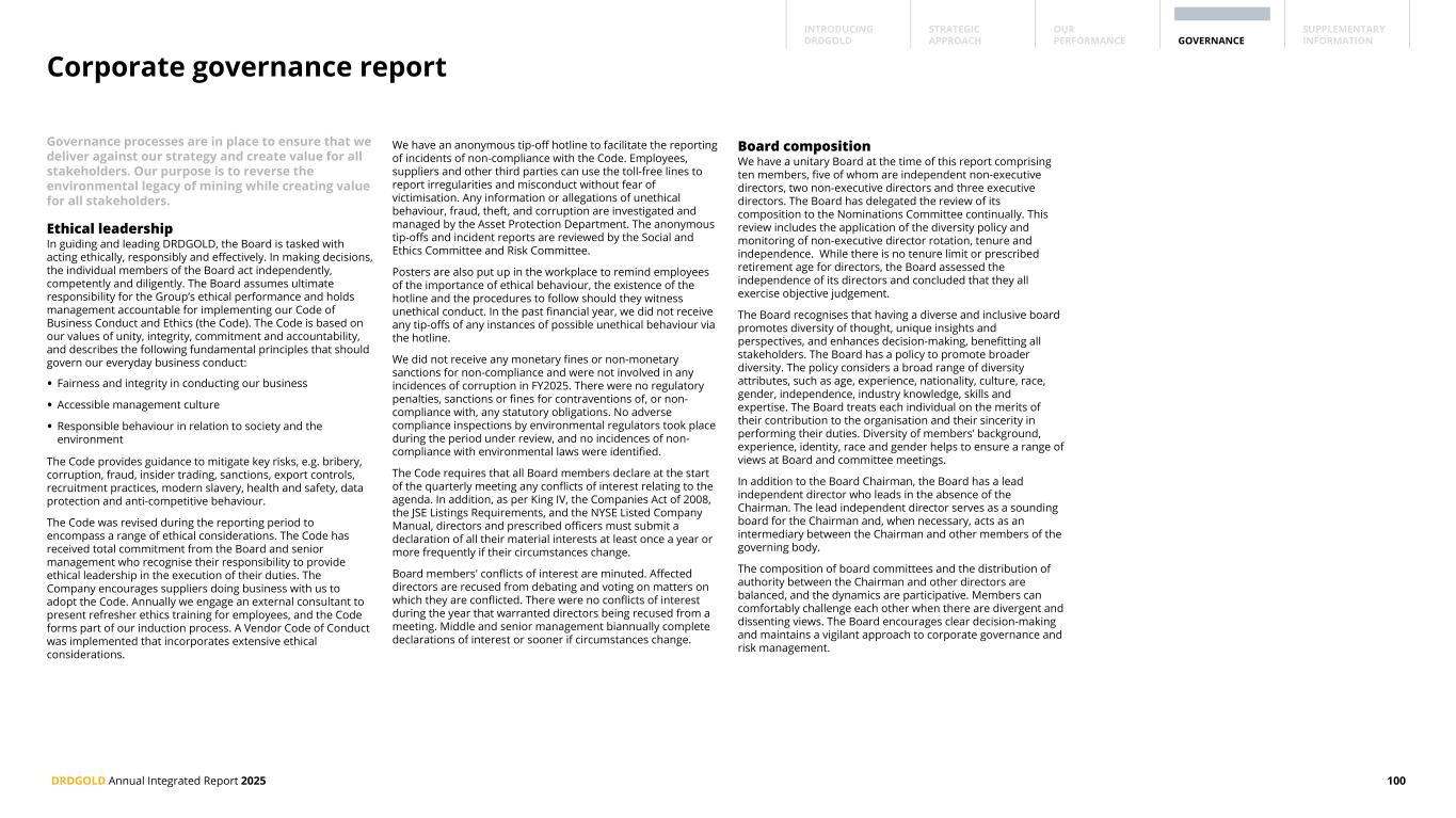 Governance processes are in place to ensure that we deliver against our strategy and create value for all stakeholders. Our purpose is to reverse the environmental legacy of mining while creating value for all stakeholders. Ethical leadership In guiding and leading DRDGOLD, the Board is tasked with acting ethically, responsibly and effectively. In making decisions, the individual members of the Board act independently, competently and diligently. The Board assumes ultimate responsibility for the Group’s ethical performance and holds management accountable for implementing our Code of Business Conduct and Ethics (the Code). The Code is based on our values of unity, integrity, commitment and accountability, and describes the following fundamental principles that should govern our everyday business conduct: • Fairness and integrity in conducting our business • Accessible management culture • Responsible behaviour in relation to society and the environment The Code provides guidance to mitigate key risks, e.g. bribery, corruption, fraud, insider trading, sanctions, export controls, recruitment practices, modern slavery, health and safety, data protection and anti-competitive behaviour. The Code was revised during the reporting period to encompass a range of ethical considerations. The Code has received total commitment from the Board and senior management who recognise their responsibility to provide ethical leadership in the execution of their duties. The Company encourages suppliers doing business with us to adopt the Code. Annually we engage an external consultant to present refresher ethics training for employees, and the Code forms part of our induction process. A Vendor Code of Conduct was implemented that incorporates extensive ethical considerations. We have an anonymous tip-off hotline to facilitate the reporting of incidents of non-compliance with the Code. Employees, suppliers and other third parties can use the toll-free lines to report irregularities and misconduct without fear of victimisation. Any information or allegations of unethical behaviour, fraud, theft, and corruption are investigated and managed by the Asset Protection Department. The anonymous tip-offs and incident reports are reviewed by the Social and Ethics Committee and Risk Committee. Posters are also put up in the workplace to remind employees of the importance of ethical behaviour, the existence of the hotline and the procedures to follow should they witness unethical conduct. In the past financial year, we did not receive any tip-offs of any instances of possible unethical behaviour via the hotline. We did not receive any monetary fines or non-monetary sanctions for non-compliance and were not involved in any incidences of corruption in FY2025. There were no regulatory penalties, sanctions or fines for contraventions of, or non- compliance with, any statutory obligations. No adverse compliance inspections by environmental regulators took place during the period under review, and no incidences of non- compliance with environmental laws were identified. The Code requires that all Board members declare at the start of the quarterly meeting any conflicts of interest relating to the agenda. In addition, as per King IV, the Companies Act of 2008, the JSE Listings Requirements, and the NYSE Listed Company Manual, directors and prescribed officers must submit a declaration of all their material interests at least once a year or more frequently if their circumstances change. Board members' conflicts of interest are minuted. Affected directors are recused from debating and voting on matters on which they are conflicted. There were no conflicts of interest during the year that warranted directors being recused from a meeting. Middle and senior management biannually complete declarations of interest or sooner if circumstances change. Board composition We have a unitary Board at the time of this report comprising ten members, five of whom are independent non-executive directors, two non-executive directors and three executive directors. The Board has delegated the review of its composition to the Nominations Committee continually. This review includes the application of the diversity policy and monitoring of non-executive director rotation, tenure and independence. While there is no tenure limit or prescribed retirement age for directors, the Board assessed the independence of its directors and concluded that they all exercise objective judgement. The Board recognises that having a diverse and inclusive board promotes diversity of thought, unique insights and perspectives, and enhances decision-making, benefitting all stakeholders. The Board has a policy to promote broader diversity. The policy considers a broad range of diversity attributes, such as age, experience, nationality, culture, race, gender, independence, industry knowledge, skills and expertise. The Board treats each individual on the merits of their contribution to the organisation and their sincerity in performing their duties. Diversity of members’ background, experience, identity, race and gender helps to ensure a range of views at Board and committee meetings. In addition to the Board Chairman, the Board has a lead independent director who leads in the absence of the Chairman. The lead independent director serves as a sounding board for the Chairman and, when necessary, acts as an intermediary between the Chairman and other members of the governing body. The composition of board committees and the distribution of authority between the Chairman and other directors are balanced, and the dynamics are participative. Members can comfortably challenge each other when there are divergent and dissenting views. The Board encourages clear decision-making and maintains a vigilant approach to corporate governance and risk management. INTRODUCING DRDGOLD STRATEGIC APPROACH OUR PERFORMANCE GOVERNANCE SUPPLEMENTARY INFORMATION Corporate governance report DRDGO