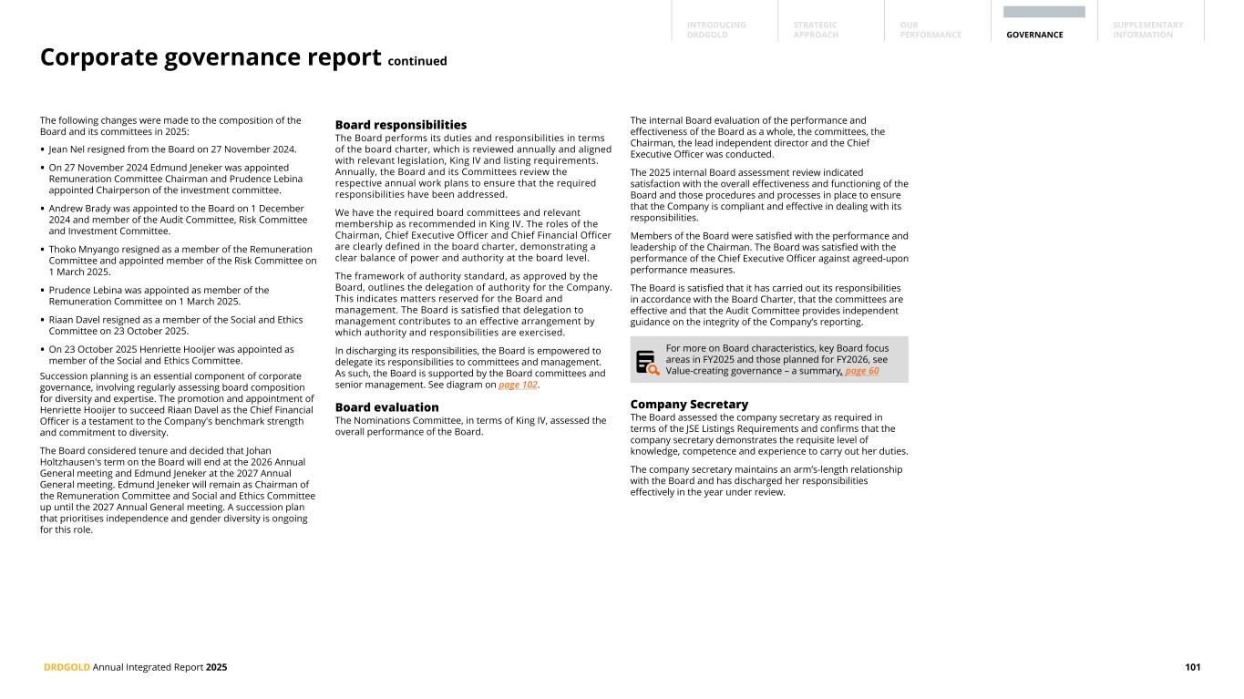 The following changes were made to the composition of the Board and its committees in 2025: • Jean Nel resigned from the Board on 27 November 2024. • On 27 November 2024 Edmund Jeneker was appointed Remuneration Committee Chairman and Prudence Lebina appointed Chairperson of the investment committee. • Andrew Brady was appointed to the Board on 1 December 2024 and member of the Audit Committee, Risk Committee and Investment Committee. • Thoko Mnyango resigned as a member of the Remuneration Committee and appointed member of the Risk Committee on 1 March 2025. • Prudence Lebina was appointed as member of the Remuneration Committee on 1 March 2025. • Riaan Davel resigned as a member of the Social and Ethics Committee on 23 October 2025. • On 23 October 2025 Henriette Hooijer was appointed as member of the Social and Ethics Committee. Succession planning is an essential component of corporate governance, involving regularly assessing board composition for diversity and expertise. The promotion and appointment of Henriette Hooijer to succeed Riaan Davel as the Chief Financial Officer is a testament to the Company's benchmark strength and commitment to diversity. The Board considered tenure and decided that Johan Holtzhausen's term on the Board will end at the 2026 Annual General meeting and Edmund Jeneker at the 2027 Annual General meeting. Edmund Jeneker will remain as Chairman of the Remuneration Committee and Social and Ethics Committee up until the 2027 Annual General meeting. A succession plan that prioritises independence and gender diversity is ongoing for this role. Board responsibilities The Board performs its duties and responsibilities in terms of the board charter, which is reviewed annually and aligned with relevant legislation, King IV and listing requirements. Annually, the Board and its Committees review the respective annual work plans to ensure that the required responsibilities have been addressed. We have the required board committees and relevant membership as recommended in King IV. The roles of the Chairman, Chief Executive Officer and Chief Financial Officer are clearly defined in the board charter, demonstrating a clear balance of power and authority at the board level. The framework of authority standard, as approved by the Board, outlines the delegation of authority for the Company. This indicates matters reserved for the Board and management. The Board is satisfied that delegation to management contributes to an effective arrangement by which authority and responsibilities are exercised. In discharging its responsibilities, the Board is empowered to delegate its responsibilities to committees and management. As such, the Board is supported by the Board committees and senior management. See diagram on page 102. Board evaluation The Nominations Committee, in terms of King IV, assessed the overall performance of the Board. The internal Board evaluation of the performance and effectiveness of the Board as a whole, the committees, the Chairman, the lead independent director and the Chief Executive Officer was conducted. The 2025 internal Board assessment review indicated satisfaction with the overall effectiveness and functioning of the Board and those procedures and processes in place to ensure that the Company is compliant and effective in dealing with its responsibilities. Members of the Board were satisfied with the performance and leadership of the Chairman. The Board was satisfied with the performance of the Chief Executive Officer against agreed-upon performance measures. The Board is satisfied that it has carried out its responsibilities in accordance with the Board Charter, that the committees are effective and that the Audit Committee provides independent guidance on the integrity of the Company’s reporting. For more on Board characteristics, key Board focus areas in FY2025 and those planned for FY2026, see Value-creating governance – a summary, page 60 Company Secretary The Board assessed the company secretary as required in terms of the JSE Listings Requirements and confirms that the company secretary demonstrates the requisite level of knowledge, competence and experience to carry out her duties. The company secretary maintains an arm’s-length relationship with the Board and has discharged her responsibilities effectively in the year under review. INTRODUCING DRDGOLD STRATEGIC APPROACH OUR PERFORMANCE GOVERNANCE SUPPLEMENTARY INFORMATION Corporate governance report continued DRDGOLD Annual Integrated Report 2025 101