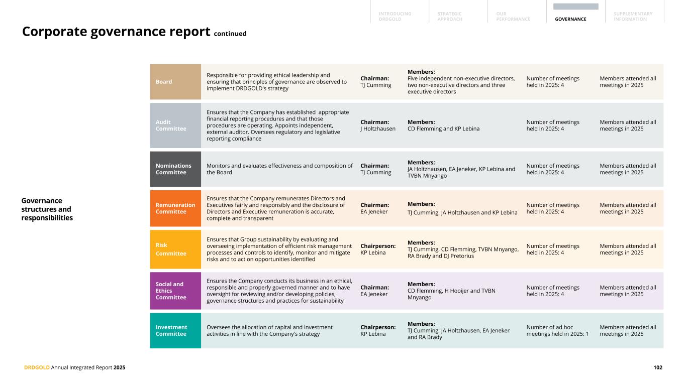 Board Responsible for providing ethical leadership and ensuring that principles of governance are observed to implement DRDGOLD's strategy Chairman: TJ Cumming Members: Five independent non-executive directors, two non-executive directors and three executive directors Number of meetings held in 2025: 4 Members attended all meetings in 2025 Audit Committee Ensures that the Company has established appropriate financial reporting procedures and that those procedures are operating. Appoints independent, external auditor. Oversees regulatory and legislative reporting compliance Chairman: J Holtzhausen Members: CD Flemming and KP Lebina Number of meetings held in 2025: 4 Members attended all meetings in 2025 Nominations Committee Monitors and evaluates effectiveness and composition of the Board Chairman: TJ Cumming Members: JA Holtzhausen, EA Jeneker, KP Lebina and TVBN Mnyango Number of meetings held in 2025: 4 Members attended all meetings in 2025 Remuneration Committee Ensures that the Company remunerates Directors and Executives fairly and responsibly and the disclosure of Directors and Executive remuneration is accurate, complete and transparent Chairman: EA Jeneker Members: TJ Cumming, JA Holtzhausen and KP Lebina Number of meetings held in 2025: 4 Members attended all meetings in 2025 Risk Committee Ensures that Group sustainability by evaluating and overseeing implementation of efficient risk management processes and controls to identify, monitor and mitigate risks and to act on opportunities identified Chairperson: KP Lebina Members: TJ Cumming, CD Flemming, TVBN Mnyango, RA Brady and DJ Pretorius Number of meetings held in 2025: 4 Members attended all meetings in 2025 Social and Ethics Committee Ensures the Company conducts its business in an ethical, responsible and properly governed manner and to have oversight for reviewing and/or developing policies, governance structures and practices for sustainability Chairman: EA Jeneker Members: CD Flemming, H Hooijer and TVBN Mnyango Number of meetings held in 2025: 4 Members attended all meetings in 2025 Investment Committee Oversees the allocation of capital and investment activities in line with the Company's strategy Chairperson: KP Lebina Members: TJ Cumming, JA Holtzhausen, EA Jeneker and RA Brady Number of ad hoc meetings held in 2025: 1 Members attended all meetings in 2025 INTRODUCING DRDGOLD STRATEGIC APPROACH OUR PERFORMANCE GOVERNANCE SUPPLEMENTARY INFORMATION Corporate governance report continued DRDGOLD Annual Integrated Report 2025 102 Governance structures and responsibilities