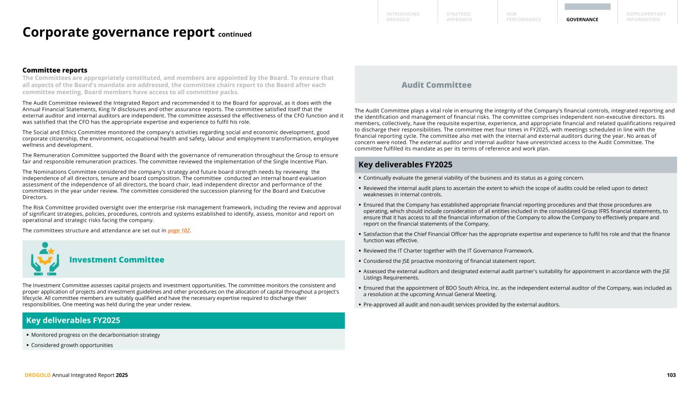 Committee reports The Committees are appropriately constituted, and members are appointed by the Board. To ensure that all aspects of the Board's mandate are addressed, the committee chairs report to the Board after each committee meeting. Board members have access to all committee packs. The Audit Committee reviewed the Integrated Report and recommended it to the Board for approval, as it does with the Annual Financial Statements, King IV disclosures and other assurance reports. The committee satisfied itself that the external auditor and internal auditors are independent. The committee assessed the effectiveness of the CFO function and it was satisfied that the CFO has the appropriate expertise and experience to fulfil his role. The Social and Ethics Committee monitored the company's activities regarding social and economic development, good corporate citizenship, the environment, occupational health and safety, labour and employment transformation, employee wellness and development. The Remuneration Committee supported the Board with the governance of remuneration throughout the Group to ensure fair and responsible remuneration practices. The committee reviewed the implementation of the Single Incentive Plan. The Nominations Committee considered the company's strategy and future board strength needs by reviewing the independence of all directors, tenure and board composition. The committee conducted an internal board evaluation assessment of the independence of all directors, the board chair, lead independent director and performance of the committees in the year under review. The committee considered the succession planning for the Board and Executive Directors. The Risk Committee provided oversight over the enterprise risk management framework, including the review and approval of significant strategies, policies, procedures, controls and systems established to identify, assess, monitor and report on operational and strategic risks facing the company. The committees structure and attendance are set out in page 102. Investment Committee The Investment Committee assesses capital projects and investment opportunities. The committee monitors the consistent and proper application of projects and investment guidelines and other procedures on the allocation of capital throughout a project's lifecycle. All committee members are suitably qualified and have the necessary expertise required to discharge their responsibilities. One meeting was held during the year under review. Key deliverables FY2025 • Monitored progress on the decarbonisation strategy • Considered growth opportunities Audit Committee The Audit Committee plays a vital role in ensuring the integrity of the Company's financial controls, integrated reporting and the identification and management of financial risks. The committee comprises independent non-executive directors. Its members, collectively, have the requisite expertise, experience, and appropriate financial and related qualifications required to discharge their responsibilities. The committee met four times in FY2025, with meetings scheduled in line with the financial reporting cycle. The committee also met with the internal and external auditors during the year. No areas of concern were noted. The external auditor and internal auditor have unrestricted access to the Audit Committee. The committee fulfilled its mandate as per its terms of reference and work plan. Key deliverables FY2025 • Continually evaluate the general viability of the business and its status as a going concern. • Reviewed the internal audit plans to ascertain the extent to which the scope of audits could be relied upon to detect weaknesses in internal controls. • Ensured that the Company has established appropriate financial reporting procedures and that those procedures are operating, which should include consideration of all entities included in the consolidated Group IFRS financial statements, to ensure that it has access to all the financial information of the Company to allow the Company to effectively prepare and report on the financial statements of the Company. • Satisfaction that the Chief Financial Officer has the appropriate expertise and experience to fulfil his role and that the finance function was effective. • Reviewed the IT Charter together with the IT Governance Framework. • Considered the JSE proactive monitoring of financial statement report. • Assessed the external auditors and designated external audit partner's suitability for appointment in accordance with the JSE Listings Requirements. • Ensured that the appointment of BDO South Africa, Inc. as the independent external auditor of the Company, was included as a resolution at the upcoming Annual General Meeting. • Pre-approved all audit and non-audit services provided by the external auditors. INTRODUCING DRDGOLD STRATEGIC APPROACH OUR PERFORMANCE GOVERNANCE SUPPLEMENTARY INFORMATION Corporate governance report continued DRDGOLD Annual Integrated Report 2025 103