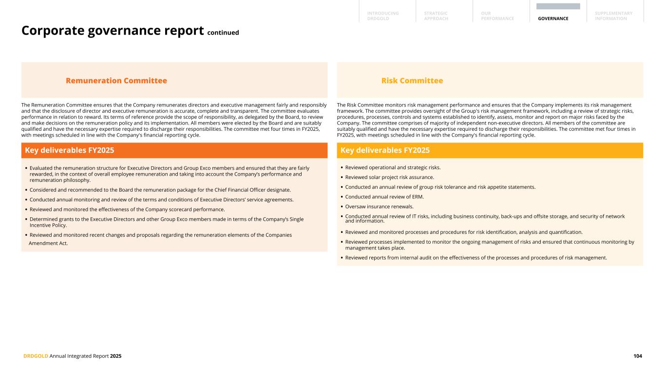 Remuneration Committee The Remuneration Committee ensures that the Company remunerates directors and executive management fairly and responsibly and that the disclosure of director and executive remuneration is accurate, complete and transparent. The committee evaluates performance in relation to reward. Its terms of reference provide the scope of responsibility, as delegated by the Board, to review and make decisions on the remuneration policy and its implementation. All members were elected by the Board and are suitably qualified and have the necessary expertise required to discharge their responsibilities. The committee met four times in FY2025, with meetings scheduled in line with the Company's financial reporting cycle. Key deliverables FY2025 • Evaluated the remuneration structure for Executive Directors and Group Exco members and ensured that they are fairly rewarded, in the context of overall employee remuneration and taking into account the Company’s performance and remuneration philosophy. • Considered and recommended to the Board the remuneration package for the Chief Financial Officer designate. • Conducted annual monitoring and review of the terms and conditions of Executive Directors’ service agreements. • Reviewed and monitored the effectiveness of the Company scorecard performance. • Determined grants to the Executive Directors and other Group Exco members made in terms of the Company’s Single Incentive Policy. • Reviewed and monitored recent changes and proposals regarding the remuneration elements of the Companies Amendment Act. Risk Committee The Risk Committee monitors risk management performance and ensures that the Company implements its risk management framework. The committee provides oversight of the Group's risk management framework, including a review of strategic risks, procedures, processes, controls and systems established to identify, assess, monitor and report on major risks faced by the Company. The committee comprises of majority of independent non-executive directors. All members of the committee are suitably qualified and have the necessary expertise required to discharge their responsibilities. The committee met four times in FY2025, with meetings scheduled in line with the Company's financial reporting cycle. Key deliverables FY2025 • Reviewed operational and strategic risks. • Reviewed solar project risk assurance. • Conducted an annual review of group risk tolerance and risk appetite statements. • Conducted annual review of ERM. • Oversaw insurance renewals. • Conducted annual review of IT risks, including business continuity, back-ups and offsite storage, and security of network and information. • Reviewed and monitored processes and procedures for risk identification, analysis and quantification. • Reviewed processes implemented to monitor the ongoing management of risks and ensured that continuous monitoring by management takes place. • Reviewed reports from internal audit on the effectiveness of the processes and procedures of risk management. INTRODUCING DRDGOLD STRATEGIC APPROACH OUR PERFORMANCE GOVERNANCE SUPPLEMENTARY INFORMATION Corporate governance report continued DRDGOLD Annual Integrated Report 2025 104