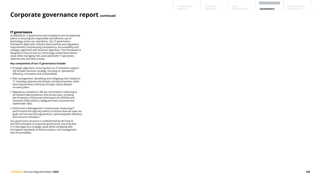 IT governance At DRDGOLD, IT governance and compliance are foundational pillars in ensuring the responsible and effective use of technology across our operations. Our IT governance framework aligns with industry best practices and regulatory requirements, emphasising transparency, accountability and strategic alignment with business objectives. This framework is designed to ensure that our technology investments deliver value while managing risks associated with IT operations, cybersecurity and data privacy. Key components of our IT governance include: • Strategic alignment: ensuring that our IT initiatives support the broader business strategy, focusing on operational efficiency, innovation and sustainability. • Risk management: identifying and mitigating risks related to IT, including cybersecurity threats and data breaches, while ensuring business continuity through robust disaster recovery plans. • Regulatory compliance: We are committed to adhering to all relevant data protection and privacy laws, including the Protection of Personal Information Act (POPIA) and Sarbanes Oxley (SOX) to safeguard both corporate and stakeholder data. • Performance Management: Continuously measuring IT performance through key metrics to ensure that we meet our goals and service-level agreements, optimising both efficiency and resource utilisation. Our governance structure is underpinned by the King IV and SOX principles of corporate governance, ensuring that IT is leveraged as a strategic asset while complying with the highest standards of ethical conduct, risk management and accountability. INTRODUCING DRDGOLD STRATEGIC APPROACH OUR PERFORMANCE GOVERNANCE SUPPLEMENTARY INFORMATION Corporate governance report continued DRDGOLD Annual Integrated Report 2025 106