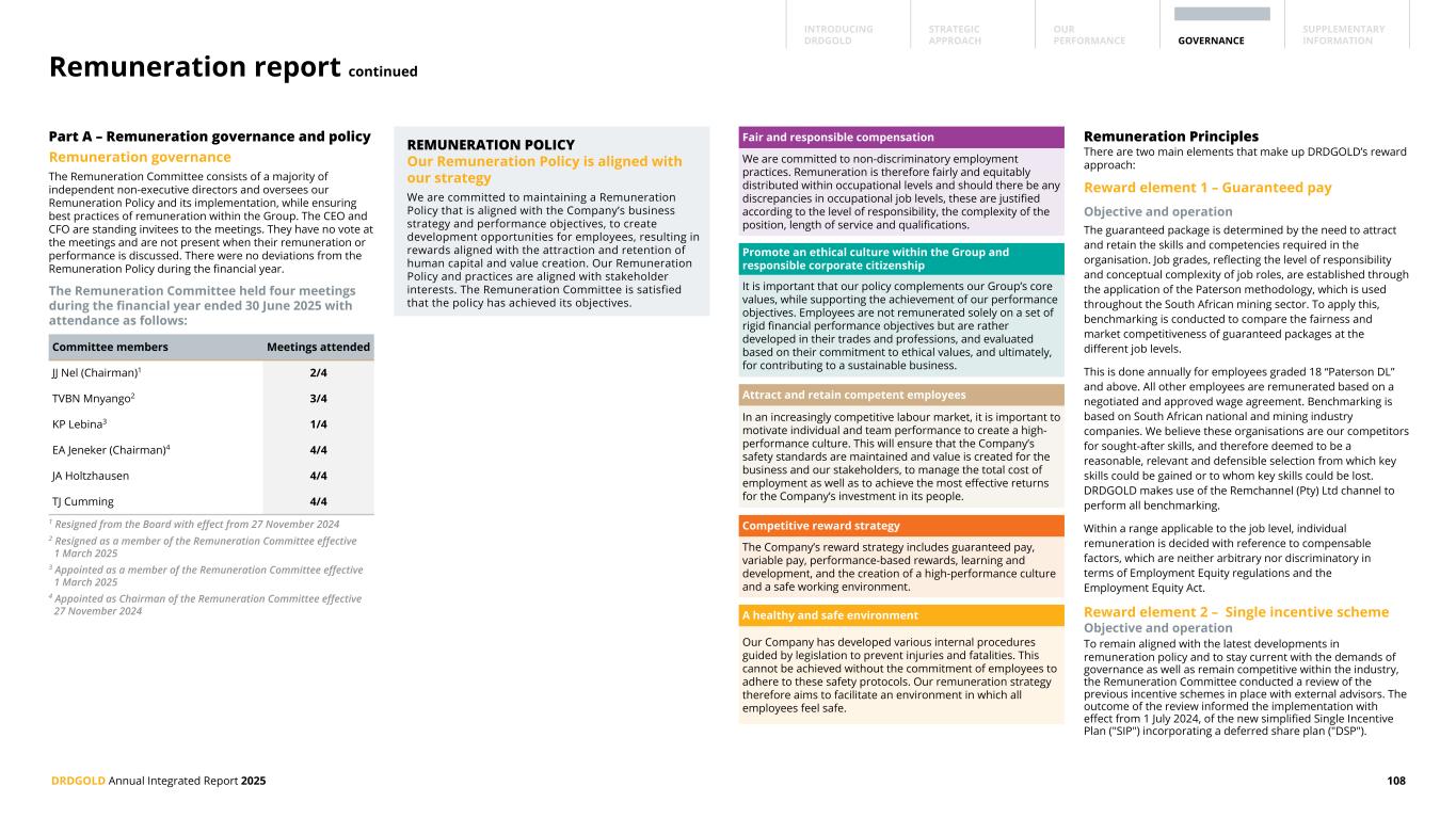Part A – Remuneration governance and policy Remuneration governance The Remuneration Committee consists of a majority of independent non-executive directors and oversees our Remuneration Policy and its implementation, while ensuring best practices of remuneration within the Group. The CEO and CFO are standing invitees to the meetings. They have no vote at the meetings and are not present when their remuneration or performance is discussed. There were no deviations from the Remuneration Policy during the financial year. The Remuneration Committee held four meetings during the financial year ended 30 June 2025 with attendance as follows: Committee members Meetings attended JJ Nel (Chairman)1 2/4 TVBN Mnyango2 3/4 KP Lebina3 1/4 EA Jeneker (Chairman)4 4/4 JA Holtzhausen 4/4 TJ Cumming 4/4 1 Resigned from the Board with effect from 27 November 2024 2 Resigned as a member of the Remuneration Committee effective 1 March 2025 3 Appointed as a member of the Remuneration Committee effective 1 March 2025 4 Appointed as Chairman of the Remuneration Committee effective 27 November 2024 REMUNERATION POLICY Our Remuneration Policy is aligned with our strategy We are committed to maintaining a Remuneration Policy that is aligned with the Company’s business strategy and performance objectives, to create development opportunities for employees, resulting in rewards aligned with the attraction and retention of human capital and value creation. Our Remuneration Policy and practices are aligned with stakeholder interests. The Remuneration Committee is satisfied that the policy has achieved its objectives. Fair and responsible compensation We are committed to non-discriminatory employment practices. Remuneration is therefore fairly and equitably distributed within occupational levels and should there be any discrepancies in occupational job levels, these are justified according to the level of responsibility, the complexity of the position, length of service and qualifications. Promote an ethical culture within the Group and responsible corporate citizenship It is important that our policy complements our Group’s core values, while supporting the achievement of our performance objectives. Employees are not remunerated solely on a set of rigid financial performance objectives but are rather developed in their trades and professions, and evaluated based on their commitment to ethical values, and ultimately, for contributing to a sustainable business. Attract and retain competent employees In an increasingly competitive labour market, it is important to motivate individual and team performance to create a high- performance culture. This will ensure that the Company’s safety standards are maintained and value is created for the business and our stakeholders, to manage the total cost of employment as well as to achieve the most effective returns for the Company’s investment in its people. Competitive reward strategy The Company’s reward strategy includes guaranteed pay, variable pay, performance-based rewards, learning and development, and the creation of a high-performance culture and a safe working environment. A healthy and safe environment Our Company has developed various internal procedures guided by legislation to prevent injuries and fatalities. This cannot be achieved without the commitment of employees to adhere to these safety protocols. Our remuneration strategy therefore aims to facilitate an environment in which all employees feel safe. Remuneration Principles There are two main elements that make up DRDGOLD’s reward approach: Reward element 1 – Guaranteed pay Objective and operation The guaranteed package is determined by the need to attract and retain the skills and competencies required in the organisation. Job grades, reflecting the level of responsibility and conceptual complexity of job roles, are established through the application of the Paterson methodology, which is used throughout the South African mining sector. To apply this, benchmarking is conducted to compare the fairness and market competitiveness of guaranteed packages at the different job levels. This is done annually for employees graded 18 “Paterson DL” and above. All other employees are remunerated based on a negotiated and approved wage agreement. Benchmarking is based on South African national and mining industry companies. We believe these organisations are our competitors for sought-after skills, and therefore deemed to be a reasonable, relevant and defensible selection from which key skills could be gained or to whom key skills could be lost. DRDGOLD makes use of the Remchannel (Pty) Ltd channel to perform all benchmarking. Within a range applicable to the job level, individual remuneration is decided with reference to compensable factors, which are neither arbitrary nor discriminatory in terms of Employment Equity regulations and the Employment Equity Act. Reward element 2 – Single incentive scheme Objective and operation To remain aligned with the latest developments in remuneration policy and to stay current with the demands of governance as well as remain competitive within the industry, the Remuneration Committee conducted a review of the previous incentive schemes in place with external advisors. The outcome of the review informed the implementation with effect from 1 July 2024, of the new simplified Single Incentive Plan ("SIP") incorporating a deferred share plan ("DSP"). INTRODUCING DRDGOLD STRATEGIC APPROACH OUR PERFORMANCE GOVERNANCE SUPPLEMENTARY INFORMATION Remuneration report continued DRDGOLD Annual Integrated Report 2025 108