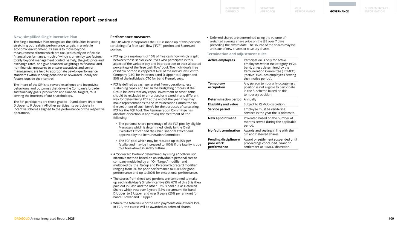 New, simplified Single Incentive Plan The Single Incentive Plan recognises the difficulties in setting stretching but realistic performance targets in a volatile economic environment. Its aim is to move beyond measurement criteria which are focused chiefly on inflexible financial performance, much of which is driven by two factors totally beyond management control namely, the gold price and exchange rates, and give balanced weightings to financial and non-financial measures to ensure executives and senior management are held to appropriate pay-for-performance standards without being penalised or rewarded unduly for factors outside their control. The intent of the SIP is to reward excellence and incentivise behaviours and outcomes that drive the Company's broader sustainability goals, production and financial targets, thus serving the interests of our shareholders. The SIP participants are those graded 19 and above (Paterson D Upper to F Upper). All other participants participate in incentive schemes aligned to the performance of the respective operations. Performance measures The SIP which incorporates the DSP is made up of two portions consisting of a Free cash flow ("FCF") portion and Scorecard portion. • FCF up to a maximum of 10% of free cash flow which is split between those senior executives who participate in this aspect of the variable pay and in proportion to their allocated percentage of the 'free cash flow' pool. The individual’s free cashflow portion is capped at 67% of the individuals Cost to Company (CTC) for Paterson band D Upper to E Upper and 50% of the individuals CTC for band F employees. • FCF is defined as cash generated from operations, less sustaining capex and tax. In the budgeting process, if the Group believes that any capex, investment or other items should be excluded or amortised or treated in any different way for determining FCF at the end of the year, they may make representations to the Remuneration Committee on the treatment of such item/s for the purposes of calculating FCF for the FCF Pool. The Remuneration Committee has absolute discretion in approving the treatment of the following: • The personal share percentage of the FCF pool by eligible Managers which is determined jointly by the Chief Executive Officer and the Chief Financial Officer and approved by the Remuneration Committee • The FCF pool which may be reduced up to 25% per fatality and may be increased to 100% if the fatality is due to a breakdown in safety culture. • A “Scorecard Portion” determined by using a “bottom up” incentive method based on an individual’s personal cost to company multiplied by an “On-Target” modifier and multiplied by the Group and Personal Scorecard modifier ranging from 0% for poor performance to 100% for good performance and up to 200% for exceptional performance. • The scores from these two portions are combined to make up each individual’s Single Incentive (SI). 67% of this SI is then paid out in Cash and the other 33% is paid out as Deferred Shares which vest over 3 years (33% per annum) for band D Upper to E Upper and over 5 years (20% per annum) for band F Lower and F Upper. • Where the total value of the cash payments due exceed 15% of FCF, the excess will be awarded as deferred shares. • Deferred shares are determined using the volume of weighted average share price on the JSE over 7 days preceding the award date. The source of the shares may be an issue of new shares or treasury shares. Termination and adjustment rules Active employees Participation is only for active employees within the category 19-26 band, unless determined by the Remuneration Committee ( REMCO) (“active” excludes employees serving their notice period). Temporary occupation Any person temporarily occupying a position is not eligible to participate in the SI scheme based on this temporary position. Determination period Annually Eligibility and value Subject to REMCO discretion. Service period Employee must be rendering services in the year the SI relates to. New appointment Pro-rated based on the number of months served during the applicable period. No-fault termination Awards and vesting in line with the SIP and Deferred shares. Pending disciplinary/ poor work performance Award or settlement suspended until proceedings concluded. Grant or settlement at REMCO discretion. INTRODUCING DRDGOLD STRATEGIC APPROACH OUR PERFORMANCE GOVERNANCE SUPPLEMENTARY INFORMATION Remuneration report continued DRDGOLD Annual Integrated Report 2025 109