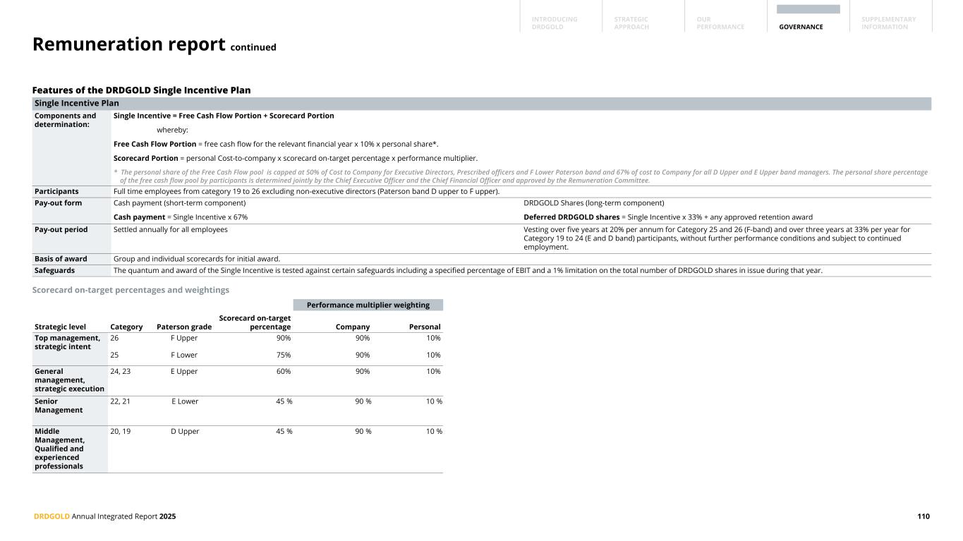Features of the DRDGOLD Single Incentive Plan Single Incentive Plan Components and determination: Single Incentive = Free Cash Flow Portion + Scorecard Portion whereby: Free Cash Flow Portion = free cash flow for the relevant financial year x 10% x personal share*. Scorecard Portion = personal Cost-to-company x scorecard on-target percentage x performance multiplier. * The personal share of the Free Cash Flow pool is capped at 50% of Cost to Company for Executive Directors, Prescribed officers and F Lower Paterson band and 67% of cost to Company for all D Upper and E Upper band managers. The personal share percentage of the free cash flow pool by participants is determined jointly by the Chief Executive Officer and the Chief Financial Officer and approved by the Remuneration Committee. Participants Full time employees from category 19 to 26 excluding non-executive directors (Paterson band D upper to F upper). Pay-out form Cash payment (short-term component) Cash payment = Single Incentive x 67% DRDGOLD Shares (long-term component) Deferred DRDGOLD shares = Single Incentive x 33% + any approved retention award Pay-out period Settled annually for all employees Vesting over five years at 20% per annum for Category 25 and 26 (F-band) and over three years at 33% per year for Category 19 to 24 (E and D band) participants, without further performance conditions and subject to continued employment. Basis of award Group and individual scorecards for initial award. Safeguards The quantum and award of the Single Incentive is tested against certain safeguards including a specified percentage of EBIT and a 1% limitation on the total number of DRDGOLD shares in issue during that year. Scorecard on-target percentages and weightings Strategic level Category Scorecard on-target percentage Performance multiplier weighting Paterson grade Company Personal Top management, strategic intent 26 F Upper 90% 90% 10% 25 F Lower 75% 90% 10% General management, strategic execution 24, 23 E Upper 60% 90% 10% Senior Management 22, 21 E Lower 45 % 90 % 10 % Middle Management, Qualified and experienced professionals 20, 19 D Upper 45 % 90 % 10 % INTRODUCING DRDGOLD STRATEGIC APPROACH OUR PERFORMANCE GOVERNANCE SUPPLEMENTARY INFORMATION Remuneration report continued DRDGOLD Annual Integrated Report 2025 110