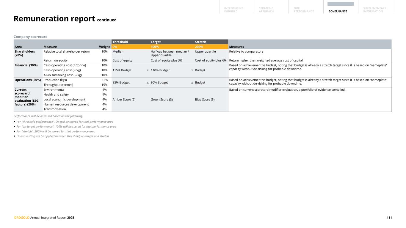 Company scorecard Area Measure Weight Threshold Target Stretch Measures0% 100% 200% Shareholders (20%) Relative total shareholder return 10% Median Halfway between median / Upper quartile Upper quartile Relative to comparators Return on equity 10% Cost of equity Cost of equity plus 3% Cost of equity plus 6% Return higher than weighted average cost of capital Financial (30%) Cash operating cost (R/tonne) 10% 115% Budget x 110% Budget x Budget Based on achievement vs budget, noting that budget is already a stretch target since it is based on “nameplate” capacity without de-risking for probable downtime.Cash operating cost (R/kg) 10% All-in sustaining cost (R/kg) 10% Operations (30%) Production (kgs) 15% 85% Budget x 90% Budget x Budget Based on achievement vs budget, noting that budget is already a stretch target since it is based on “nameplate” capacity without de-risking for probable downtime.Throughput (tonnes) 15% Current scorecard modifier evaluation (ESG factors) (20%) Environmental 4% Amber Score (2) Green Score (3) Blue Score (5) Based on current scorecard modifier evaluation, a portfolio of evidence compiled. Health and safety 4% Local economic development 4% Human resources development 4% Transformation 4% Performance will be assessed based on the following: • For "threshold performance", 0% will be scored for that performance area • For "on-target performance", 100% will be scored for that performance area • For "stretch", 200% will be scored for that performance area • Linear vesting will be applied between threshold, on-target and stretch INTRODUCING DRDGOLD STRATEGIC APPROACH OUR PERFORMANCE GOVERNANCE SUPPLEMENTARY INFORMATION Remuneration report continued DRDGOLD Annual Integrated Report 2025 111