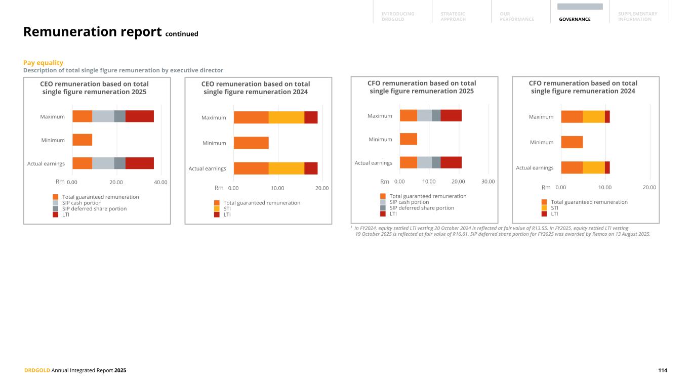 Pay equality Description of total single figure remuneration by executive director CEO remuneration based on total single figure remuneration 2025 Total guaranteed remuneration SIP cash portion SIP deferred share portion LTI 0.00 20.00 40.00 Maximum Minimum Actual earnings CEO remuneration based on total single figure remuneration 2024 Total guaranteed remuneration STI LTI 0.00 10.00 20.00 Maximum Minimum Actual earnings CFO remuneration based on total single figure remuneration 2025 Total guaranteed remuneration SIP cash portion SIP deferred share portion LTI 0.00 10.00 20.00 30.00 Maximum Minimum Actual earnings CFO remuneration based on total single figure remuneration 2024 Total guaranteed remuneration STI LTI 0.00 10.00 20.00 Maximum Minimum Actual earnings 1 In FY2024, equity settled LTI vesting 20 October 2024 is reflected at fair value of R13.55. In FY2025, equity settled LTI vesting 19 October 2025 is reflected at fair value of R16.61. SIP deferred share portion for FY2025 was awarded by Remco on 13 August 2025. INTRODUCING DRDGOLD STRATEGIC APPROACH OUR PERFORMANCE GOVERNANCE SUPPLEMENTARY INFORMATION Remuneration report continued DRDGOLD Annual Integrated Report 2025 114 Rm Rm Rm Rm