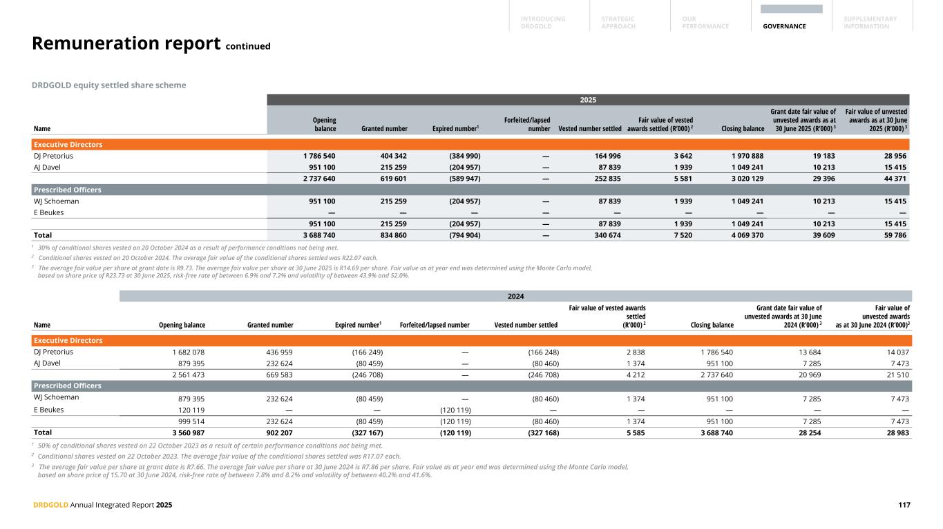 DRDGOLD equity settled share scheme 2025 Name Opening balance Granted number Expired number1 Forfeited/lapsed number Vested number settled Fair value of vested awards settled (R’000) 2 Closing balance Grant date fair value of unvested awards as at 30 June 2025 (R’000) 3 Fair value of unvested awards as at 30 June 2025 (R’000) 3 Executive Directors DJ Pretorius 1 786 540 404 342 (384 990) — 164 996 3 642 1 970 888 19 183 28 956 AJ Davel 951 100 215 259 (204 957) — 87 839 1 939 1 049 241 10 213 15 415 2 737 640 619 601 (589 947) — 252 835 5 581 3 020 129 29 396 44 371 Prescribed Officers WJ Schoeman 951 100 215 259 (204 957) — 87 839 1 939 1 049 241 10 213 15 415 E Beukes — — — — — — — — — 951 100 215 259 (204 957) — 87 839 1 939 1 049 241 10 213 15 415 Total 3 688 740 834 860 (794 904) — 340 674 7 520 4 069 370 39 609 59 786 1 30% of conditional shares vested on 20 October 2024 as a result of performance conditions not being met. 2 Conditional shares vested on 20 October 2024. The average fair value of the conditional shares settled was R22.07 each. 3 The average fair value per share at grant date is R9.73. The average fair value per share at 30 June 2025 is R14.69 per share. Fair value as at year end was determined using the Monte Carlo model, based on share price of R23.73 at 30 June 2025, risk-free rate of between 6.9% and 7.2% and volatility of between 43.9% and 52.0%. 2024 Name Opening balance Granted number Expired number1 Forfeited/lapsed number Vested number settled Fair value of vested awards settled (R’000) 2 Closing balance Grant date fair value of unvested awards at 30 June 2024 (R’000) 3 Fair value of unvested awards as at 30 June 2024 (R’000)3 Executive Directors DJ Pretorius 1 682 078 436 959 (166 249) — (166 248) 2 838 1 786 540 13 684 14 037 AJ Davel 879 395 232 624 (80 459) — (80 460) 1 374 951 100 7 285 7 473 2 561 473 669 583 (246 708) — (246 708) 4 212 2 737 640 20 969 21 510 Prescribed Officers WJ Schoeman 879 395 232 624 (80 459) — (80 460) 1 374 951 100 7 285 7 473 E Beukes 120 119 — — (120 119) — — — — — 999 514 232 624 (80 459) (120 119) (80 460) 1 374 951 100 7 285 7 473 Total 3 560 987 902 207 (327 167) (120 119) (327 168) 5 585 3 688 740 28 254 28 983 1 50% of conditional shares vested on 22 October 2023 as a result of certain performance conditions not being met. 2 Conditional shares vested on 22 October 2023. The average fair value of the conditional shares settled was R17.07 each. 3 The average fair value per share at grant date is R7.66. The average fair value per share at 30 June 2024 is R7.86 per share. Fair value as at year end was determined using the Monte Carlo model, based on share price of 15.70 at 30 June 2024, risk-free rate of between 7.8% and 8.2% and volatility of between 40.2% and 41.6%. INTRODUCING DRDGOLD STRATEGIC APPROACH OUR PERFORMANCE GOVERNANCE SUPPLEMENTARY INFORMATION Remuneration report continued DRDGOLD Annual Integrated Report 2025 117