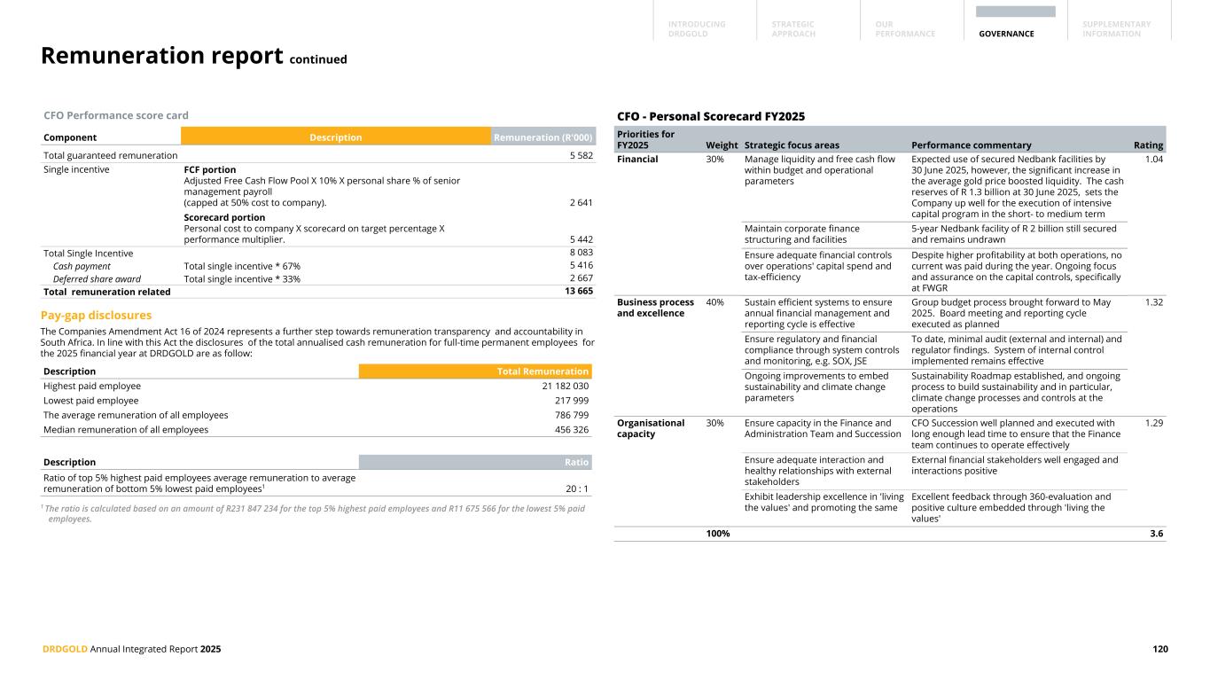 CFO Performance score card Component Description Remuneration (R'000) Total guaranteed remuneration 5 582 Single incentive FCF portion Adjusted Free Cash Flow Pool X 10% X personal share % of senior management payroll (capped at 50% cost to company). 2 641 Scorecard portion Personal cost to company X scorecard on target percentage X performance multiplier. 5 442 Total Single Incentive 8 083 Cash payment Total single incentive * 67% 5 416 Deferred share award Total single incentive * 33% 2 667 Total remuneration related 13 665 Pay-gap disclosures The Companies Amendment Act 16 of 2024 represents a further step towards remuneration transparency and accountability in South Africa. In line with this Act the disclosures of the total annualised cash remuneration for full-time permanent employees for the 2025 financial year at DRDGOLD are as follow: Description Total Remuneration Highest paid employee 21 182 030 Lowest paid employee 217 999 The average remuneration of all employees 786 799 Median remuneration of all employees 456 326 Description Ratio Ratio of top 5% highest paid employees average remuneration to average remuneration of bottom 5% lowest paid employees1 20 : 1 1 The ratio is calculated based on an amount of R231 847 234 for the top 5% highest paid employees and R11 675 566 for the lowest 5% paid employees. CFO - Personal Scorecard FY2025 Priorities for FY2025 Weight Strategic focus areas Performance commentary Rating Financial 30% Manage liquidity and free cash flow within budget and operational parameters Expected use of secured Nedbank facilities by 30 June 2025, however, the significant increase in the average gold price boosted liquidity. The cash reserves of R 1.3 billion at 30 June 2025, sets the Company up well for the execution of intensive capital program in the short- to medium term 1.04 Maintain corporate finance structuring and facilities 5-year Nedbank facility of R 2 billion still secured and remains undrawn Ensure adequate financial controls over operations' capital spend and tax-efficiency Despite higher profitability at both operations, no current was paid during the year. Ongoing focus and assurance on the capital controls, specifically at FWGR Business process and excellence 40% Sustain efficient systems to ensure annual financial management and reporting cycle is effective Group budget process brought forward to May 2025. Board meeting and reporting cycle executed as planned 1.32 Ensure regulatory and financial compliance through system controls and monitoring, e.g. SOX, JSE To date, minimal audit (external and internal) and regulator findings. System of internal control implemented remains effective Ongoing improvements to embed sustainability and climate change parameters Sustainability Roadmap established, and ongoing process to build sustainability and in particular, climate change processes and controls at the operations Organisational capacity 30% Ensure capacity in the Finance and Administration Team and Succession CFO Succession well planned and executed with long enough lead time to ensure that the Finance team continues to operate effectively 1.29 Ensure adequate interaction and healthy relationships with external stakeholders External financial stakeholders well engaged and interactions positive Exhibit leadership excellence in 'living the values' and promoting the same Excellent feedback through 360-evaluation and positive culture embedded through 'living the values' 100% 3.6 INTRODUCING DRDGOLD STRATEGIC APPROACH OUR PERFORMANCE GOVERNANCE SUPPLEMENTARY INFORMATION Remuneration report continued DRDGOLD Annual Integrated Report 2025 120