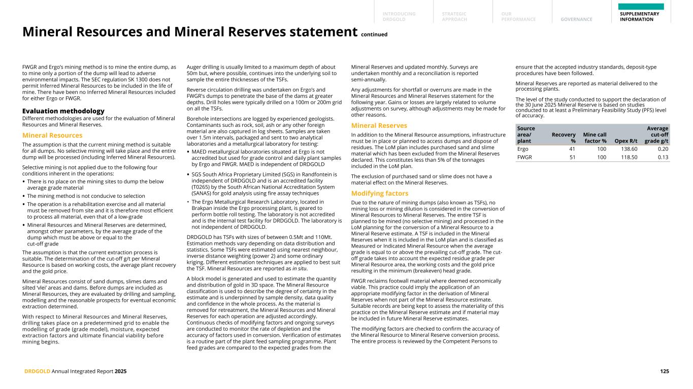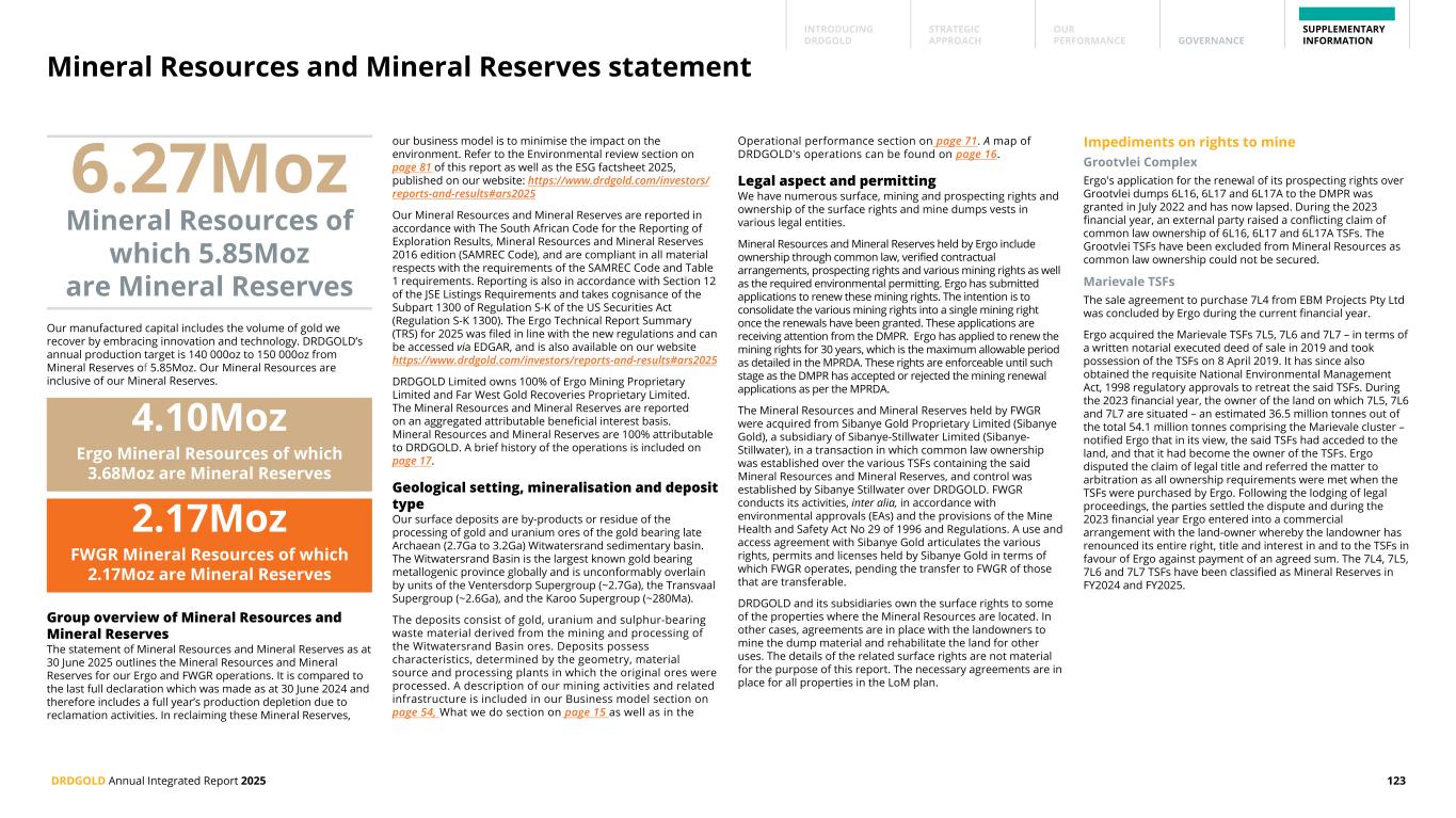 6.27Moz Mineral Resources of which 5.85Moz are Mineral Reserves Our manufactured capital includes the volume of gold we recover by embracing innovation and technology. DRDGOLD’s annual production target is 140 000oz to 150 000oz from Mineral Reserves of 5.85Moz. Our Mineral Resources are inclusive of our Mineral Reserves. 4.10Moz Ergo Mineral Resources of which 3.68Moz are Mineral Reserves 2.17Moz FWGR Mineral Resources of which 2.17Moz are Mineral Reserves Group overview of Mineral Resources and Mineral Reserves The statement of Mineral Resources and Mineral Reserves as at 30 June 2025 outlines the Mineral Resources and Mineral Reserves for our Ergo and FWGR operations. It is compared to the last full declaration which was made as at 30 June 2024 and therefore includes a full year’s production depletion due to reclamation activities. In reclaiming these Mineral Reserves, our business model is to minimise the impact on the environment. Refer to the Environmental review section on page 81 of this report as well as the ESG factsheet 2025, published on our website: https://www.drdgold.com/investors/ reports-and-results#ars2025 Our Mineral Resources and Mineral Reserves are reported in accordance with The South African Code for the Reporting of Exploration Results, Mineral Resources and Mineral Reserves 2016 edition (SAMREC Code), and are compliant in all material respects with the requirements of the SAMREC Code and Table 1 requirements. Reporting is also in accordance with Section 12 of the JSE Listings Requirements and takes cognisance of the Subpart 1300 of Regulation S-K of the US Securities Act (Regulation S-K 1300). The Ergo Technical Report Summary (TRS) for 2025 was filed in line with the new regulations and can be accessed via EDGAR, and is also available on our website https://www.drdgold.com/investors/reports-and-results#ars2025 DRDGOLD Limited owns 100% of Ergo Mining Proprietary Limited and Far West Gold Recoveries Proprietary Limited. The Mineral Resources and Mineral Reserves are reported on an aggregated attributable beneficial interest basis. Mineral Resources and Mineral Reserves are 100% attributable to DRDGOLD. A brief history of the operations is included on page 17. Geological setting, mineralisation and deposit type Our surface deposits are by-products or residue of the processing of gold and uranium ores of the gold bearing late Archaean (2.7Ga to 3.2Ga) Witwatersrand sedimentary basin. The Witwatersrand Basin is the largest known gold bearing metallogenic province globally and is unconformably overlain by units of the Ventersdorp Supergroup (~2.7Ga), the Transvaal Supergroup (~2.6Ga), and the Karoo Supergroup (~280Ma). The deposits consist of gold, uranium and sulphur-bearing waste material derived from the mining and processing of the Witwatersrand Basin ores. Deposits possess characteristics, determined by the geometry, material source and processing plants in which the original ores were processed. A description of our mining activities and related infrastructure is included in our Business model section on page 54, What we do section on page 15 as well as in the Operational performance section on page 71. A map of DRDGOLD's operations can be found on page 16. Legal aspect and permitting We have numerous surface, mining and prospecting rights and ownership of the surface rights and mine dumps vests in various legal entities. Mineral Resources and Mineral Reserves held by Ergo include ownership through common law, verified contractual arrangements, prospecting rights and various mining rights as well as the required environmental permitting. Ergo has submitted applications to renew these mining rights. The intention is to consolidate the various mining rights into a single mining right once the renewals have been granted. These applications are receiving attention from the DMPR. Ergo has applied to renew the mining rights for 30 years, which is the maximum allowable period as detailed in the MPRDA. These rights are enforceable until such stage as the DMPR has accepted or rejected the mining renewal applications as per the MPRDA. The Mineral Resources and Mineral Reserves held by FWGR were acquired from Sibanye Gold Proprietary Limited (Sibanye Gold), a subsidiary of Sibanye-Stillwater Limited (Sibanye- Stillwater), in a transaction in which common law ownership was established over the various TSFs containing the said Mineral Resources and Mineral Reserves, and control was established by Sibanye Stillwater over DRDGOLD. FWGR conducts its activities, inter alia, in accordance with environmental approvals (EAs) and the provisions of the Mine Health and Safety Act No 29 of 1996 and Regulations. A use and access agreement with Sibanye Gold articulates the various rights, permits and licenses held by Sibanye Gold in terms of which FWGR operates, pending the transfer to FWGR of those that are transferable. DRDGOLD and its subsidiaries own the surface rights to some of the properties where the Mineral Resources are located. In other cases, agreements are in place with the landowners to mine the dump material and rehabilitate the land for other uses. The details of the related surface rights are not material for the purpose of this report. The necessary agreements are in place for all properties in the LoM plan. Impediments on rights to mine Grootvlei Complex Ergo's application for the renewal of its prospecting rights over Grootvlei dumps 6L16, 6L17 and 6L17A to the DMPR was granted in July 2022 and has now lapsed. During the 2023 financial year, an external party raised a conflicting claim of common law ownership of 6L16, 6L17 and 6L17A TSFs. The Grootvlei TSFs have been excluded from Mineral Resources as common law ownership could not be secured. Marievale TSFs The sale agreement to purchase 7L4 from EBM Projects Pty Ltd was concluded by Ergo during the current financial year. Ergo acquired the Marievale TSFs 7L5, 7L6 and 7L7 – in terms of a written notarial exec