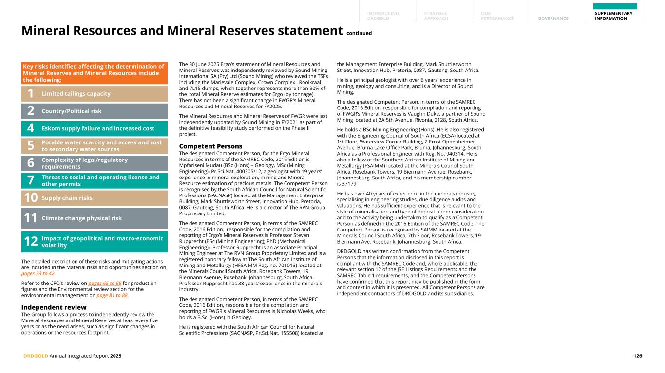 Key risks identified affecting the determination of Mineral Reserves and Mineral Resources include the following: 1 Limited tailings capacity 2 Country/Political risk 4 Eskom supply failure and increased cost 5 Potable water scarcity and access and cost to secondary water sources 6 Complexity of legal/regulatory requirements 7 Threat to social and operating license and other permits 10 Supply chain risks 11 Climate change physical risk 12 Impact of geopolitical and macro-economic volatility The detailed description of these risks and mitigating actions are included in the Material risks and opportunities section on pages 33 to 42. Refer to the CFO’s review on pages 65 to 68 for production figures and the Environmental review section for the environmental management on page 81 to 88. Independent review The Group follows a process to independently review the Mineral Resources and Mineral Reserves at least every five years or as the need arises, such as significant changes in operations or the resources footprint. The 30 June 2025 Ergo’s statement of Mineral Resources and Mineral Reserves was independently reviewed by Sound Mining International SA (Pty) Ltd (Sound Mining) who reviewed the TSFs including the Marievale Complex, Crown Complex , Rooikraal and 7L15 dumps, which together represents more than 90% of the total Mineral Reserve estimates for Ergo (by tonnage). There has not been a significant change in FWGR's Mineral Resources and Mineral Reserves for FY2025. The Mineral Resources and Mineral Reserves of FWGR were last independently updated by Sound Mining in FY2021 as part of the definitive feasibility study performed on the Phase II project. Competent Persons The designated Competent Person, for the Ergo Mineral Resources in terms of the SAMREC Code, 2016 Edition is Mpfariseni Mudau (BSc (Hons) – Geology, MSc (Mining Engineering)) Pr.Sci.Nat. 400305/12, a geologist with 19 years’ experience in mineral exploration, mining and Mineral Resource estimation of precious metals. The Competent Person is recognised by the South African Council for Natural Scientific Professions (SACNASP) located at the Management Enterprise Building, Mark Shuttleworth Street, Innovation Hub, Pretoria, 0087, Gauteng, South Africa. He is a director of The RVN Group Proprietary Limited. The designated Competent Person, in terms of the SAMREC Code, 2016 Edition, responsible for the compilation and reporting of Ergo’s Mineral Reserves is Professor Steven Rupprecht (BSc (Mining Engineering); PhD (Mechanical Engineering)). Professor Rupprecht is an associate Principal Mining Engineer at The RVN Group Proprietary Limited and is a registered honorary fellow at The South African Institute of Mining and Metallurgy (HFSAIMM Reg. no. 701013) located at the Minerals Council South Africa, Rosebank Towers, 19 Biermann Avenue, Rosebank, Johannesburg, South Africa. Professor Rupprecht has 38 years’ experience in the minerals industry. The designated Competent Person, in terms of the SAMREC Code, 2016 Edition, responsible for the compilation and reporting of FWGR's Mineral Resources is Nicholas Weeks, who holds a B.Sc. (Hons) in Geology. He is registered with the South African Council for Natural Scientific Professions (SACNASP, Pr.Sci.Nat. 155508) located at the Management Enterprise Building, Mark Shuttlesworth Street, Innovation Hub, Pretoria, 0087, Gauteng, South Africa. He is a principal geologist with over 6 years' experience in mining, geology and consulting, and is a Director of Sound Mining. The designated Competent Person, in terms of the SAMREC Code, 2016 Edition, responsible for compilation and reporting of FWGR’s Mineral Reserves is Vaughn Duke, a partner of Sound Mining located at 2A 5th Avenue, Rivonia, 2128, South Africa. He holds a BSc Mining Engineering (Hons). He is also registered with the Engineering Council of South Africa (ECSA) located at 1st Floor, Waterview Corner Building, 2 Ernst Oppenheimer Avenue, Bruma Lake Office Park, Bruma, Johannesburg, South Africa as a Professional Engineer with Reg. No. 940314. He is also a fellow of the Southern African Institute of Mining and Metallurgy (FSAIMM) located at the Minerals Council South Africa, Rosebank Towers, 19 Biermann Avenue, Rosebank, Johannesburg, South Africa, and his membership number is 37179. He has over 40 years of experience in the minerals industry, specialising in engineering studies, due diligence audits and valuations. He has sufficient experience that is relevant to the style of mineralisation and type of deposit under consideration and to the activity being undertaken to qualify as a Competent Person as defined in the 2016 Edition of the SAMREC Code. The Competent Person is recognised by SAIMM located at the Minerals Council South Africa, 7th Floor, Rosebank Towers, 19 Biermann Ave, Rosebank, Johannesburg, South Africa. DRDGOLD has written confirmation from the Competent Persons that the information disclosed in this report is compliant with the SAMREC Code and, where applicable, the relevant section 12 of the JSE Listings Requirements and the SAMREC Table 1 requirements, and the Competent Persons have confirmed that this report may be published in the form and context in which it is presented. All Competent Persons are independent contractors of DRDGOLD and its subsidiaries. INTRODUCING DRDGOLD STRATEGIC APPROACH OUR PERFORMANCE GOVERNANCE SUPPLEMENTARY INFORMATION Mineral Resources and Mineral Reserves statement continued DRDGOLD Annual Integrated Report 2025 126